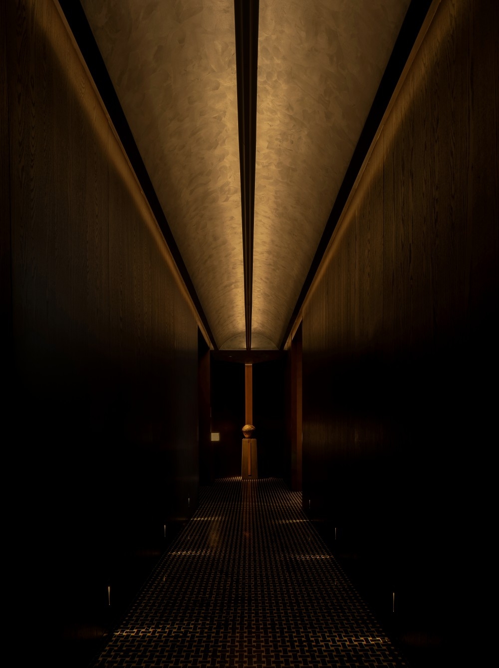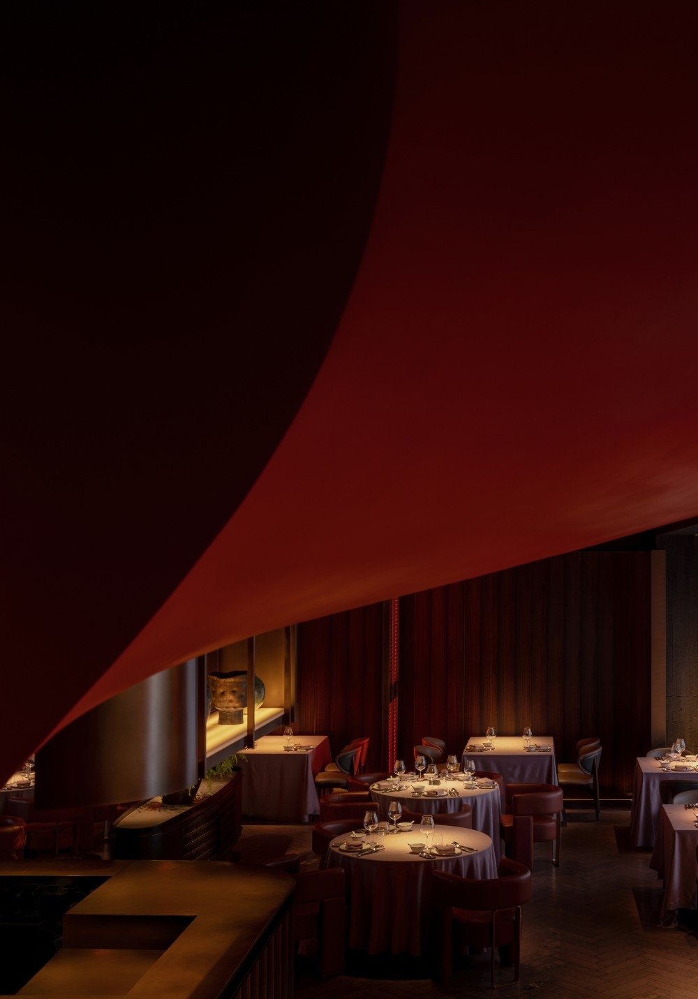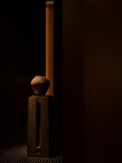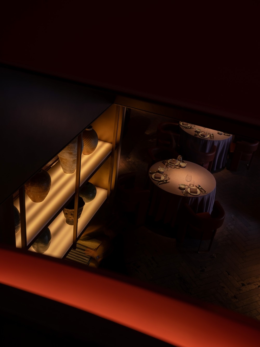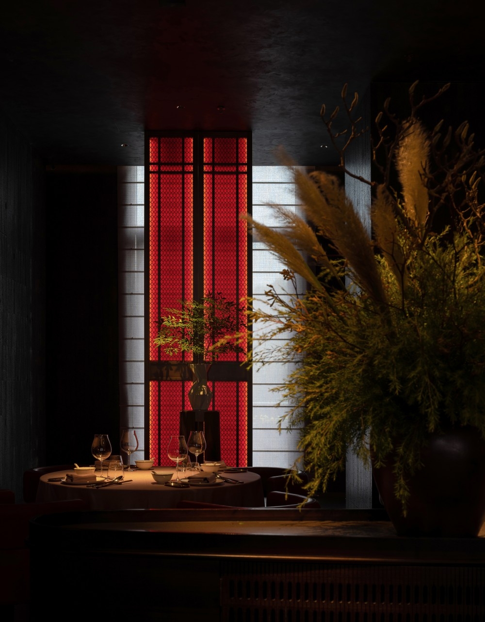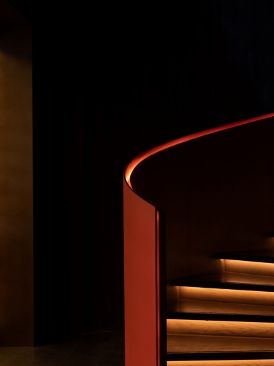 1. Urban Serenity: Nestled in bustling Pudong, the design contrasts external chaos with intentional darkness (50-80 lux), using matte grays/blacks to absorb glare. Strategic accents (red staircase, floral decor) are highlighted via directional projectors, creating depth without clutter.