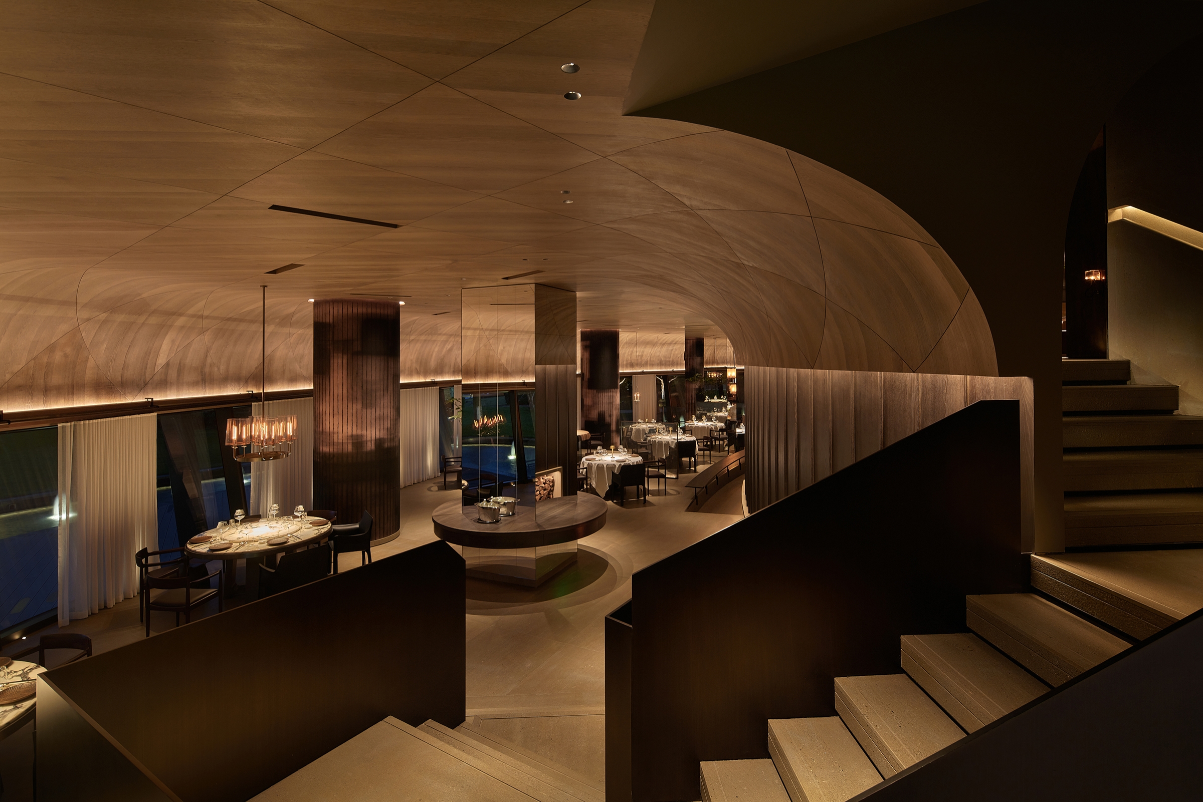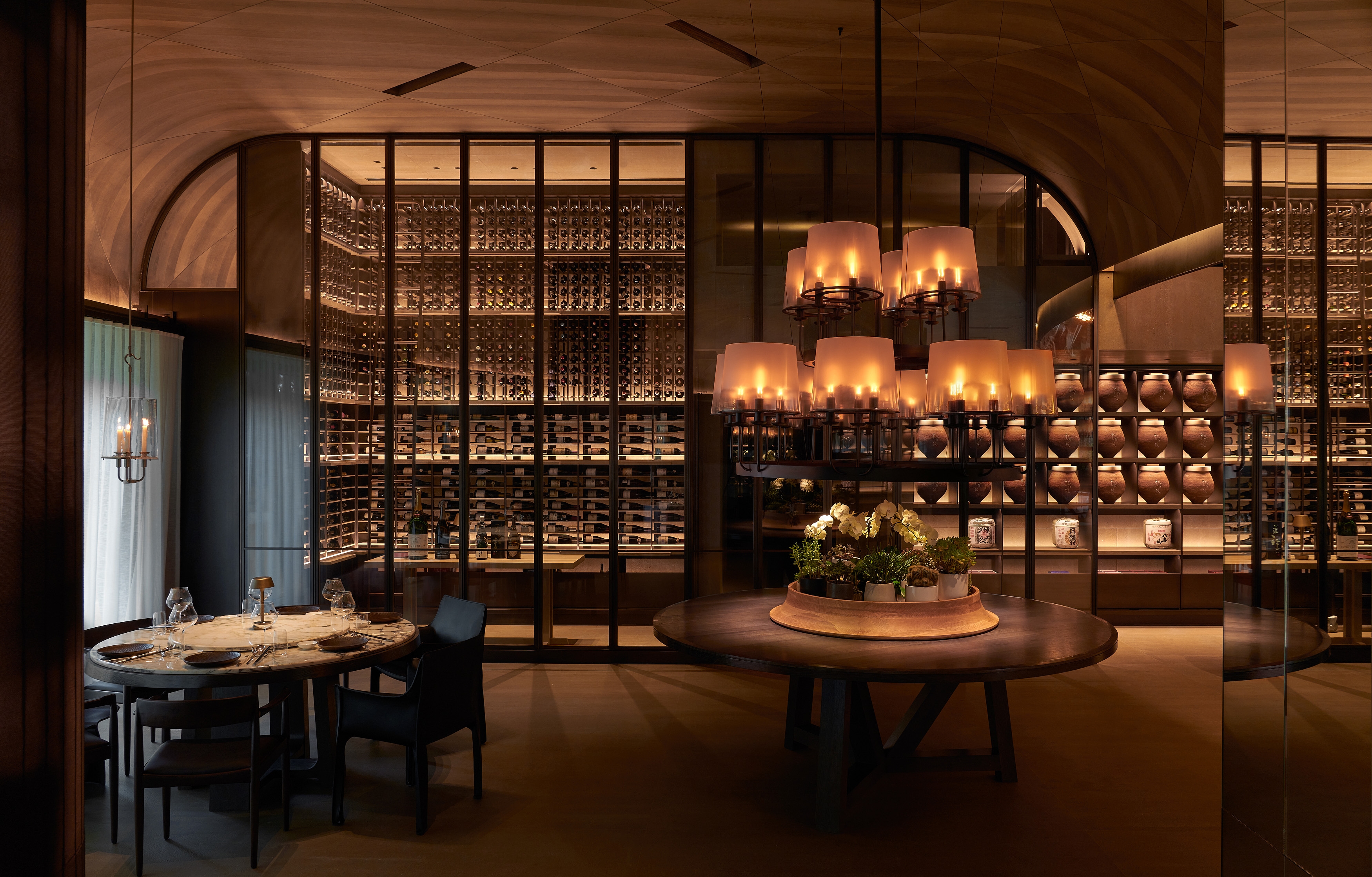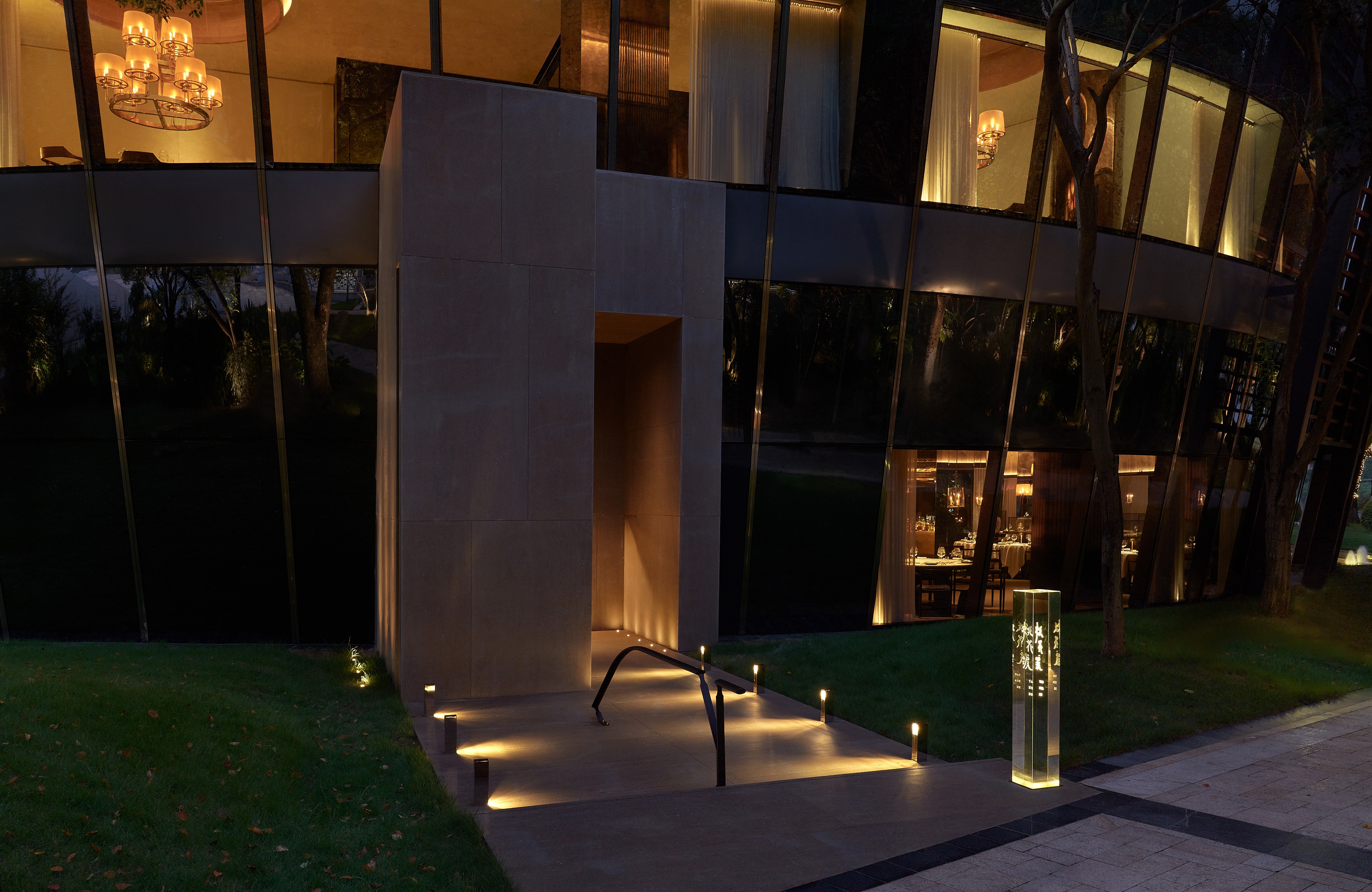 Entry DescriptionThe design description focuses on the atmosphere of a boutique restaurant and tea house. It highlights the journey through a narrow entrance illuminated by uplights, which leads to a grand atrium with arched ceilings. The lighting plays a significant role in enhancing the natural stone textures and creating a stunning contrast between light and shadow, contributing to a visually dramatic experience. The interior's design features minimal ceiling light fixtures, with strategic placement of recessed downlights, embedded lighting, and custom chandeliers to highlight both architectural and decorative details.
