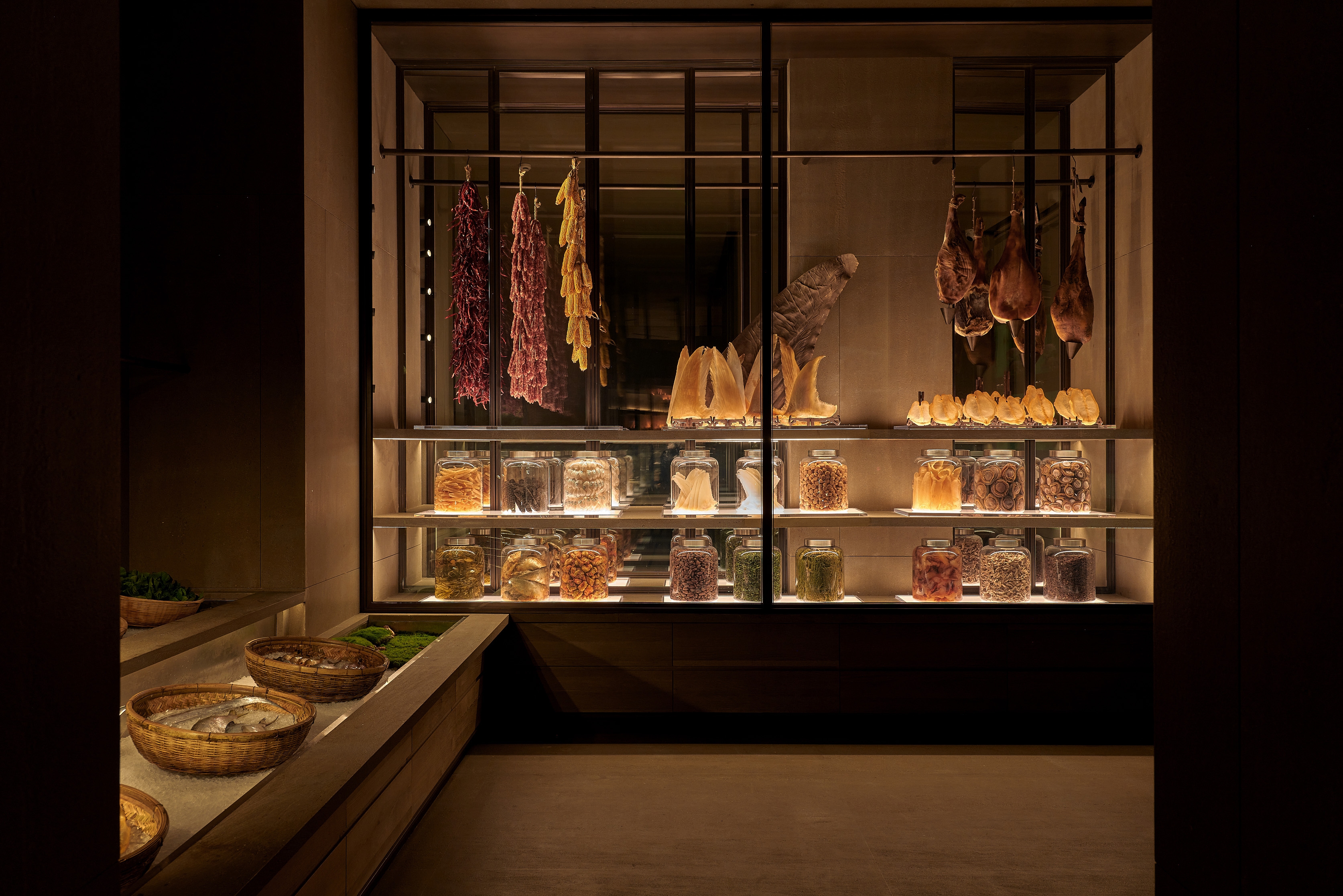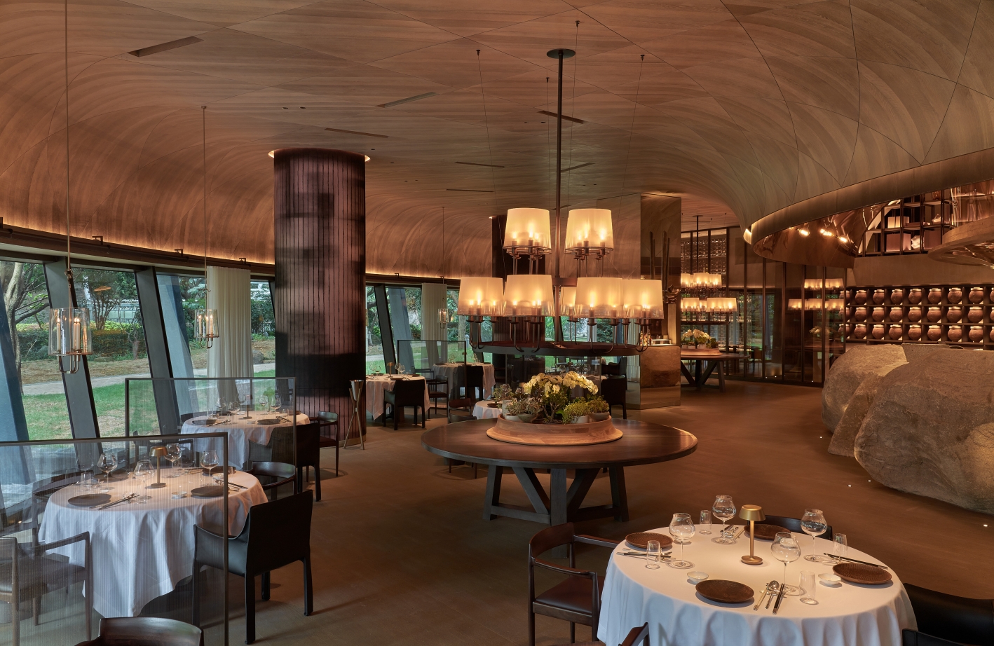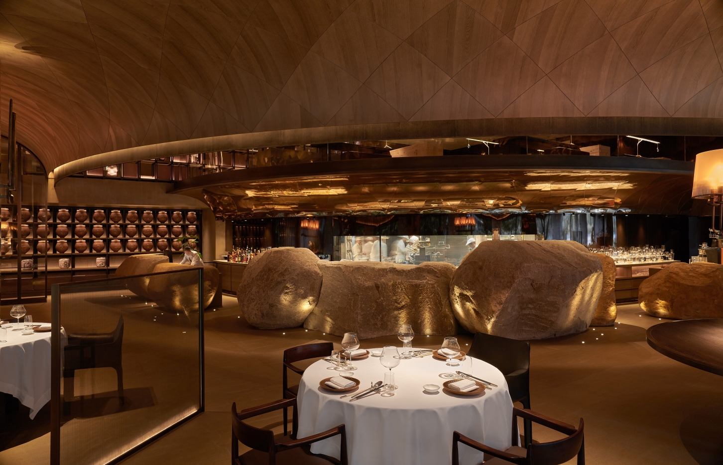 Entry DescriptionThe design description focuses on the atmosphere of a boutique restaurant and tea house. It highlights the journey through a narrow entrance illuminated by uplights, which leads to a grand atrium with arched ceilings. The lighting plays a significant role in enhancing the natural stone textures and creating a stunning contrast between light and shadow, contributing to a visually dramatic experience. The interior's design features minimal ceiling light fixtures, with strategic placement of recessed downlights, embedded lighting, and custom chandeliers to highlight both architectural and decorative details.