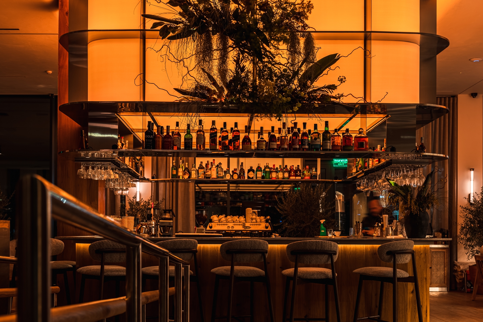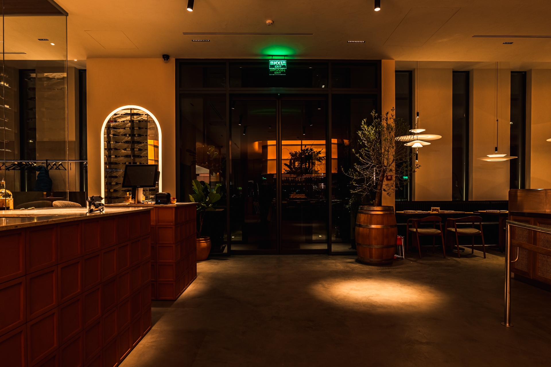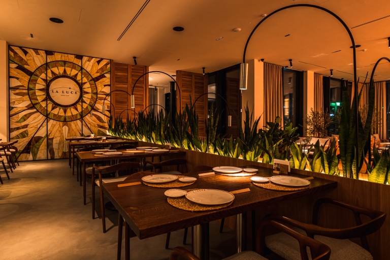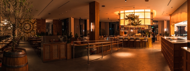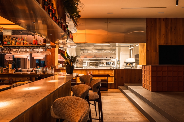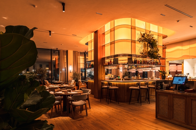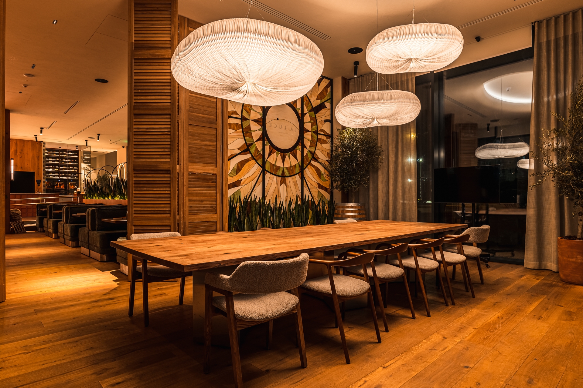 The central interior feature is a large interactive light fixture above the bar that mimics the sun. Its inner part radiates the warmth of sunlight, while the outer layer reflects the colors of the sky. Throughout the day, the fixture dynamically shifts its palette — from the soft glow of morning to the vivid hues of sunset, and finally to the gentle warmth of evening. Pendant lights in the dining area are synchronized with it, supporting the overall lighting rhythm.
