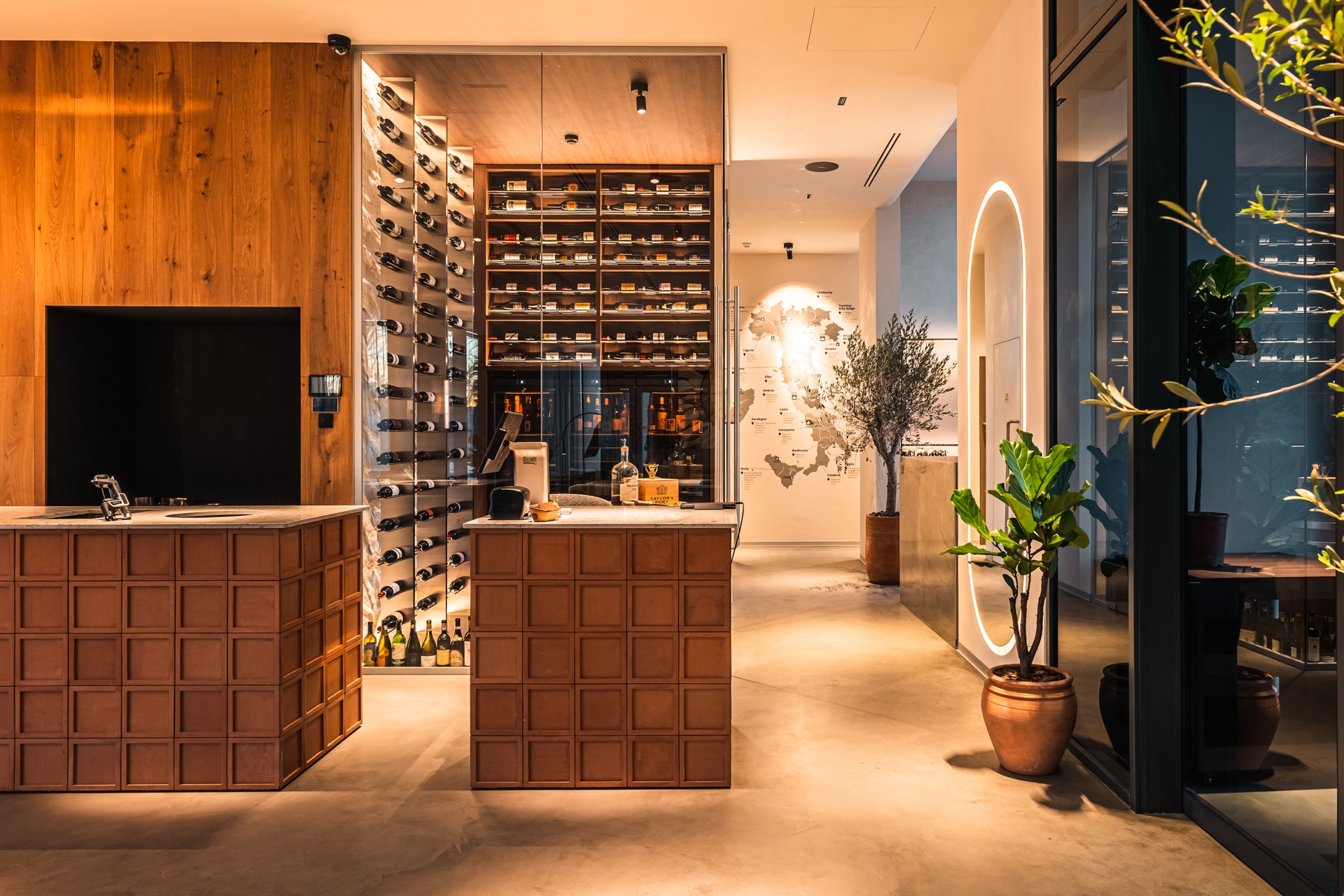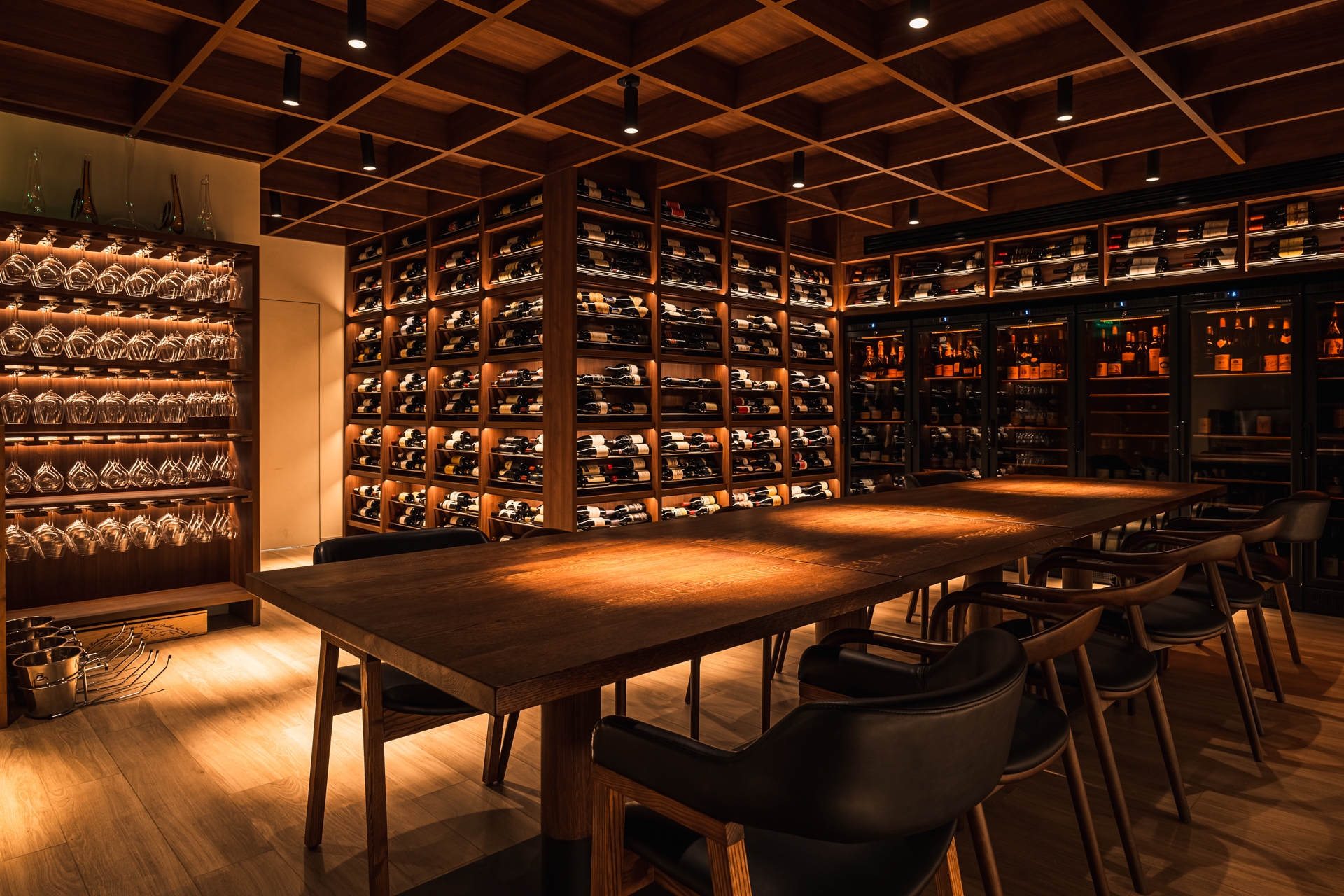 The wine display resembles an art installation. The lighting is selected to avoid harming the wine. Some bottles are placed on a textured rock surface, where light directed from above and below enhances the relief, adding depth and texture. Automation allows the lighting to be turned on only when needed.