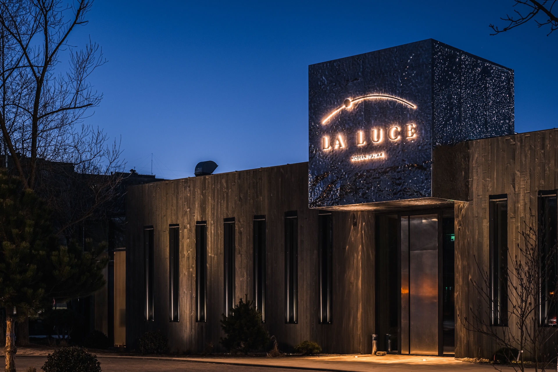 The facade is illuminated with two types of lighting: contour lighting for the window frames and volumetric lighting for the building itself. The lighting highlights the sides visible from Naukova Street and the lateral facades, while leaving the terrace unlit to preserve its cozy evening ambiance. The 3000K facade lighting contrasts with the interior, inviting guests in, and is coordinated with nearby buildings to maintain harmony in the urban environment.