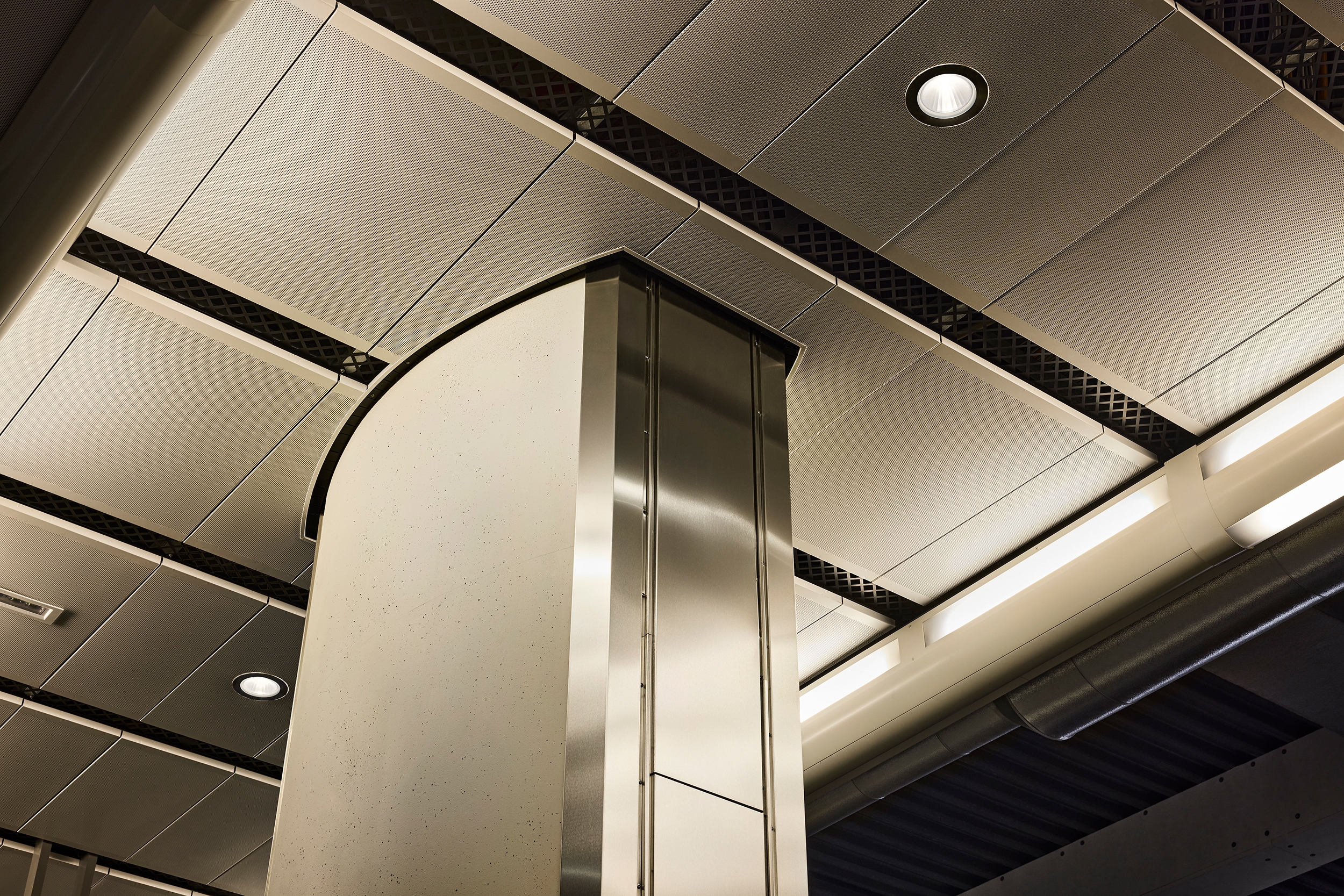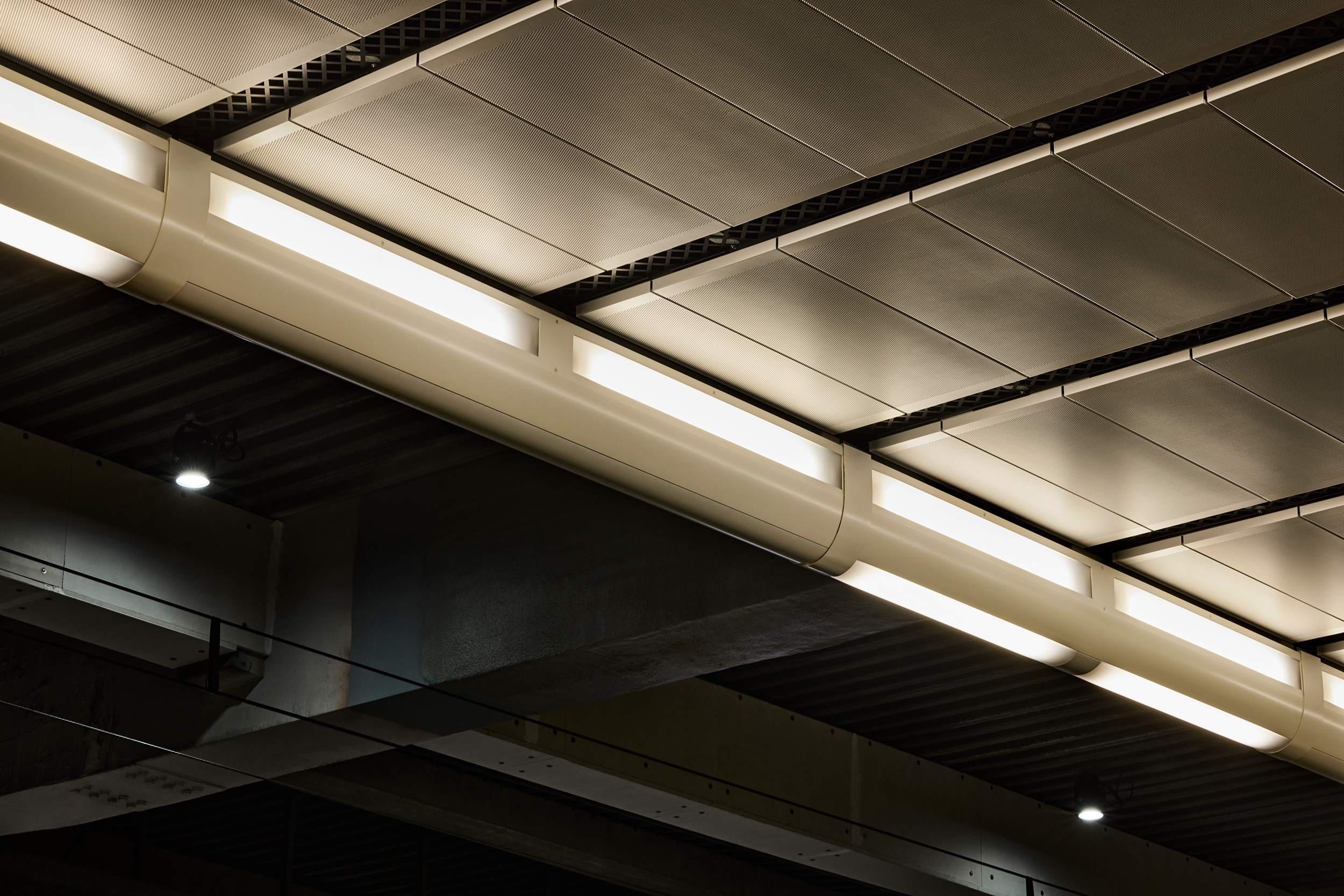 The new lighting scheme in the station's public areas offers a robust solution, where few types of fixtures with a long lifespan help keep operational costs at a low level. Bespoke luminaires are designed to create ceiling and directional light whilst also preventing birds from gathering in left over spaces, significantly lowering maintenance costs.