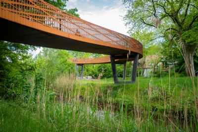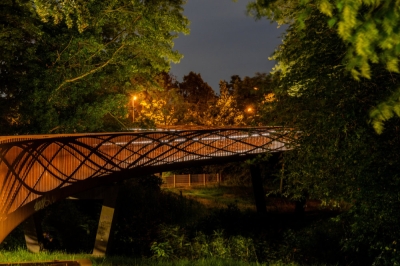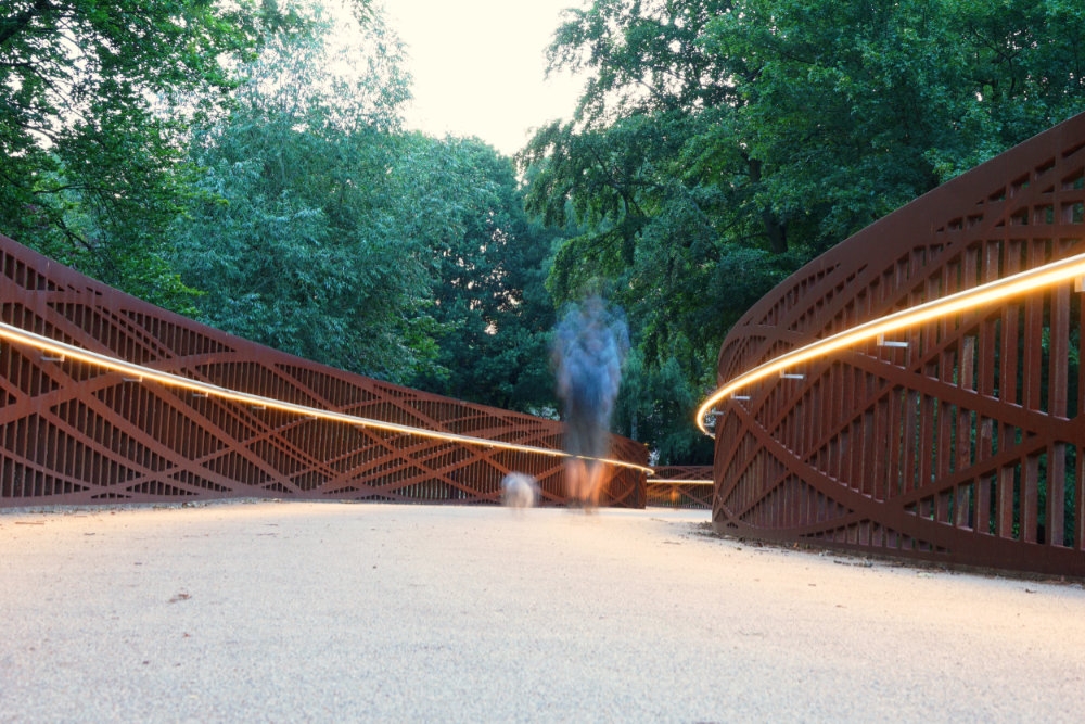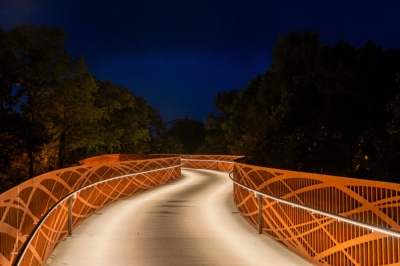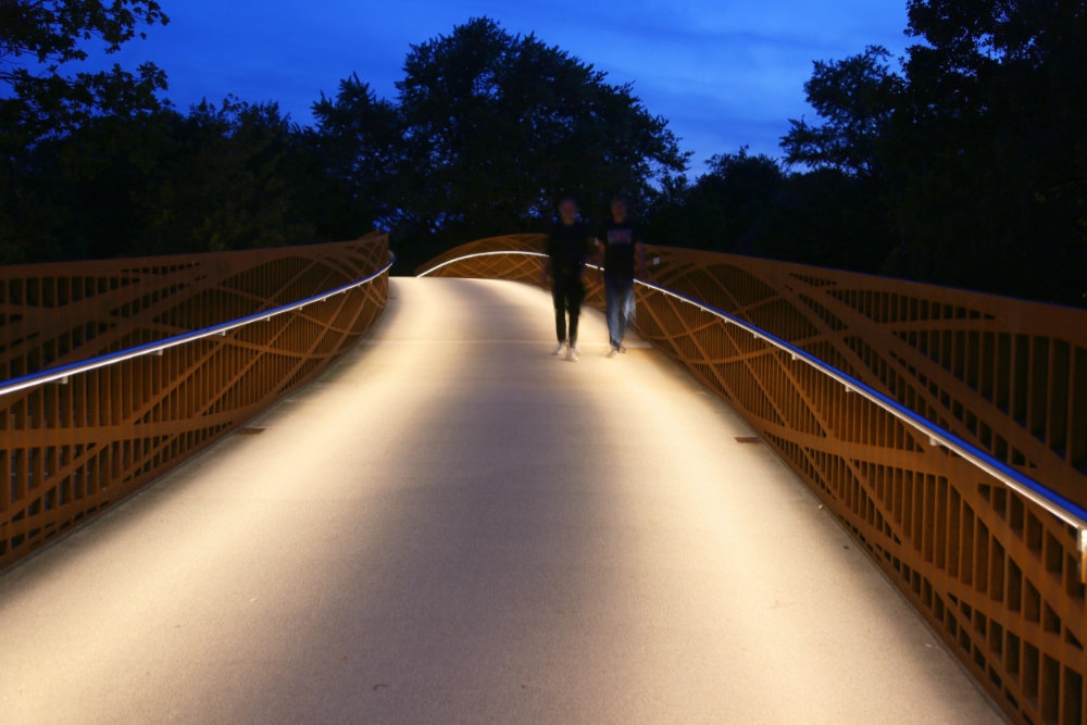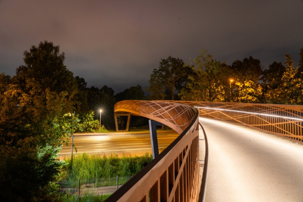 Entry DescriptionThe new Dalkebruecke in Guetersloh carries pedestrians and cyclists across the Dalke River and the B61 in a single,ribbon-like gesture. It exemplifies innovation by fusing architecture, engineering, and lighting into one coherent structure. The 40-mm flame-cut Corten steel railing functions simultaneously as balustrade and load-bearing element, defining the bridge’s sculptural form – a structural and design innovation that earned the Dalkebruecke the German engineering award „Ingenieurpreis des Deutschen Stahlbau 2024“.The lighting design translates this principle into a solution of clarity and functionality. A linear LED system, concealed within the ergonomically shaped handrail at 95 cm height, directs light asymmetrically onto the pale deck, which reflects it softly back onto the railing. This ensures safe guidance without glare while preserving the bridge’s transparency.Ecological sensitivity was central: shielding prevents disturbance to flora, fauna, and traffic below, while the warm 3000 K color temperature, DALI dimming,and night-time reduction to 1.5 W/m minimize impact and energy use. Modules were precisely adapted to the curved geometry, ensuring an uninterrupted ribbon of light.By evening, the bridge becomes a warm, golden trace across the landscape- a sculptural gesture where structural invention,ecological care,functional precision, and human comfort flow together