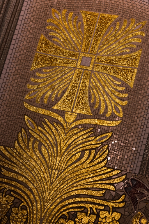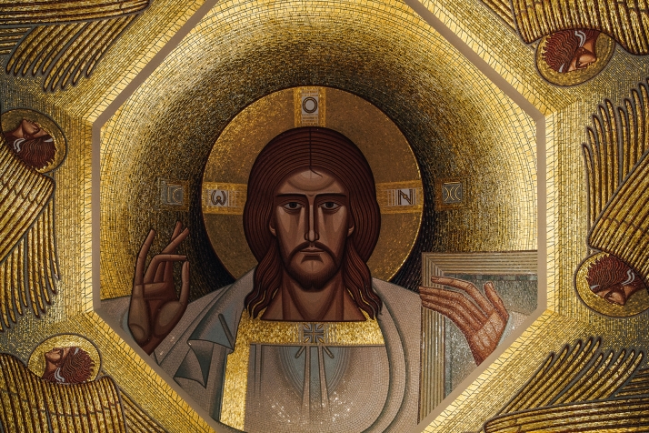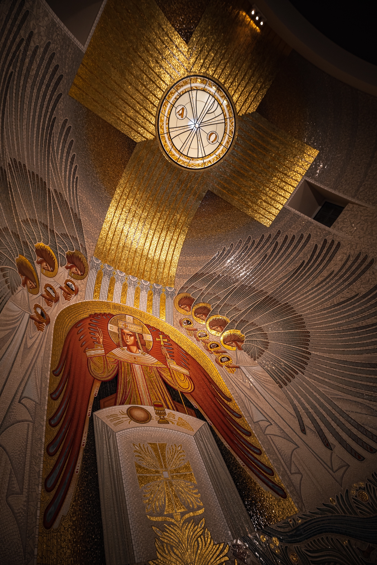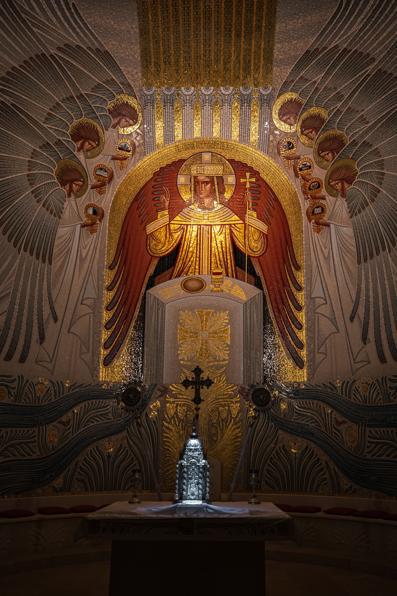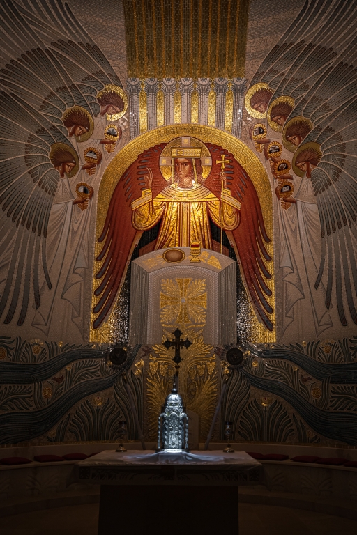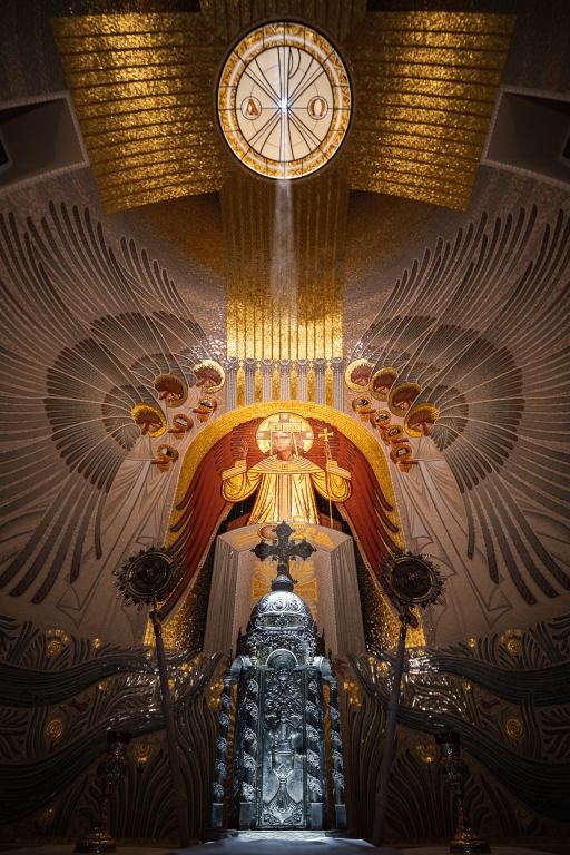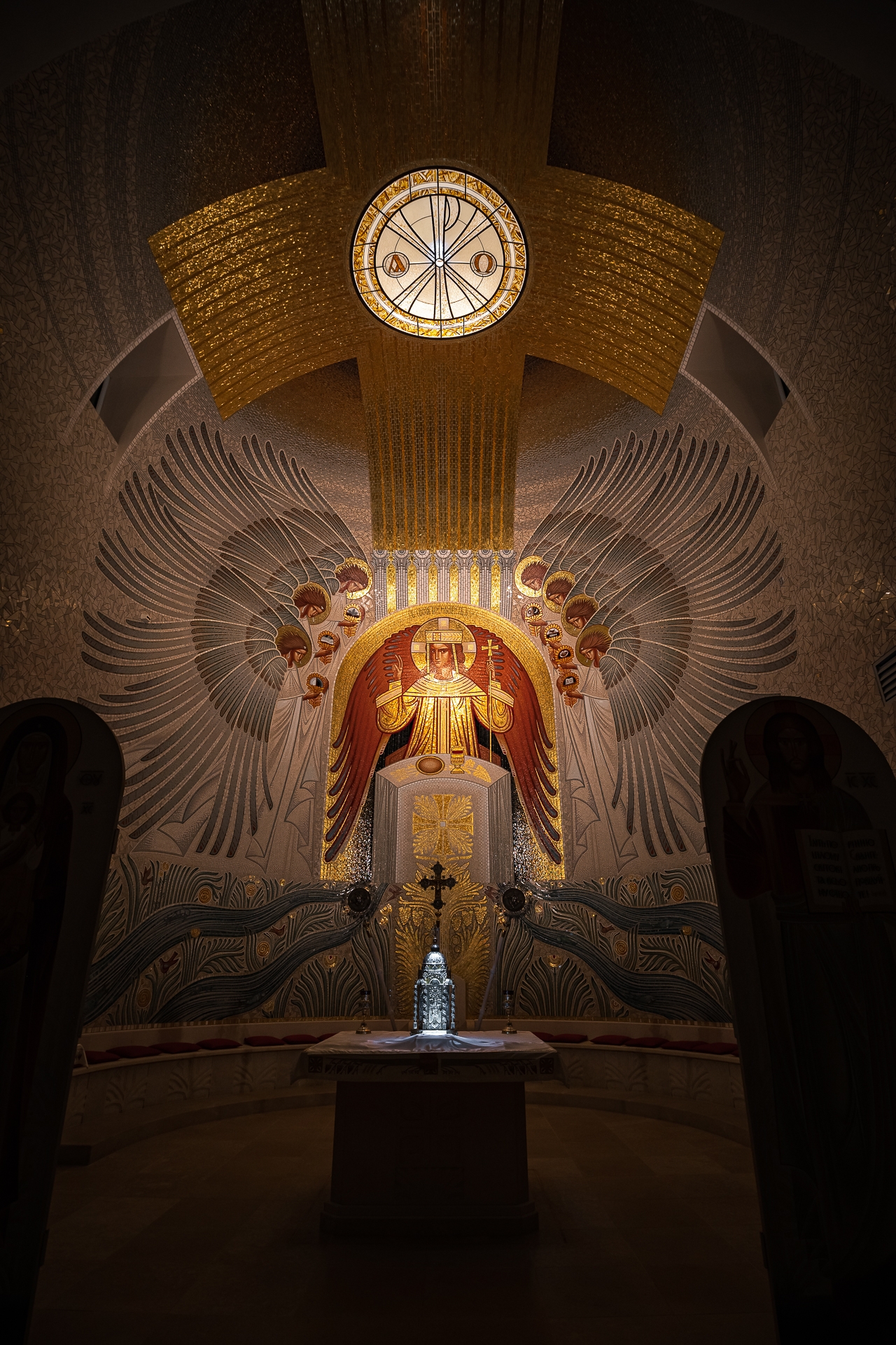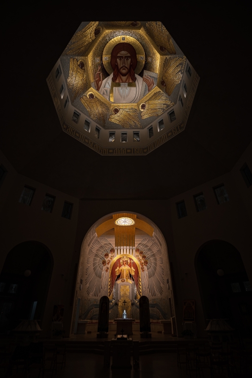The stained glass is backlit, simulating natural light after sunset, while non-optical sources add a starry sky effect. A narrow-beam spotlight directs its beam at the altar, accentuating key elements during services. Combined with the smoke from the censer, this beam creates an atmosphere of divine unity.