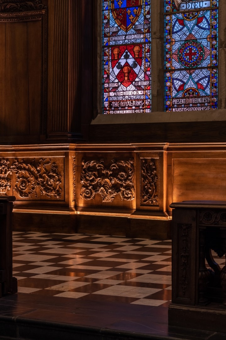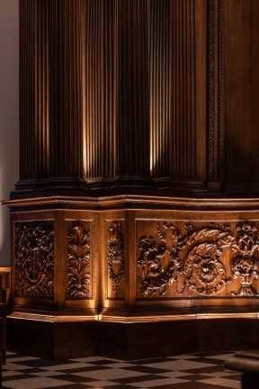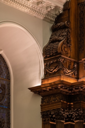 Modern lighting was discreetly integrated into the historic fabric, with fittings concealed in cornices, joinery and mouldings. Bespoke details, developed with conservation specialists, highlight the hand-carved timber, ornate plasterwork and historic artworks. Extensive mock-ups were used to test materials, angles & colour temperature, ensuring a precise balance of light and shadow to bring carvings and ceilings to life. Warm 2400K tones recall candlelight at the altar, while 2700K high-CRI sources reveal artwork and plaster ceilings. Hidden uplighting adds drama and three-dimensionality to the papier-mâché ceiling.