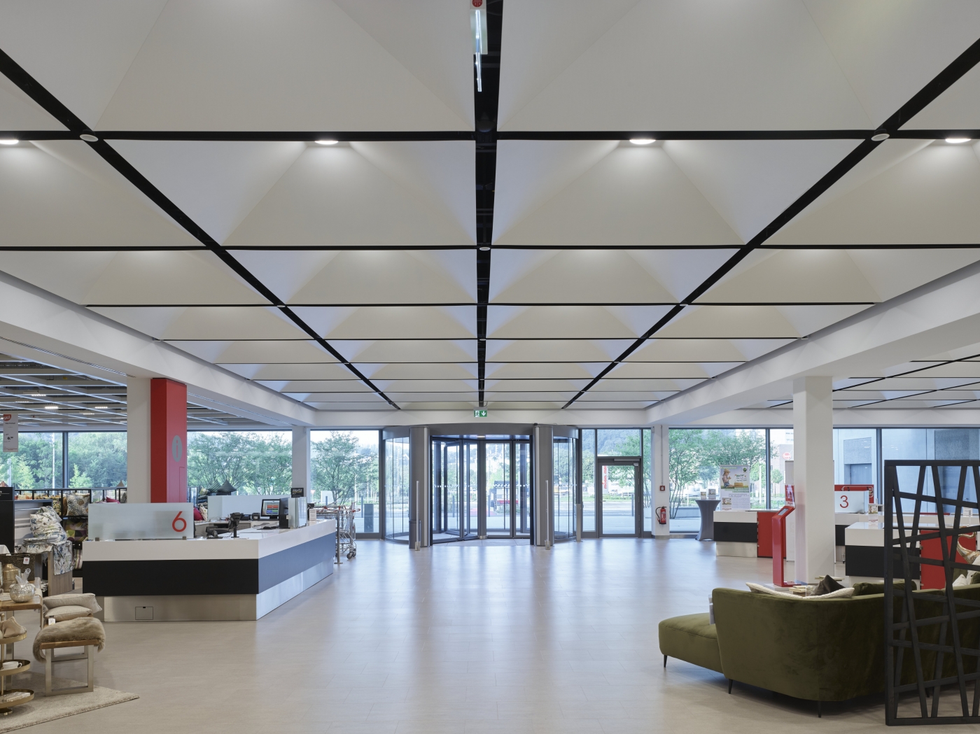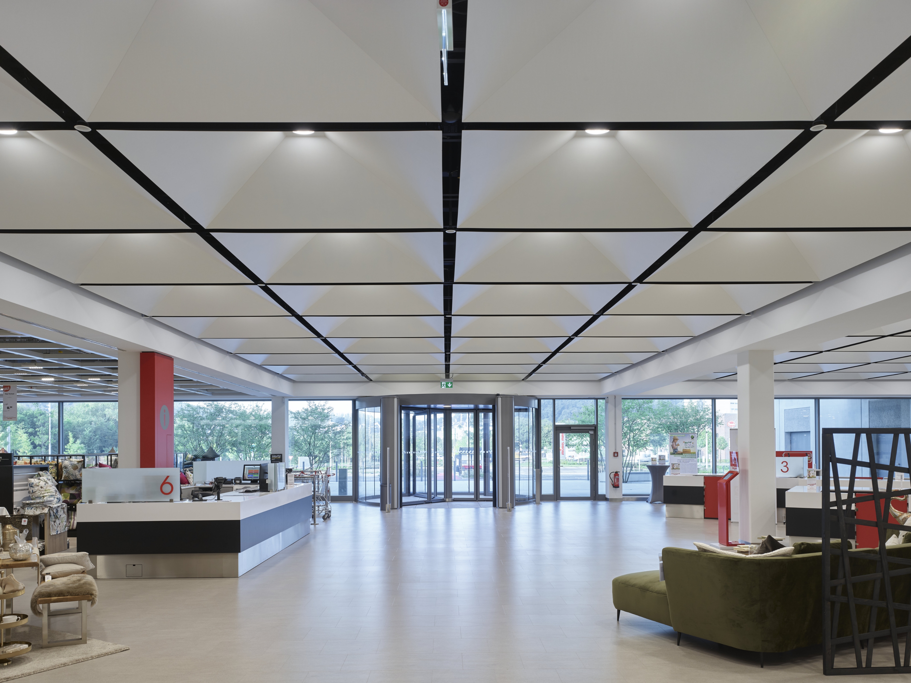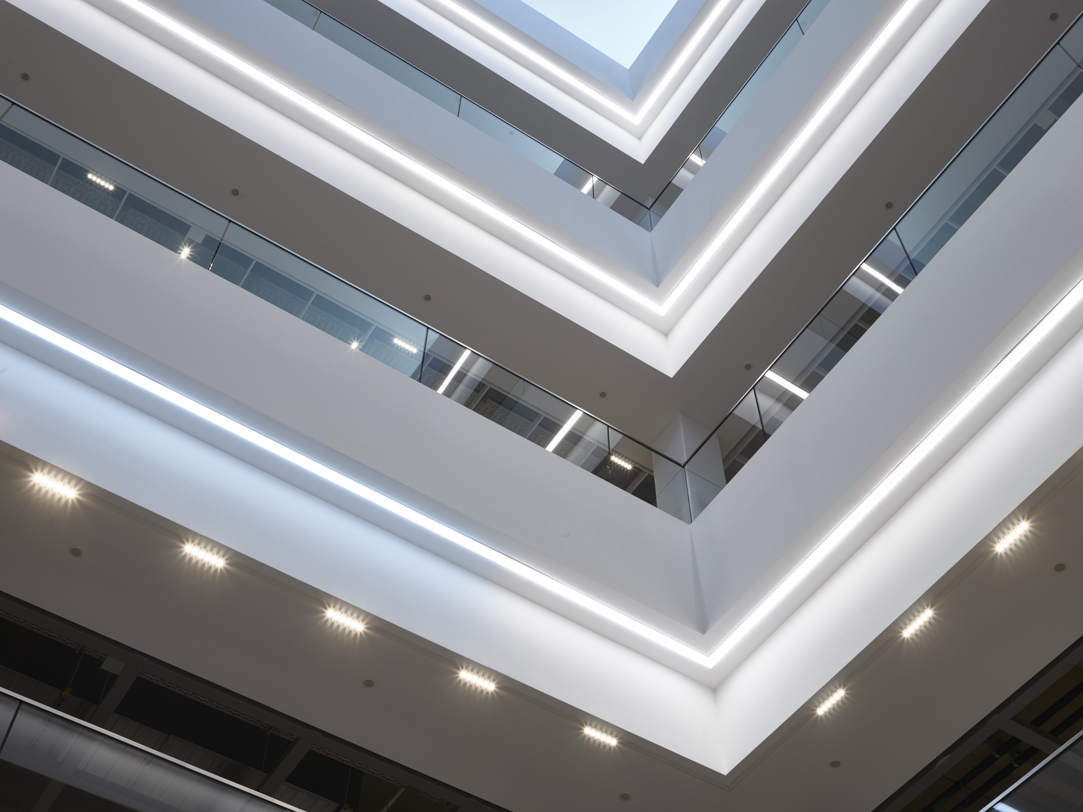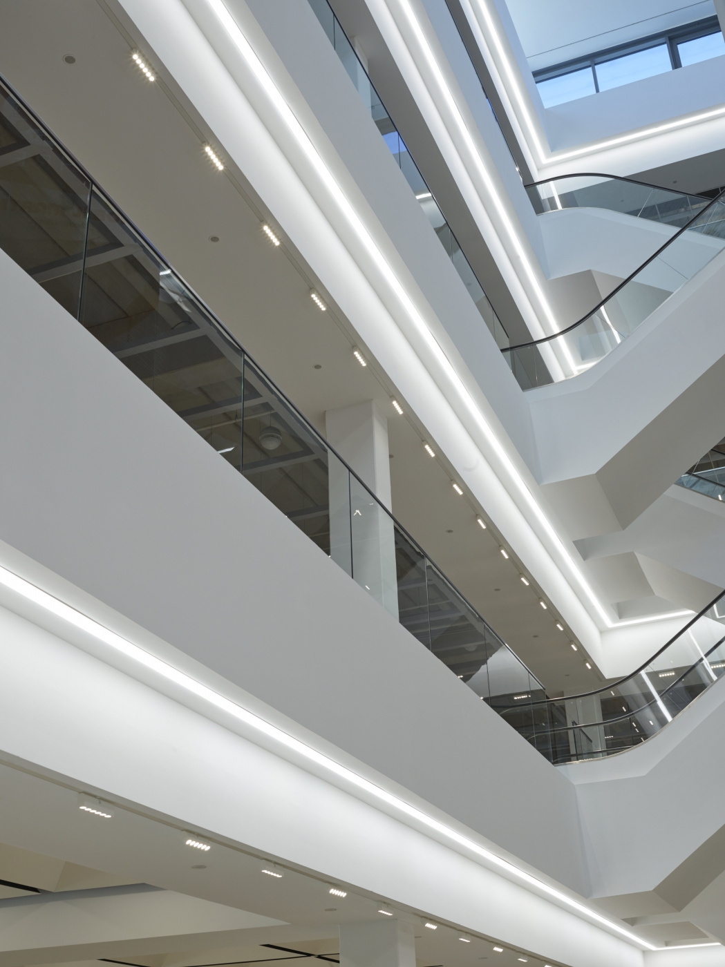 The furniture shop chain Möbel Martin has opened a new house. The calculation of the daylight input during the course of the year was elementary for the artificial lighting planning. The architecture of the four-storey building is characterised by a high atrium, large glass surfaces in the entrance area and a glazed upper gallery. Funnel-shaped suspended luminaires illuminate the entrance area, continuing the straightforward character of the architecture. LEDs and radial Fresnel optics provide brilliant and diffuse light. In the atrium, light bands emphasise the vertical lines of the building, with the blue component of the light increasing slightly upwards to enhance the sky effect. The restaurant has an even ceiling surface that reflects the graphic line of the atrium. Direct and indirect lighting is provided by downlights, wallwashers, picture and accent luminaires and pendant luminaires. The entire lighting on 30,000 m2 adapts to the daylight in terms of colour and intensity. "HCL" A high colour rendering value enables customers to assess the product world authentically. The entire lighting design and the development of all special luminaires were carried out by Tobias Link.