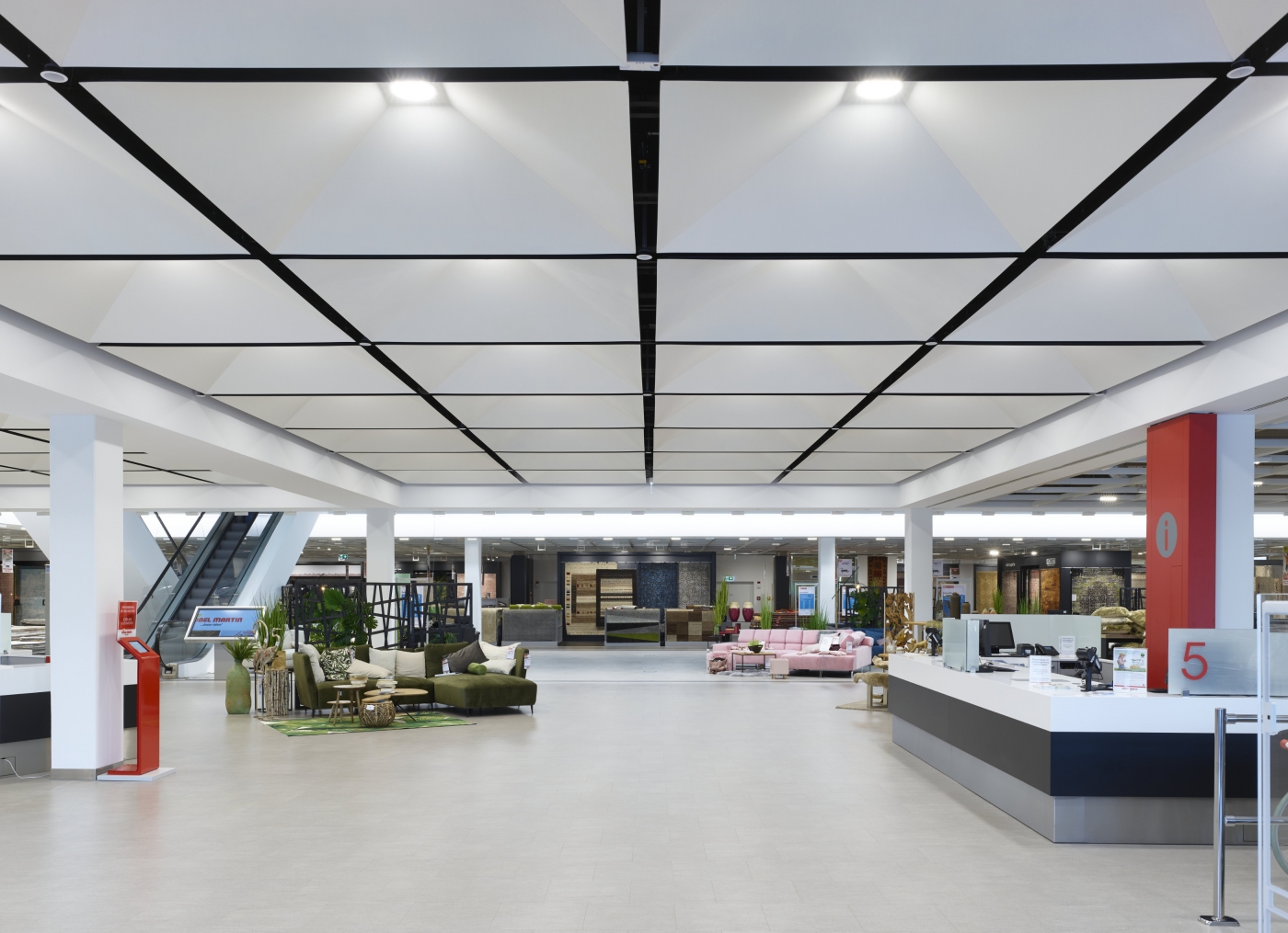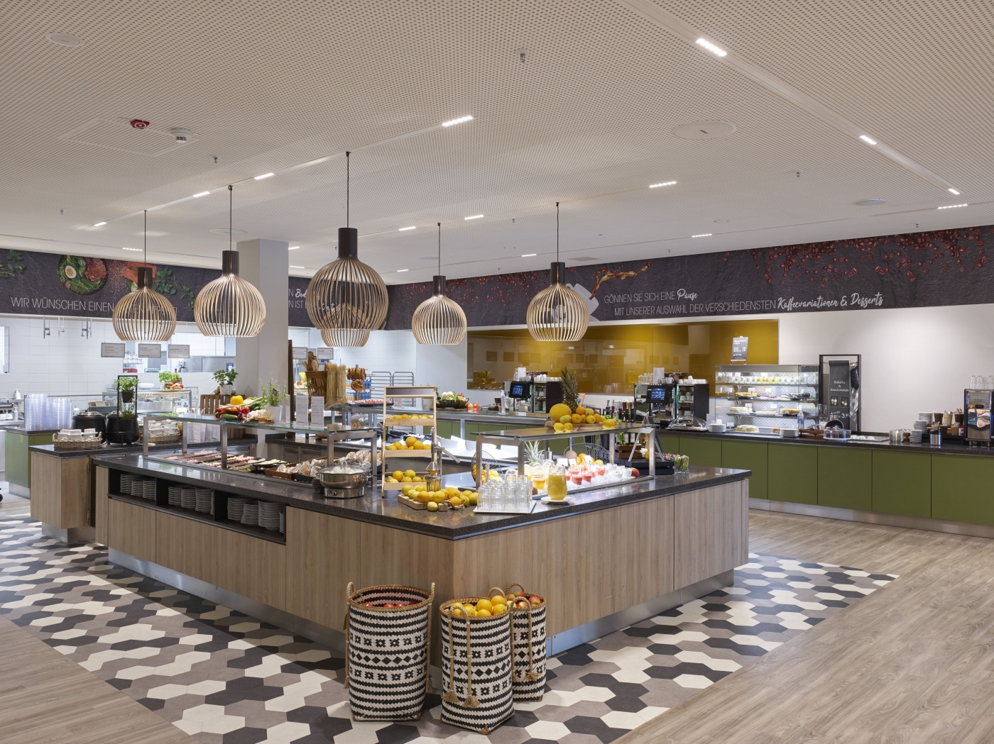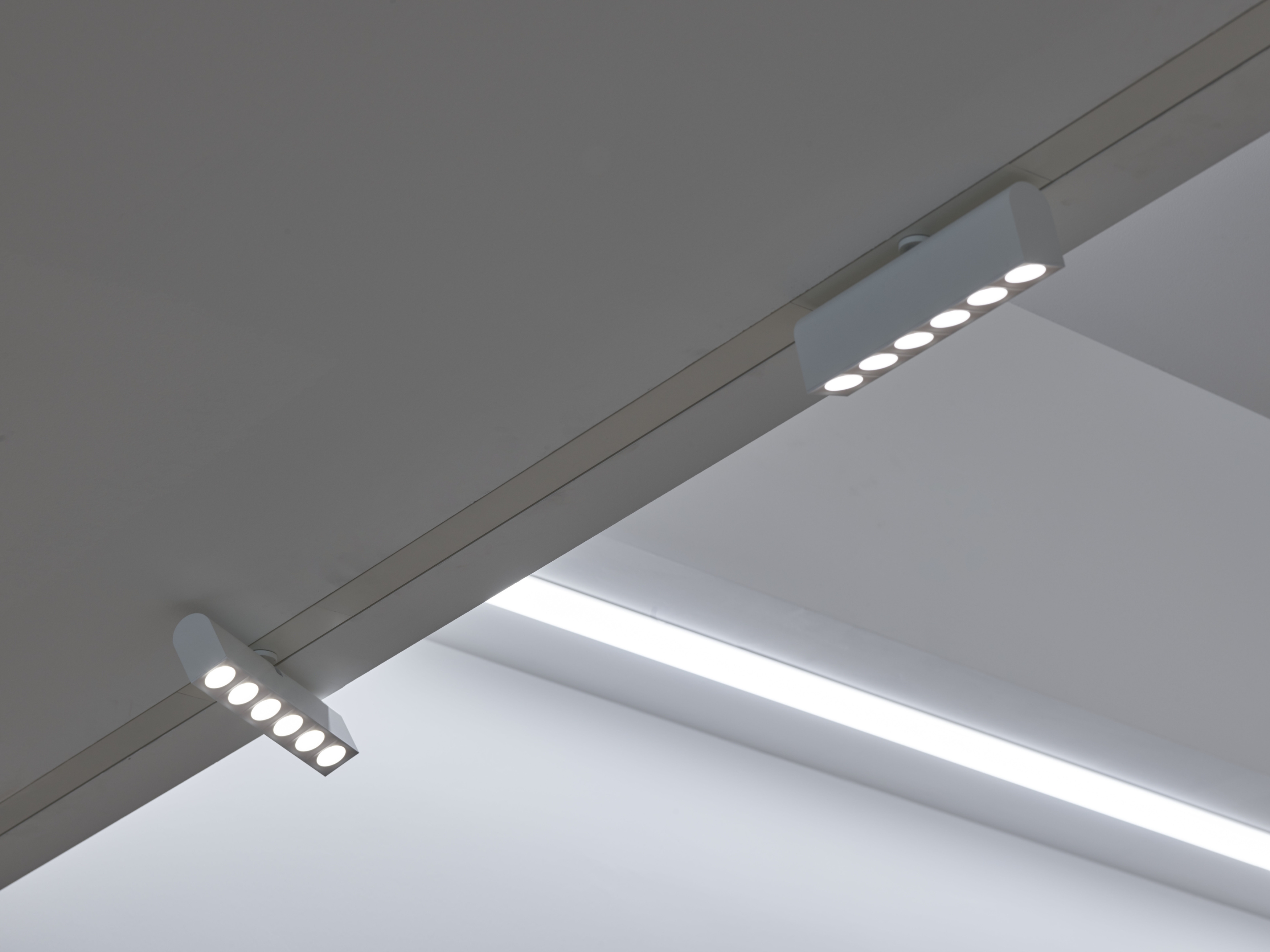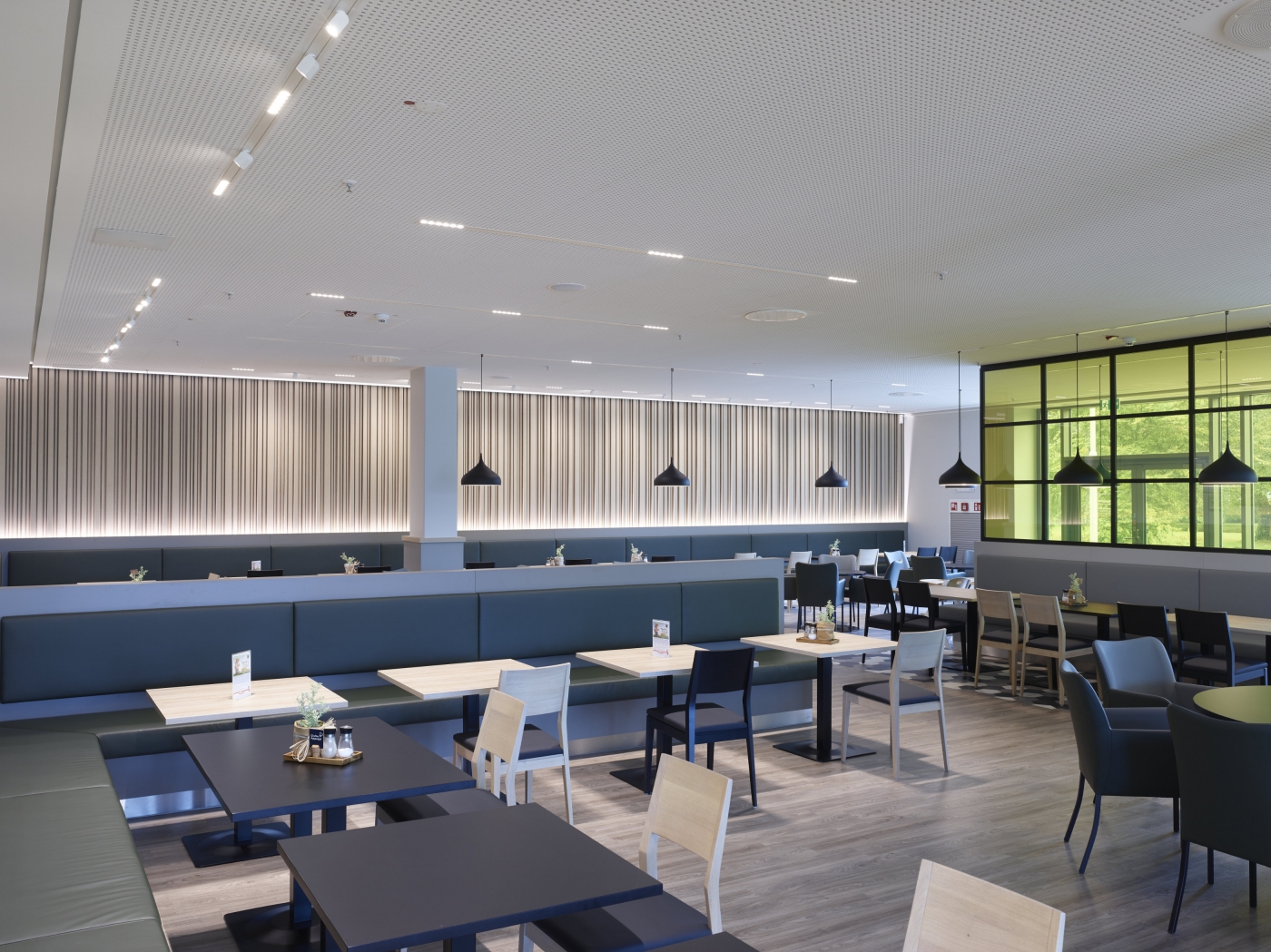 The furniture shop chain Möbel Martin has opened a new house. The calculation of the daylight input during the course of the year was elementary for the artificial lighting planning. The architecture of the four-storey building is characterised by a high atrium, large glass surfaces in the entrance area and a glazed upper gallery. Funnel-shaped suspended luminaires illuminate the entrance area, continuing the straightforward character of the architecture. LEDs and radial Fresnel optics provide brilliant and diffuse light. In the atrium, light bands emphasise the vertical lines of the building, with the blue component of the light increasing slightly upwards to enhance the sky effect. The restaurant has an even ceiling surface that reflects the graphic line of the atrium. Direct and indirect lighting is provided by downlights, wallwashers, picture and accent luminaires and pendant luminaires. The entire lighting on 30,000 m2 adapts to the daylight in terms of colour and intensity. "HCL" A high colour rendering value enables customers to assess the product world authentically. The entire lighting design and the development of all special luminaires were carried out by Tobias Link.