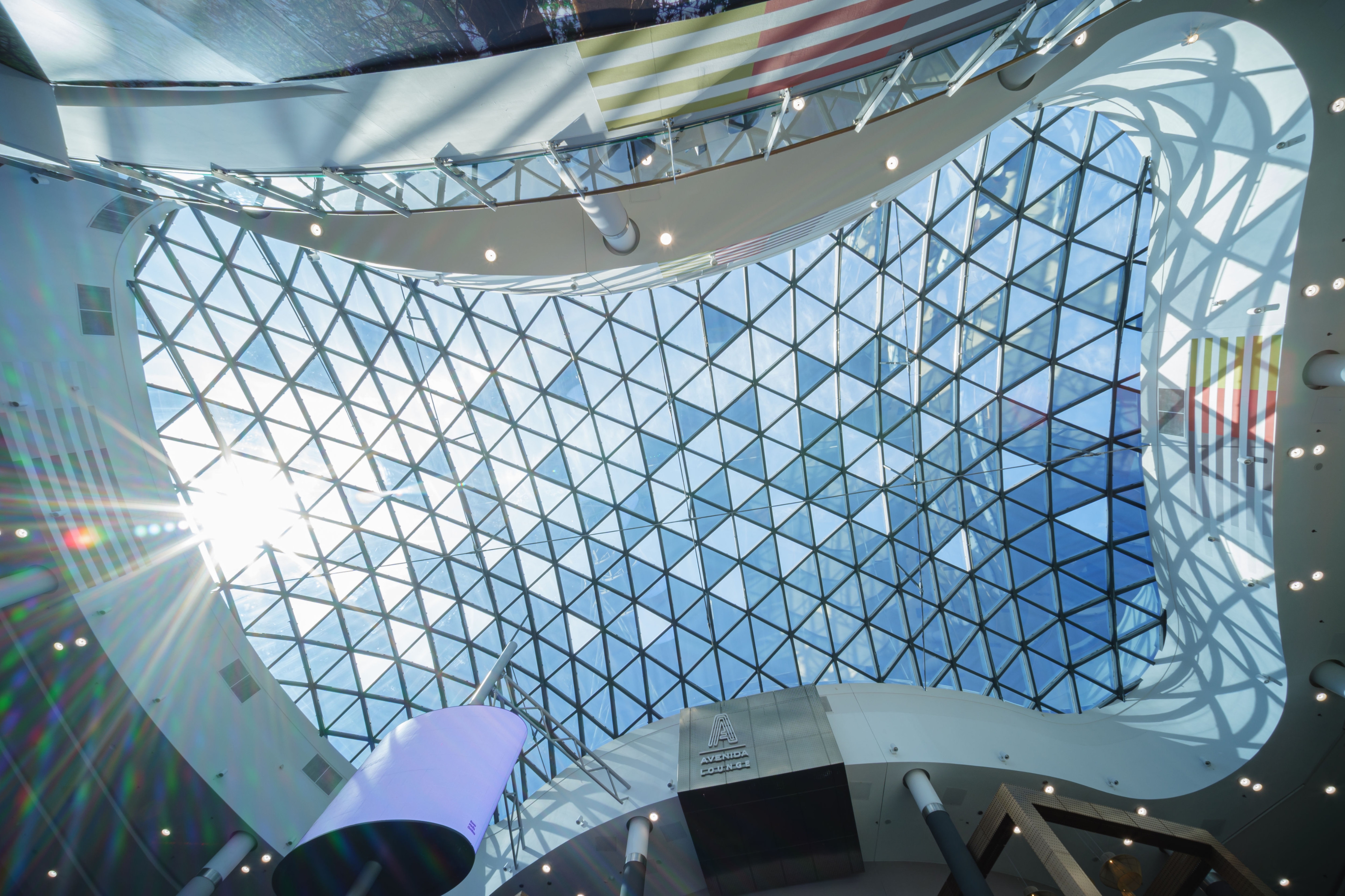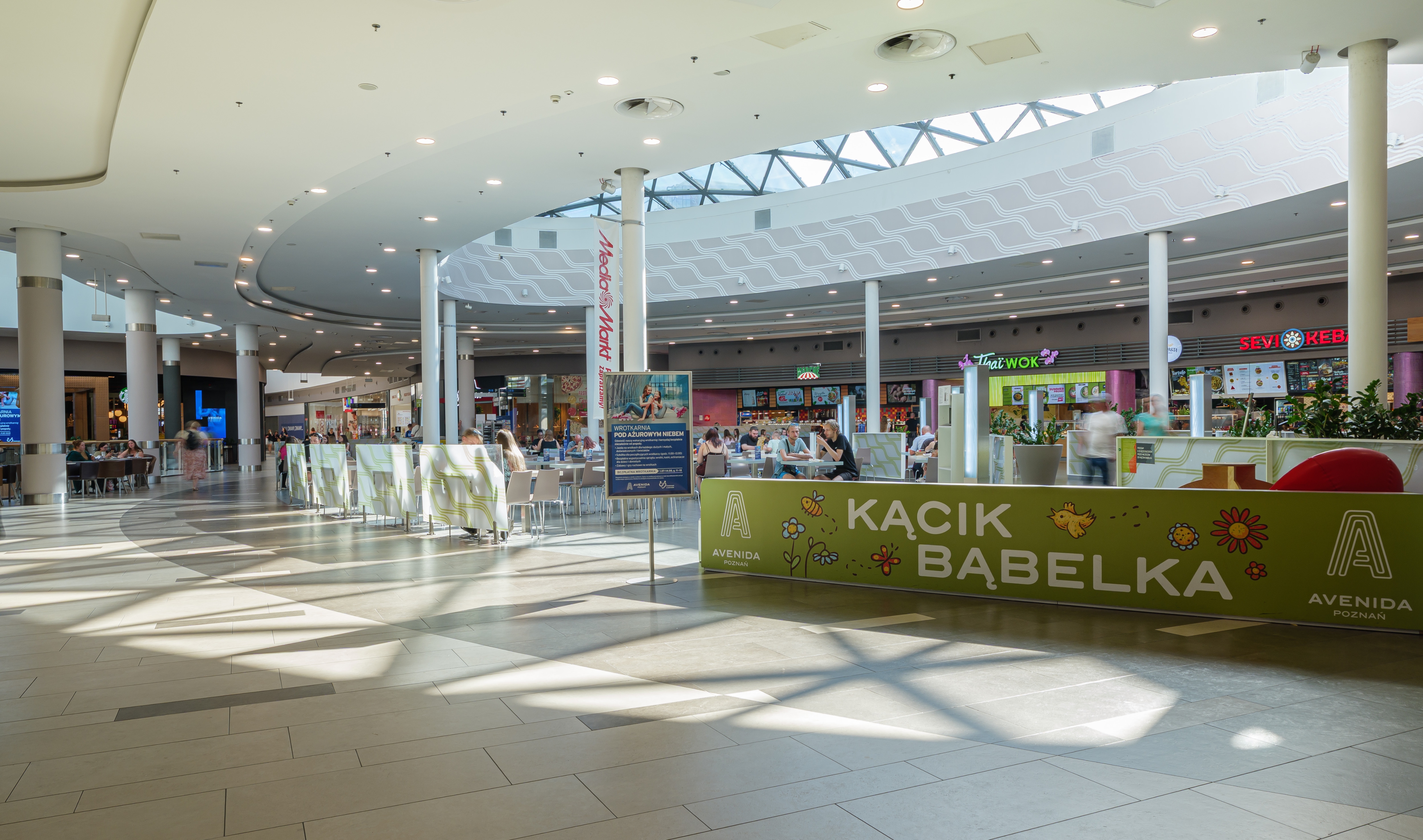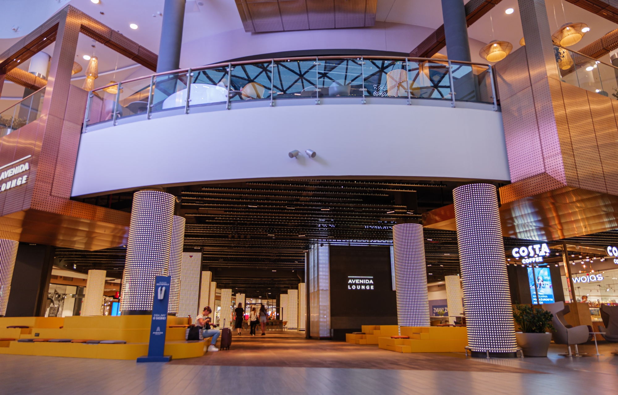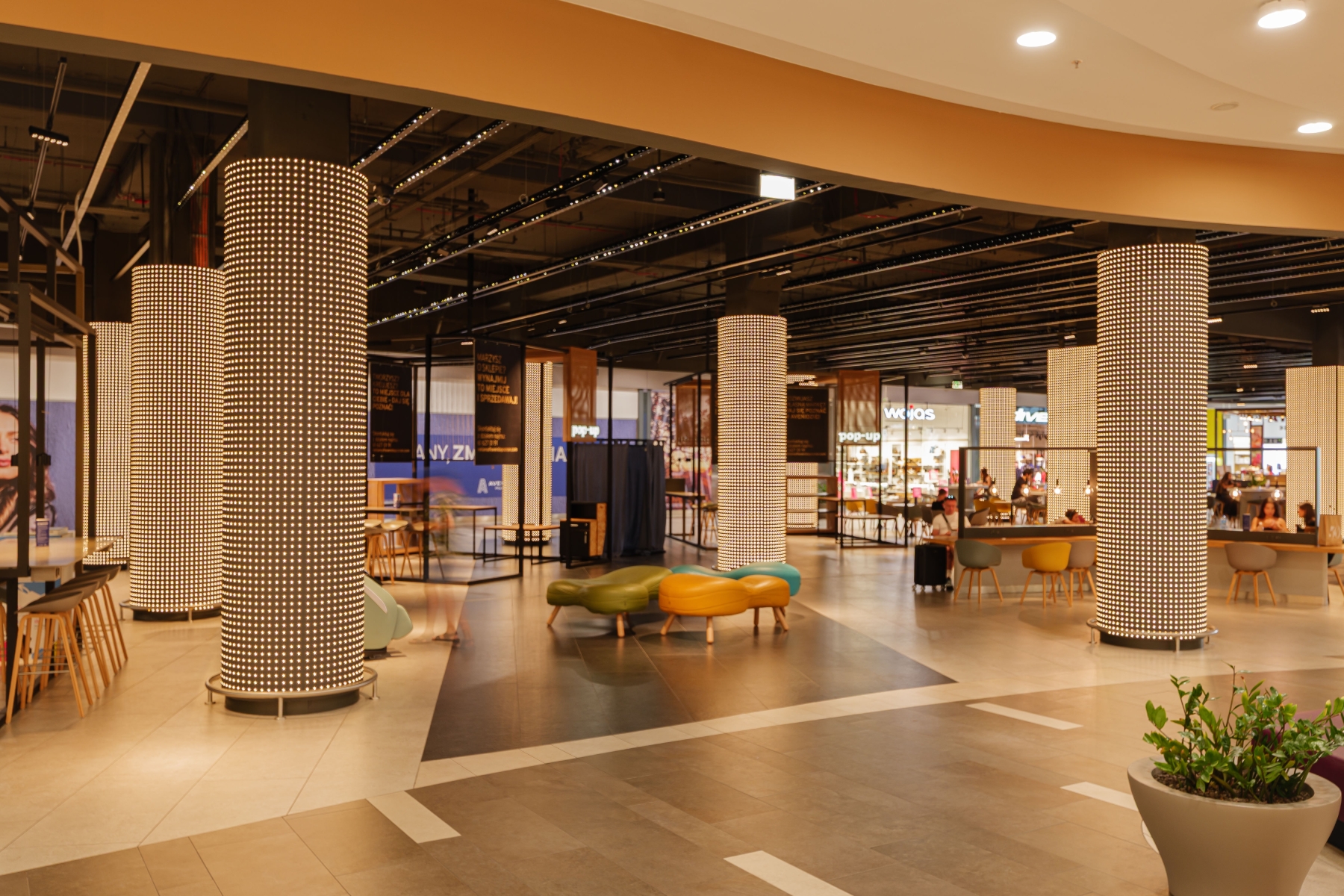 Entry DescriptionThe refurbishment of Avenida Poznan mall addressed three major challenges: outdated artificial lighting, extreme daylight contrasts, and a lack of atmosphere in the central lounge. The glass roofs allowed uncontrolled sunlight, creating uncomfortable contrasts, glare, and overheating, while adjacent areas remained dark and unwelcoming. The existing 3000K lighting system was neither dynamic nor suitable to balance changing daylight conditions, resulting in poor retail visibility, particularly in the food court. In the lounge, cold and broad-beam luminaires generated a harsh, unattractive ambience. Our concept redefined both daylight and artificial lighting. A high-performance foil was introduced to maintain the view of the sky while filtering daylight to achieve a balanced distribution. The new LED system with adjustable beam focus and Tunable White was integrated with sensors, automatically adapting to natural light levels. This created a harmonious light climate throughout the day while reducing energy use by over 60%. In the lounge, warm, narrow-beam luminaires now create a lively play of light and shadow, harmonising with a ceiling star installation. A bespoke LED column wrap adds a vertical focal point, drawing visitors into a more intimate, welcoming space.