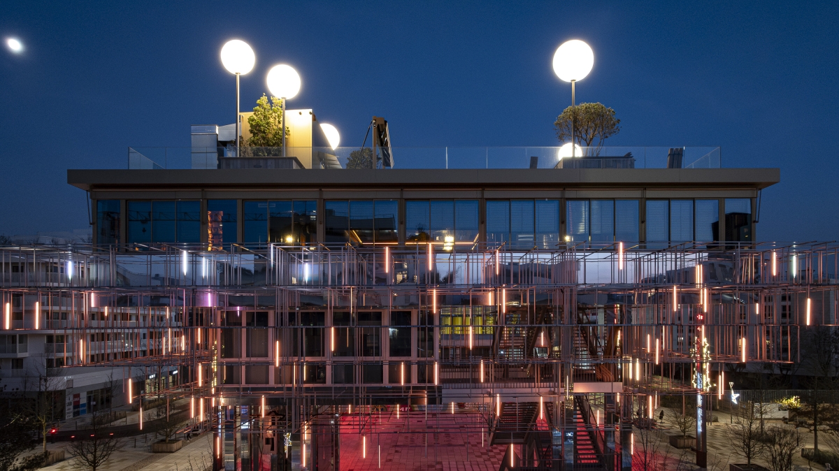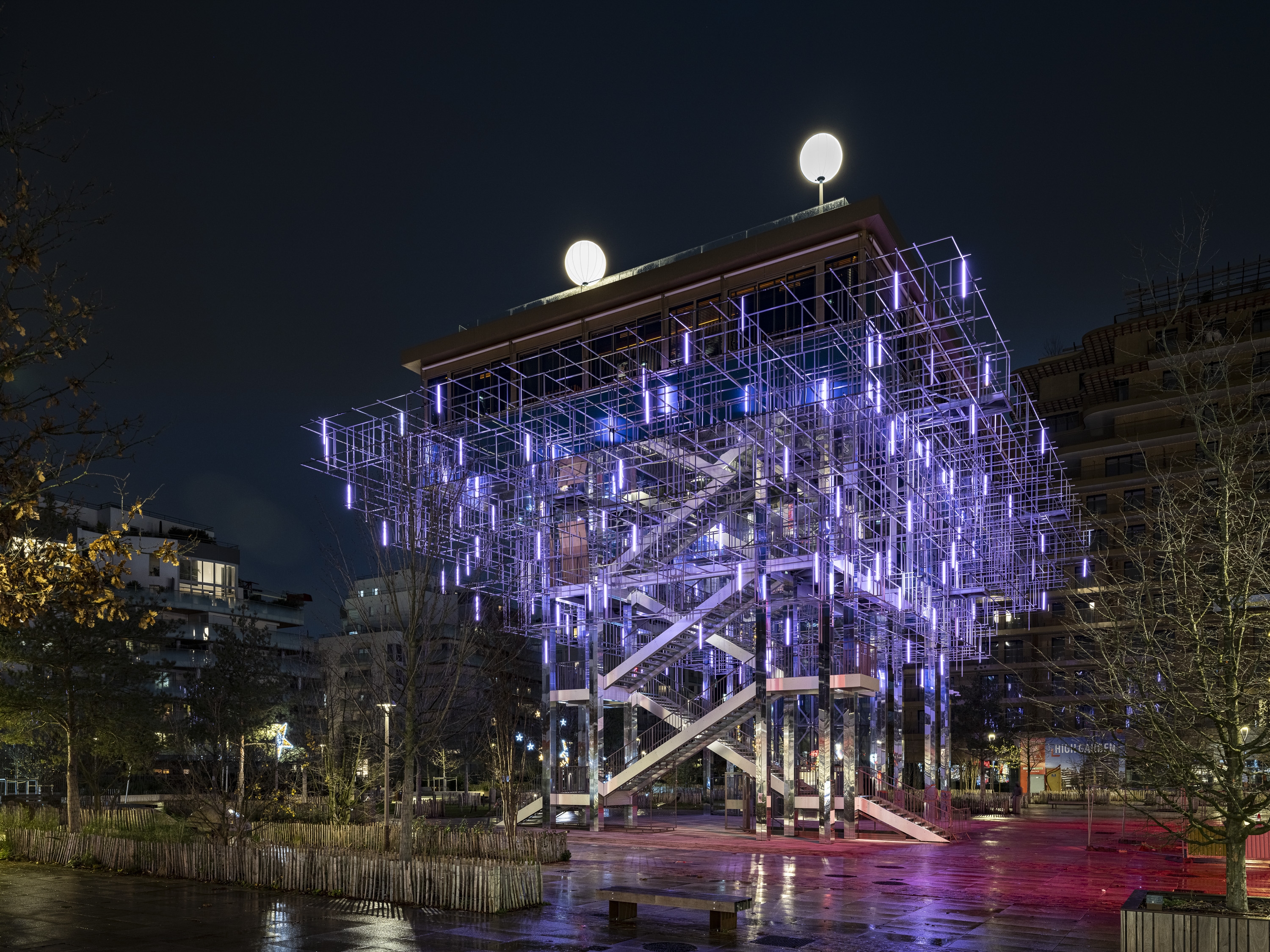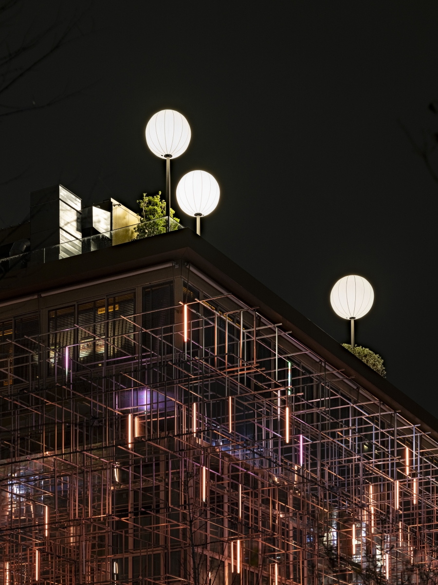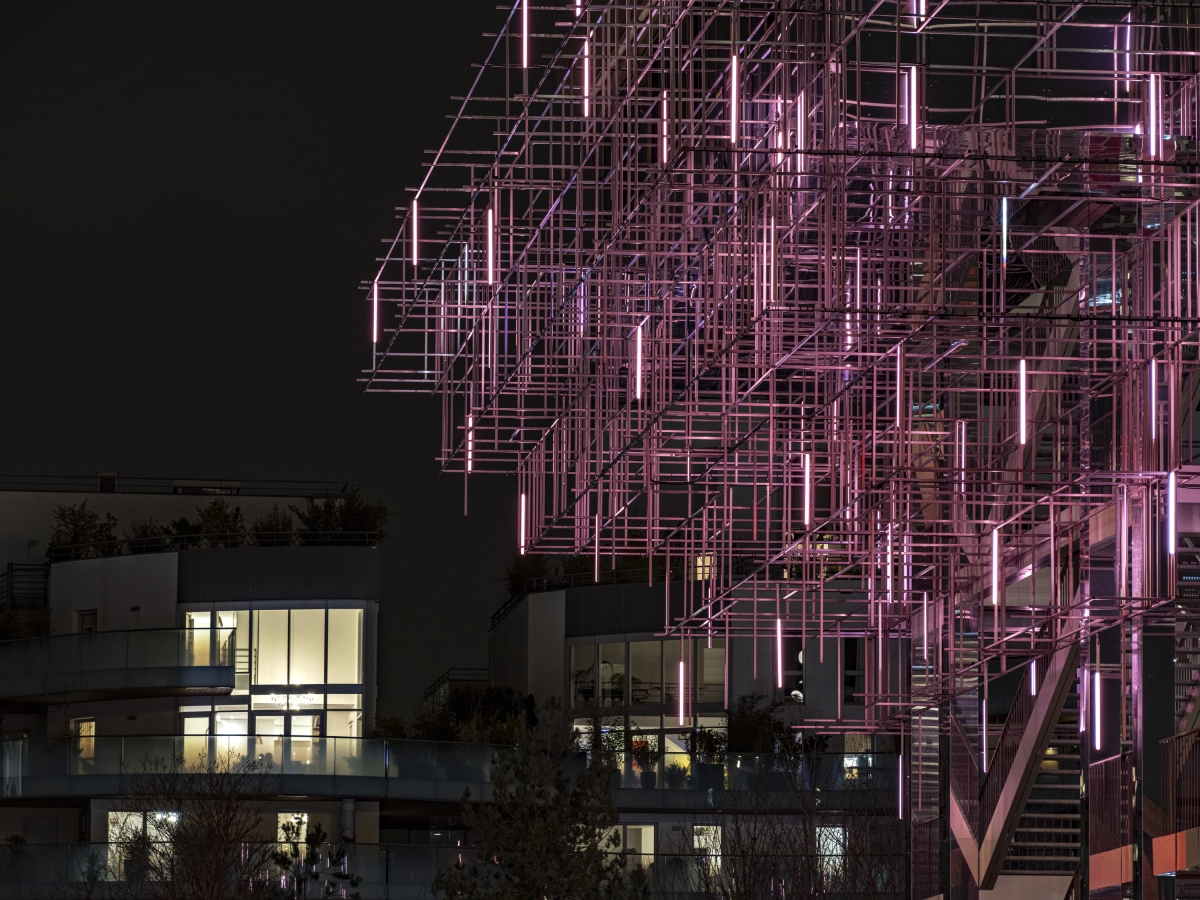 Entry DescriptionThis piles building hosts a restaurant and a rooftop bar both providing a panoramic view on a green area, the Mont Valérien, the state forest of Malmaison, the Halle Gourmande and the L15 metro station of Great Paris Express. The need to save energies while suggesting welcoming places at night leads the designers to imagine interactive and smart technologies. The scaffolding-like structure of this iconic building allowed us to create a colourful, moving and spectacular illumination in the park. Inspired by the name of the panoramic restaurant “Mon Nuage”, the lighting concept is playing with the clouds universe especially with the mist generated by a built-in watering system. 180 lighting lines are suspended in a 3D mesh and are lit at the dusk (80 cm long LED battens with two emiting faces controlled by DMX via Pharos system). The materials were chosen to multiply lighting effects and allow us to maintain a global electric power under 1500W. Beyond the lighting fixture, CONCEPTO worked and gave advices to the architectes for the materials choice. Indeed, mirroring textures and dark filters on the glass are the clues to create endless reflection effects in all perspectives. Users and observers can let themselves loosing among latticed structure while enjoying a calm atmosphere on the roof. This way of working is inviting people to go around and enjoy a unique experience.