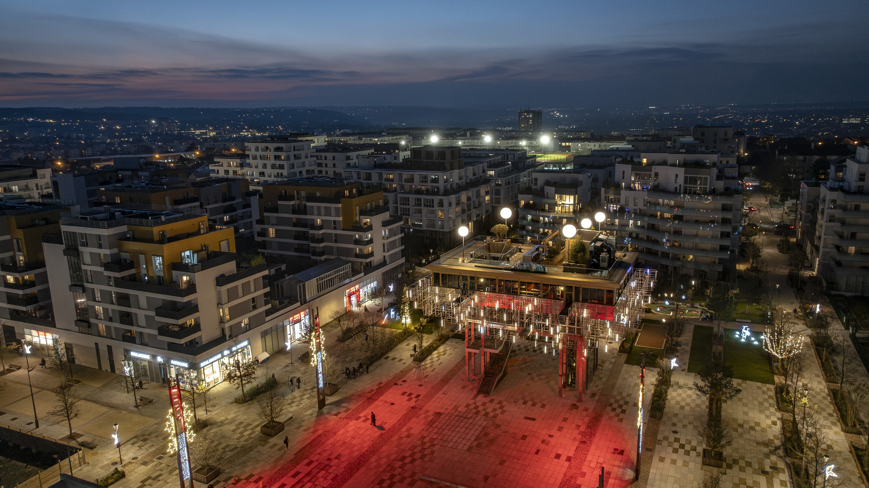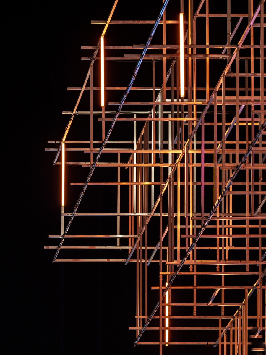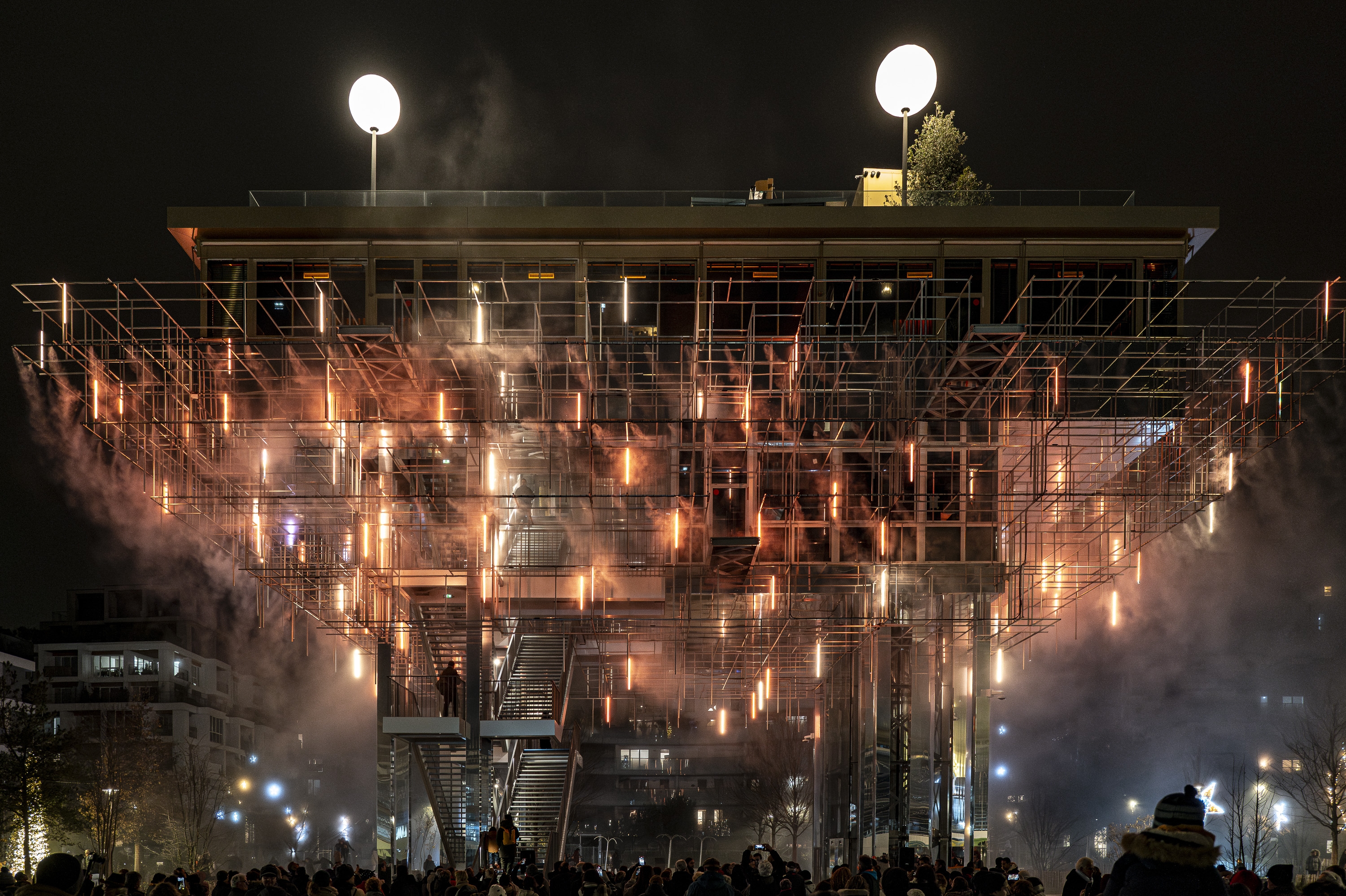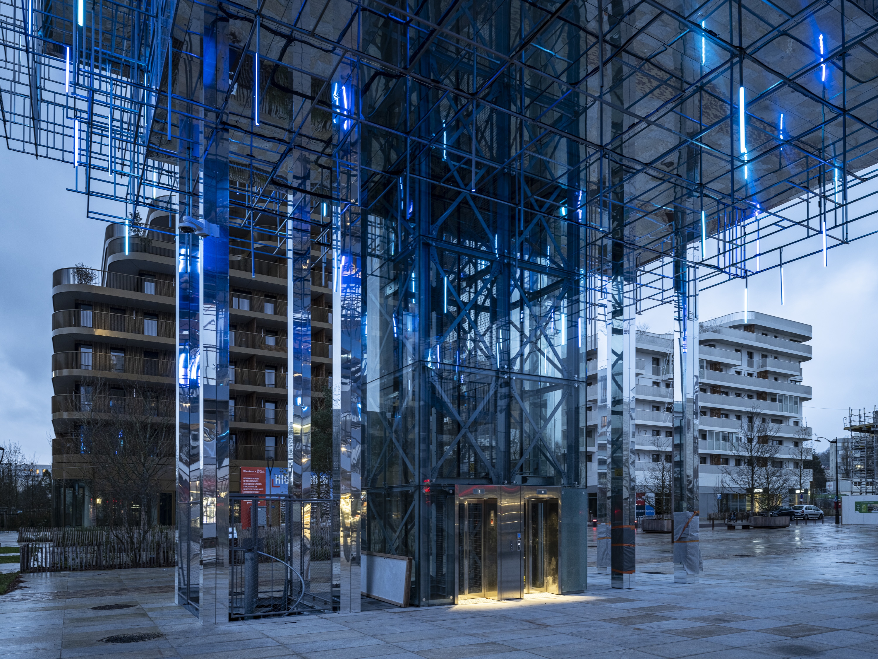 Entry DescriptionThis piles building hosts a restaurant and a rooftop bar both providing a panoramic view on a green area, the Mont Valérien, the state forest of Malmaison, the Halle Gourmande and the L15 metro station of Great Paris Express. The need to save energies while suggesting welcoming places at night leads the designers to imagine interactive and smart technologies. The scaffolding-like structure of this iconic building allowed us to create a colourful, moving and spectacular illumination in the park. Inspired by the name of the panoramic restaurant “Mon Nuage”, the lighting concept is playing with the clouds universe especially with the mist generated by a built-in watering system. 180 lighting lines are suspended in a 3D mesh and are lit at the dusk (80 cm long LED battens with two emiting faces controlled by DMX via Pharos system). The materials were chosen to multiply lighting effects and allow us to maintain a global electric power under 1500W. Beyond the lighting fixture, CONCEPTO worked and gave advices to the architectes for the materials choice. Indeed, mirroring textures and dark filters on the glass are the clues to create endless reflection effects in all perspectives. Users and observers can let themselves loosing among latticed structure while enjoying a calm atmosphere on the roof. This way of working is inviting people to go around and enjoy a unique experience.