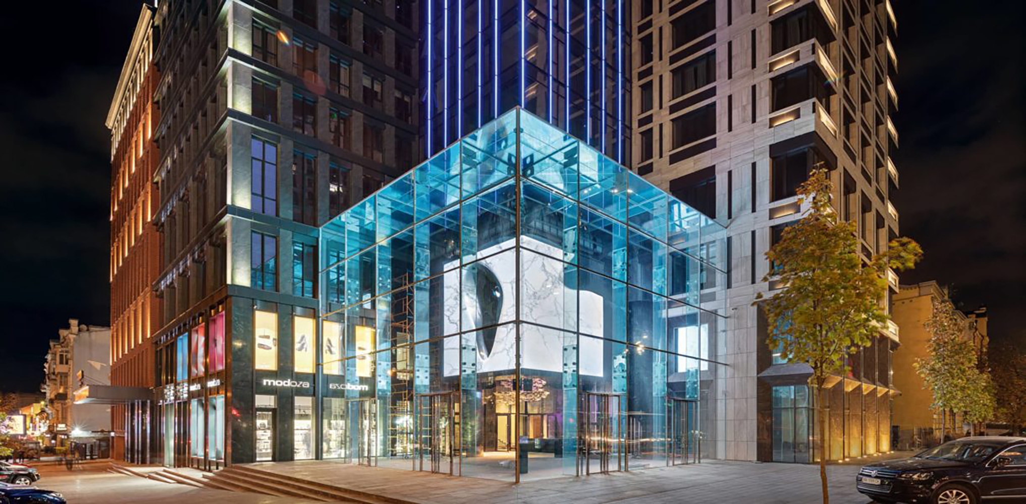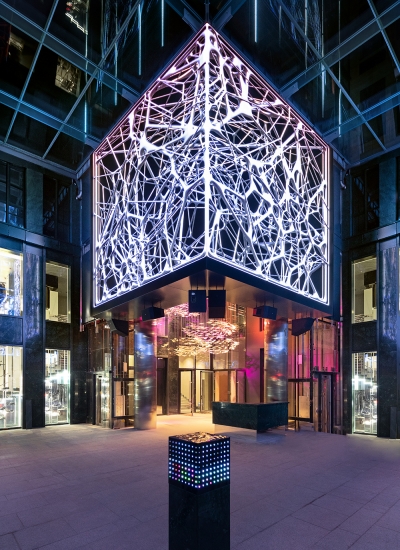 The cube on the facade of Chicago Central House is the first permanent media sculpture in Europe.