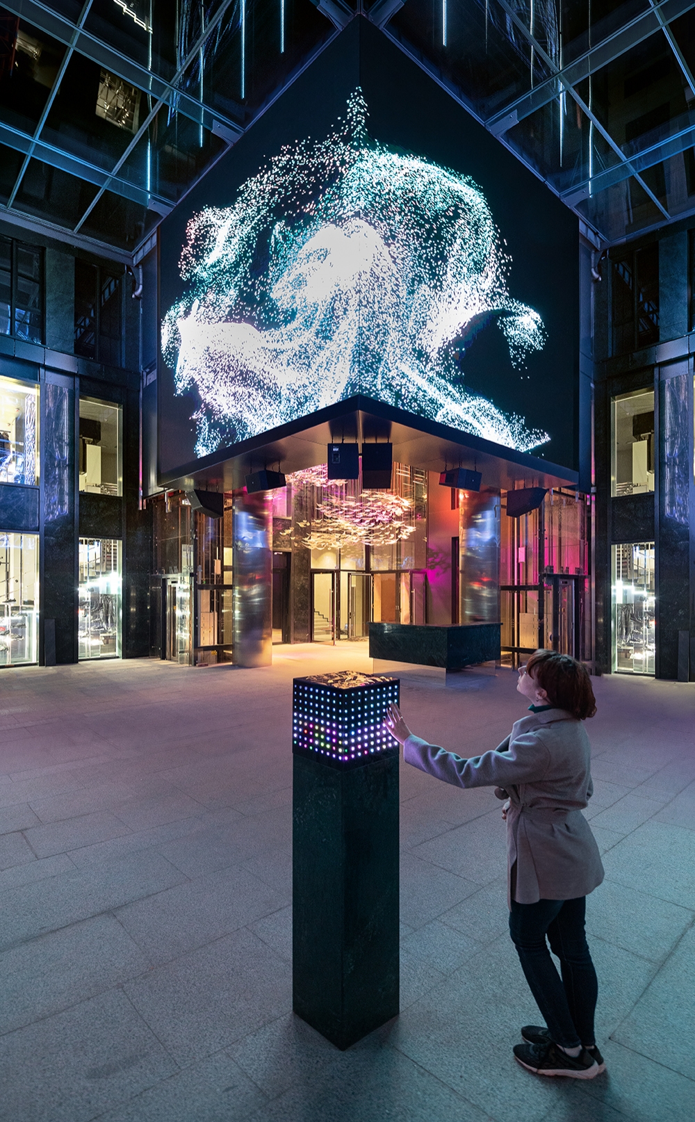 Within an hour, 6 types of content are broadcast on a cube. Five of them show shape in the textures of wood, stone, concrete, glass and metal. The sixth digitally generates a form based on the available Big Data - data on weather, city traffic, air travel..