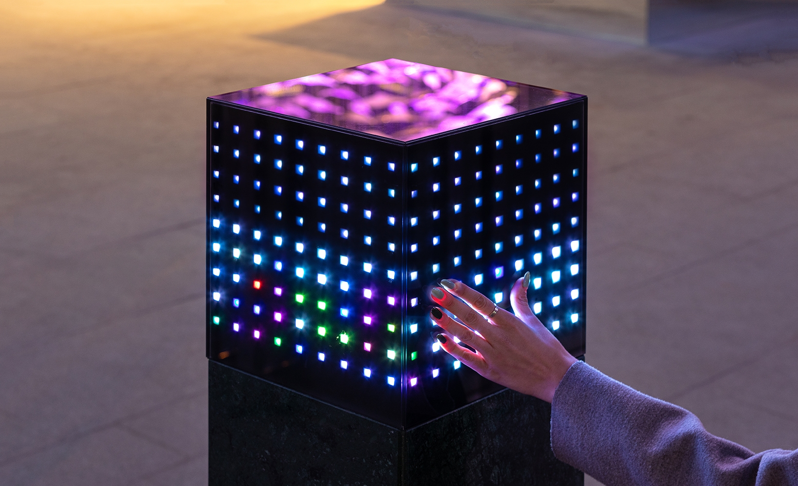 A sensory model of a cube is placed in a glass shell, touching which a person acts on existing conte