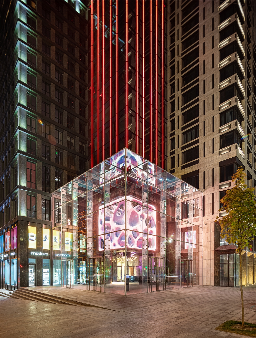 The sculpture is a cube 5*5 m in size, placed in a glass shell.