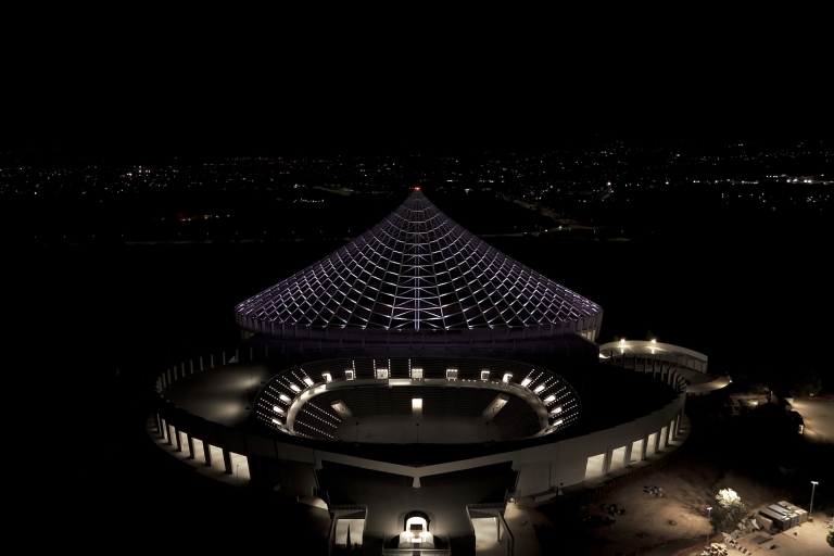 Sustainability ApproachThe lighting system has been carefully designed to respect the natural setting of the site while maximizing its visual impact. The main illumination is focused on the front façade, facing the sea and the sunset, while the rear side, overlooking residential areas and the natural park, remains in shadow. LED projectors placed along the base and sides create a gradual transition toward the darker areas, while shadows, intentionally integrated into the concept, emphasize the three-dimensionality of the structure and enrich the viewer’s perception. To ensure maximum precision, RGBW projectors with narrow optics are used to avoid unwanted light spill, while DMX control allows for fine adjustments of white tones and provides an infinite palette of colors for special events such as the 2025 Jubilee. The entire system is powered by photovoltaic panels, ensuring a self-sufficient and eco-friendly.
