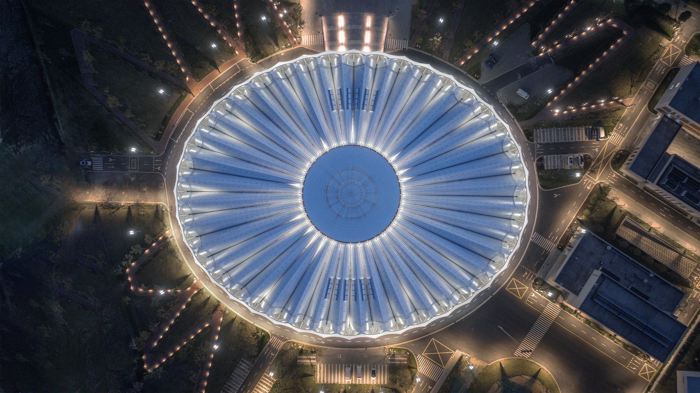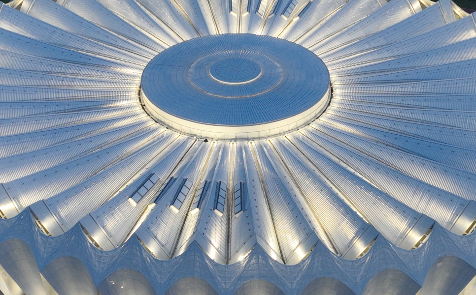 Wheel of Light – Roof-mounted projectors highlight the spoked system, suggesting rotating hubs, amplifying the stadium's identity.