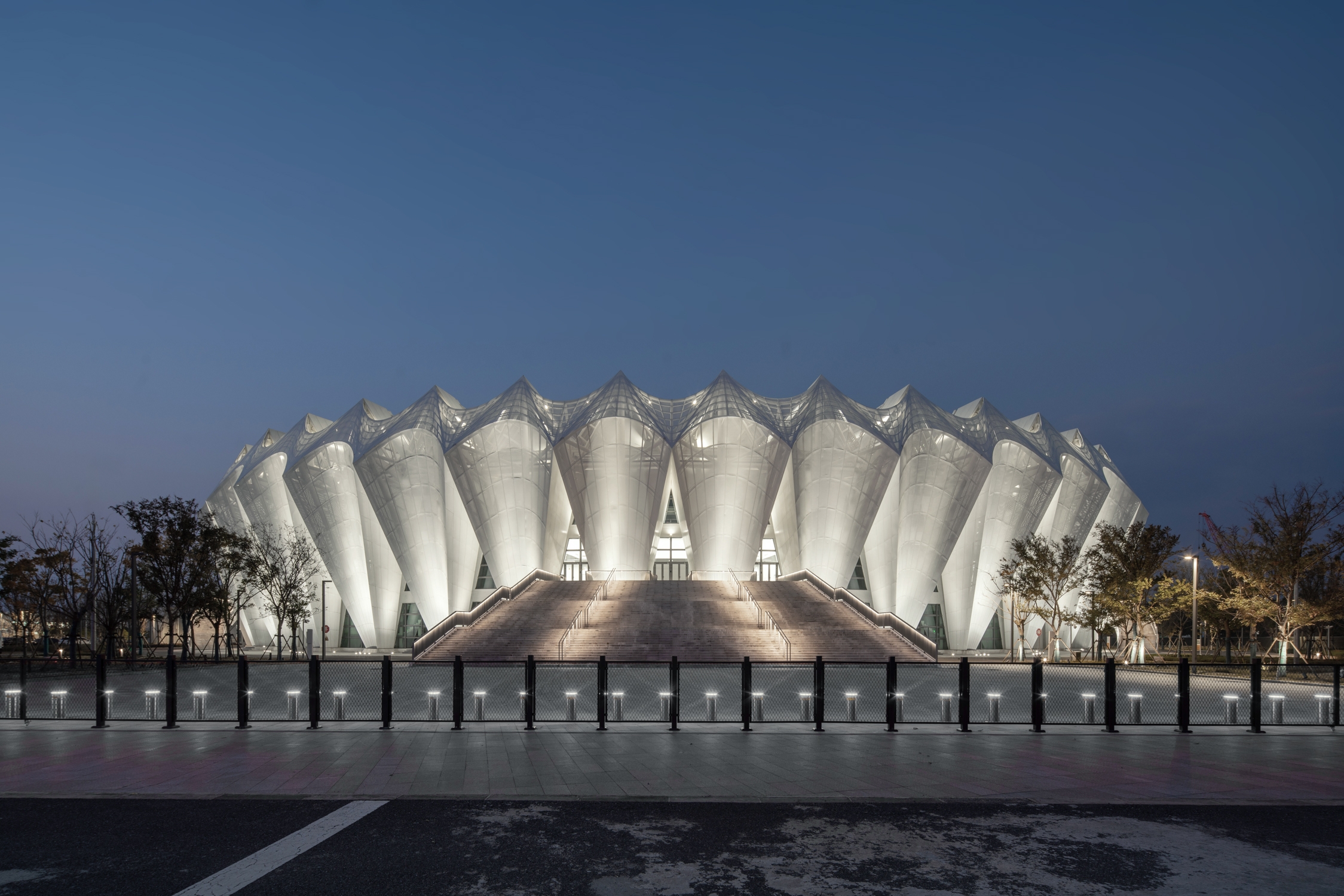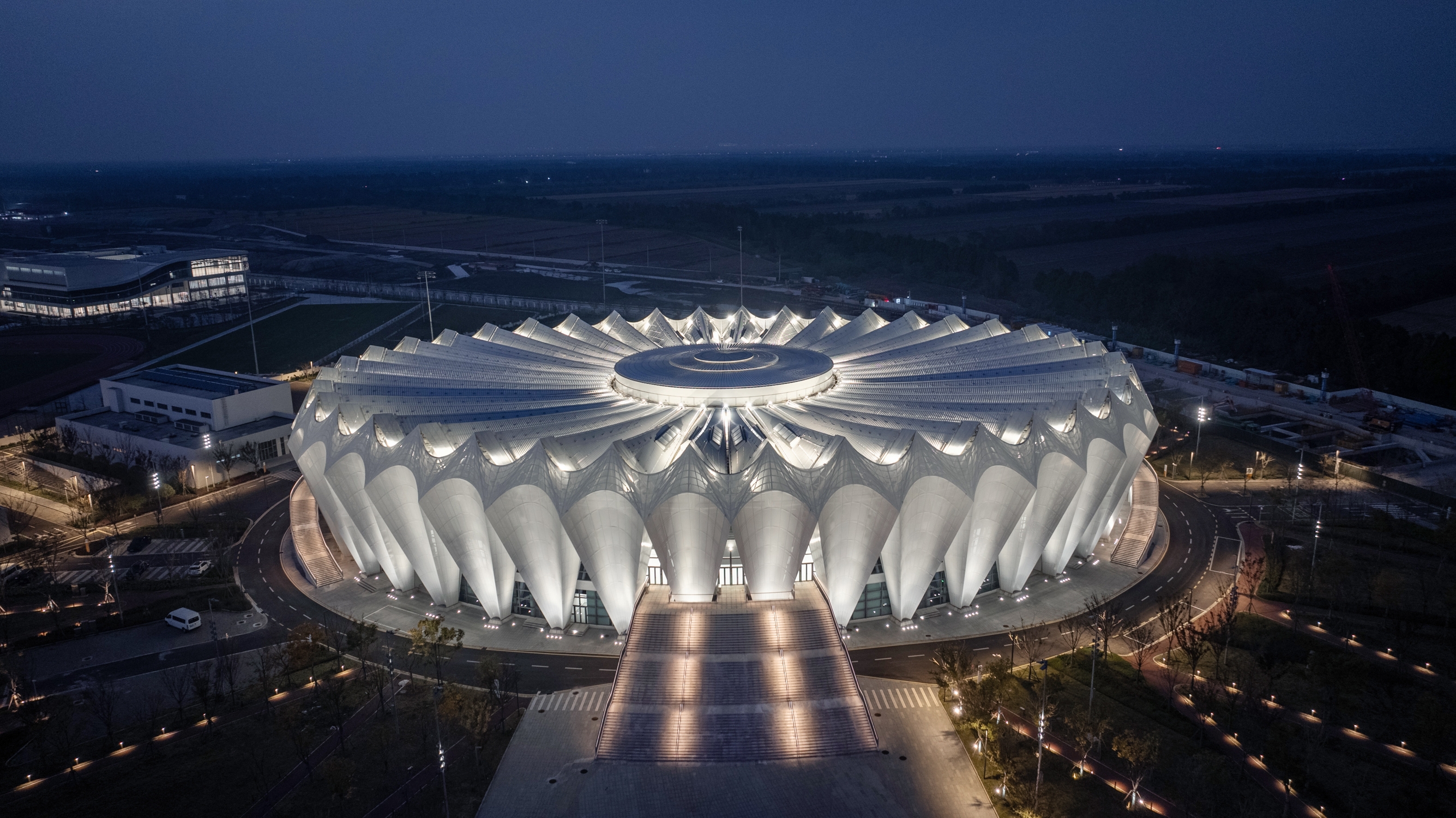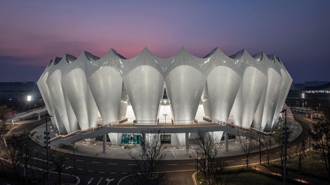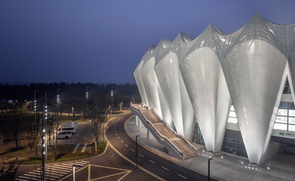 Situated on Chongming, a national ecological island, the design draws on local reed imagery. The façade adopts concave hyperbolic arcs forming rhythmic white petals. Aluminum and glass panels, shifting between solid and void, create a crown-like composition. The roof reinterprets a bicycle wheel: a spoked cable system produces dynamic serrated radiance, expressing speed and rhythm.