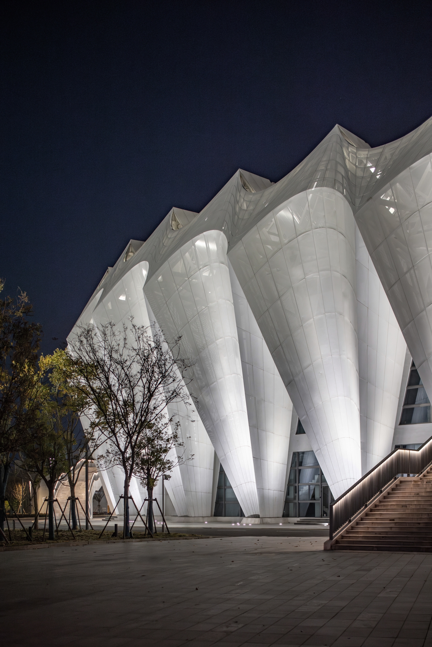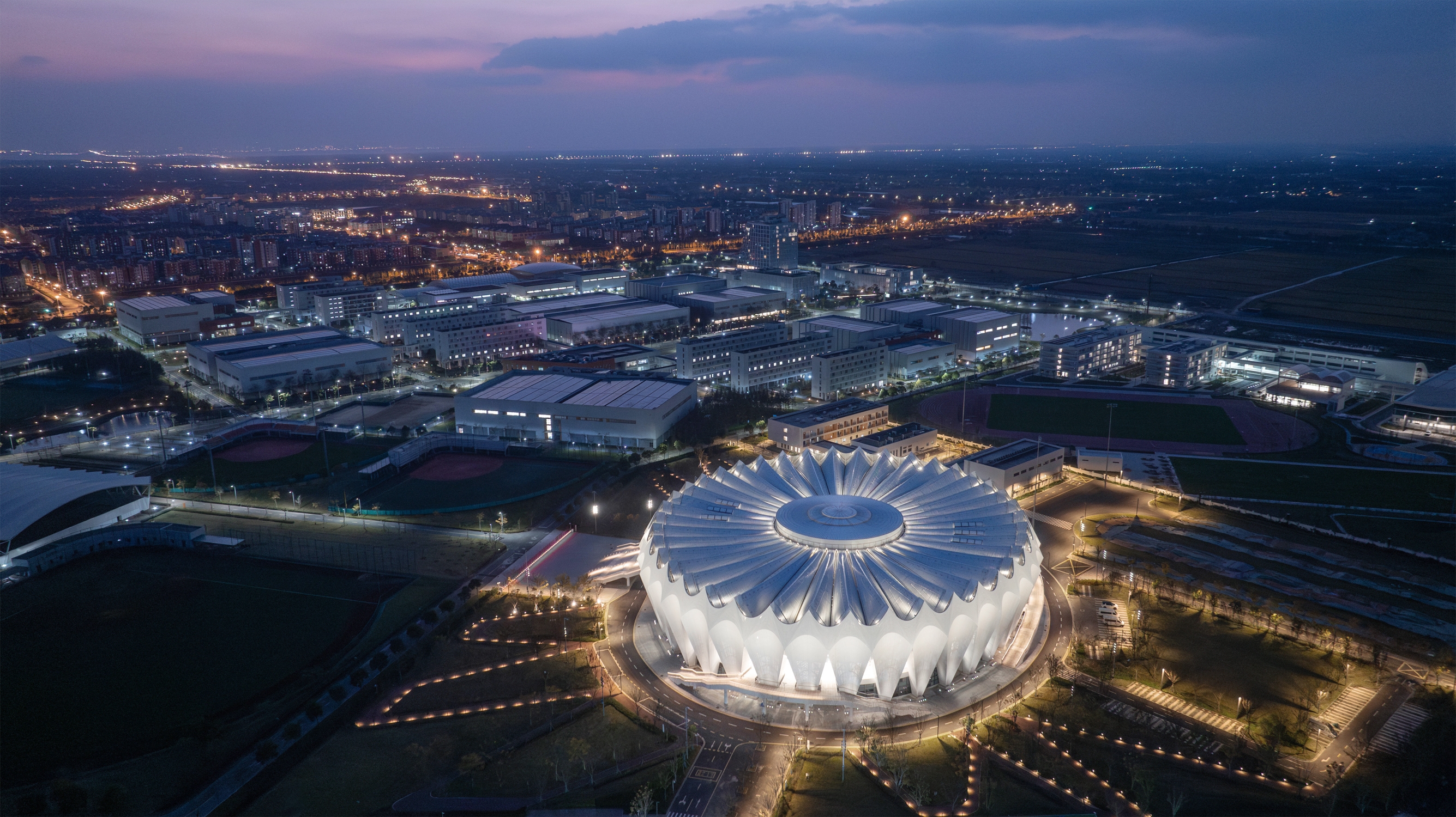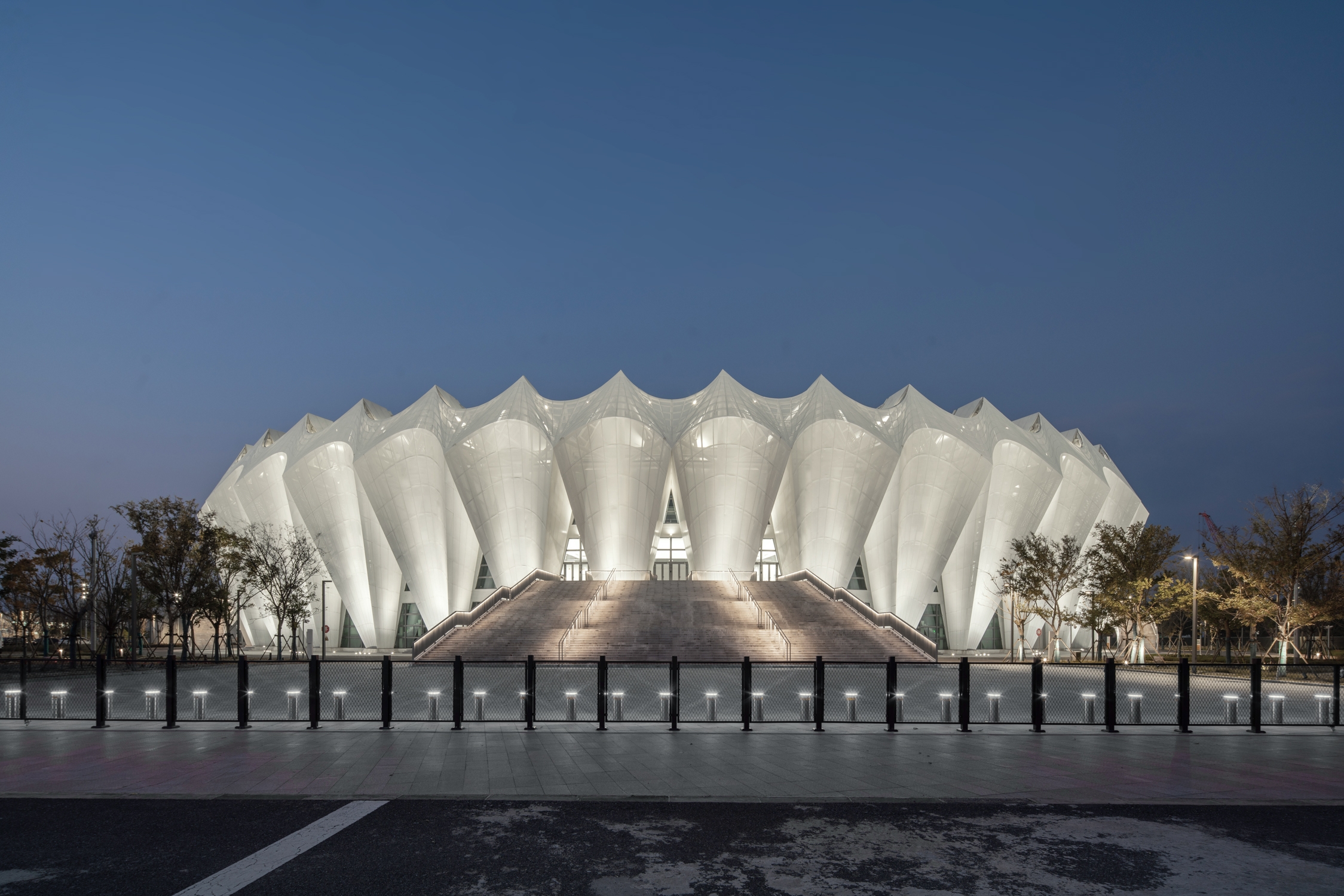 Situated on Chongming, a national ecological island, the design draws on local reed imagery. The façade adopts concave hyperbolic arcs forming rhythmic white petals. Aluminum and glass panels, shifting between solid and void, create a crown-like composition. The roof reinterprets a bicycle wheel: a spoked cable system produces dynamic serrated radiance, expressing speed and rhythm.