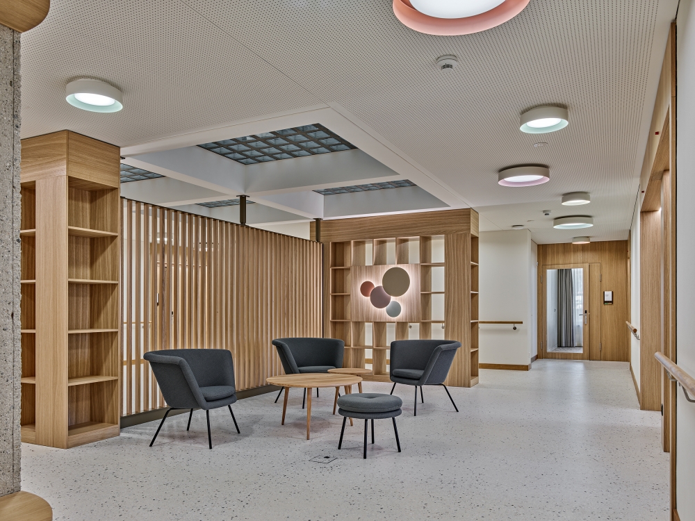 The lighting concept for the nursing home was developed with a focus on both functional and emotional needs, enhancing spatial quality and aesthetics. Emphasis was placed on vertical surfaces in central areas to improve the visual structure of the spaces and make it easier to navigate. This approach enhanced the perceived spaciousness, making the environment more inviting and helping residents find their way.