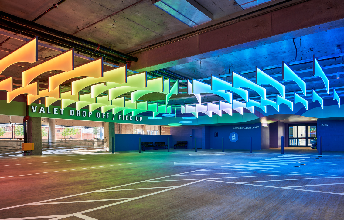Entry DescriptionA hospital visit for a child is often an experience marked by anxiety, fear, and a sense of helplessness. While many children’s hospitals incorporate playful design elements to ease these emotions, such attention rarely extends to the parking garage. For this project, the client sought to evoke a sense of wonder and excitement from the moment the young patient, ensuring their experience began on a positive note. By immersing visitors in a gently shifting wash of colors, the design redirects the child's focus to the vibrant hues and movement, fostering the hope that this will be a fun and uplifting experience.