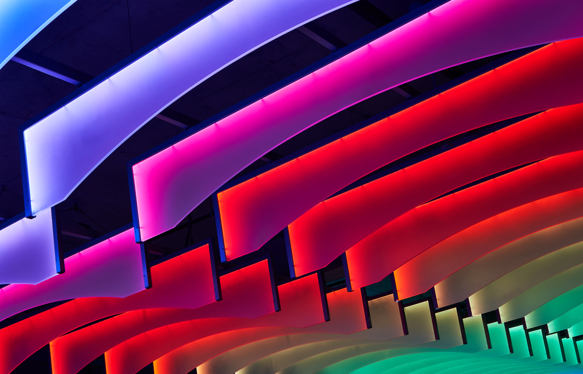 The original concept envisioned longer, undulating panels; however, value engineering led to a refined arc shape that conveys an implied “hug.” Initially conceived with color-changing pixels within each panel, the final design uses each panel as a single pixel—simplifying installation while achieving visual impact and reducing fixture and controls costs.