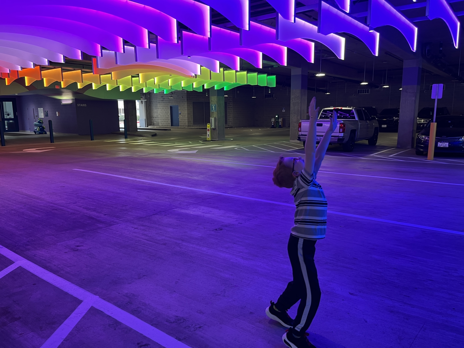 Detailed calculations were performed to ensure proper functional lighting below, and so that the adjacent UFO-style garage lighters would not wash out the color saturation of the panels. The client is delighted with this cost-effective solution, which successfully achieves the desired immersive effect. Even the Google directions link for this location indicates “ My kids love the lights on the bottom level.”