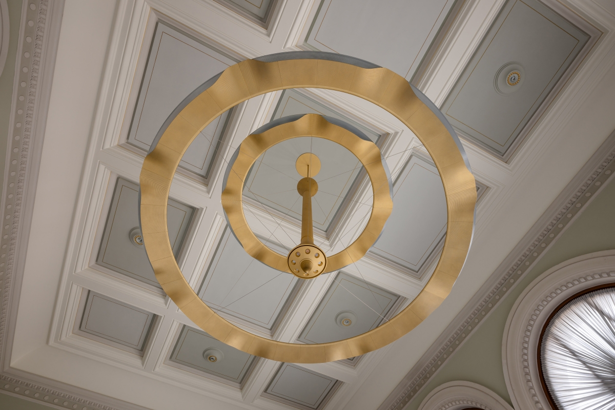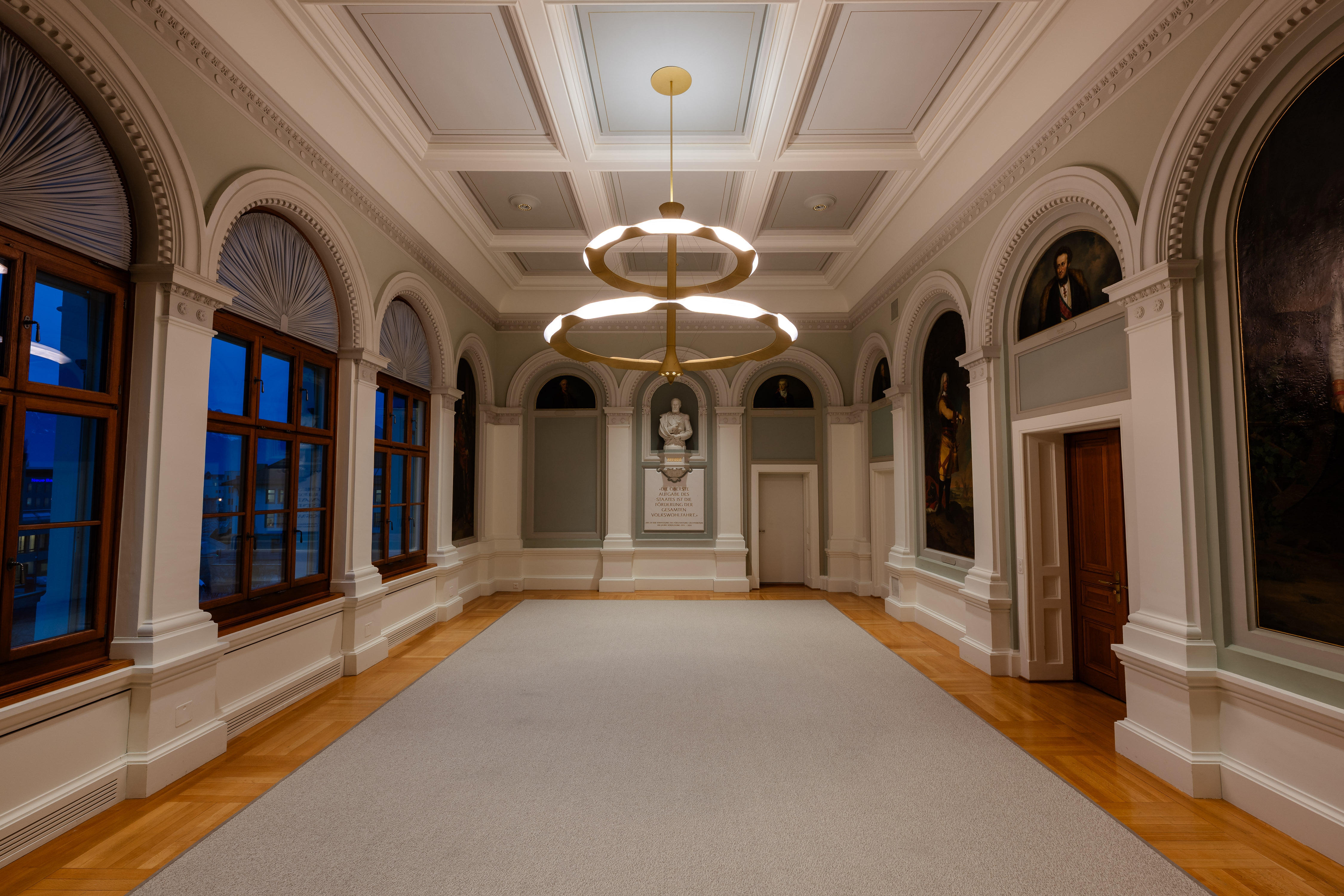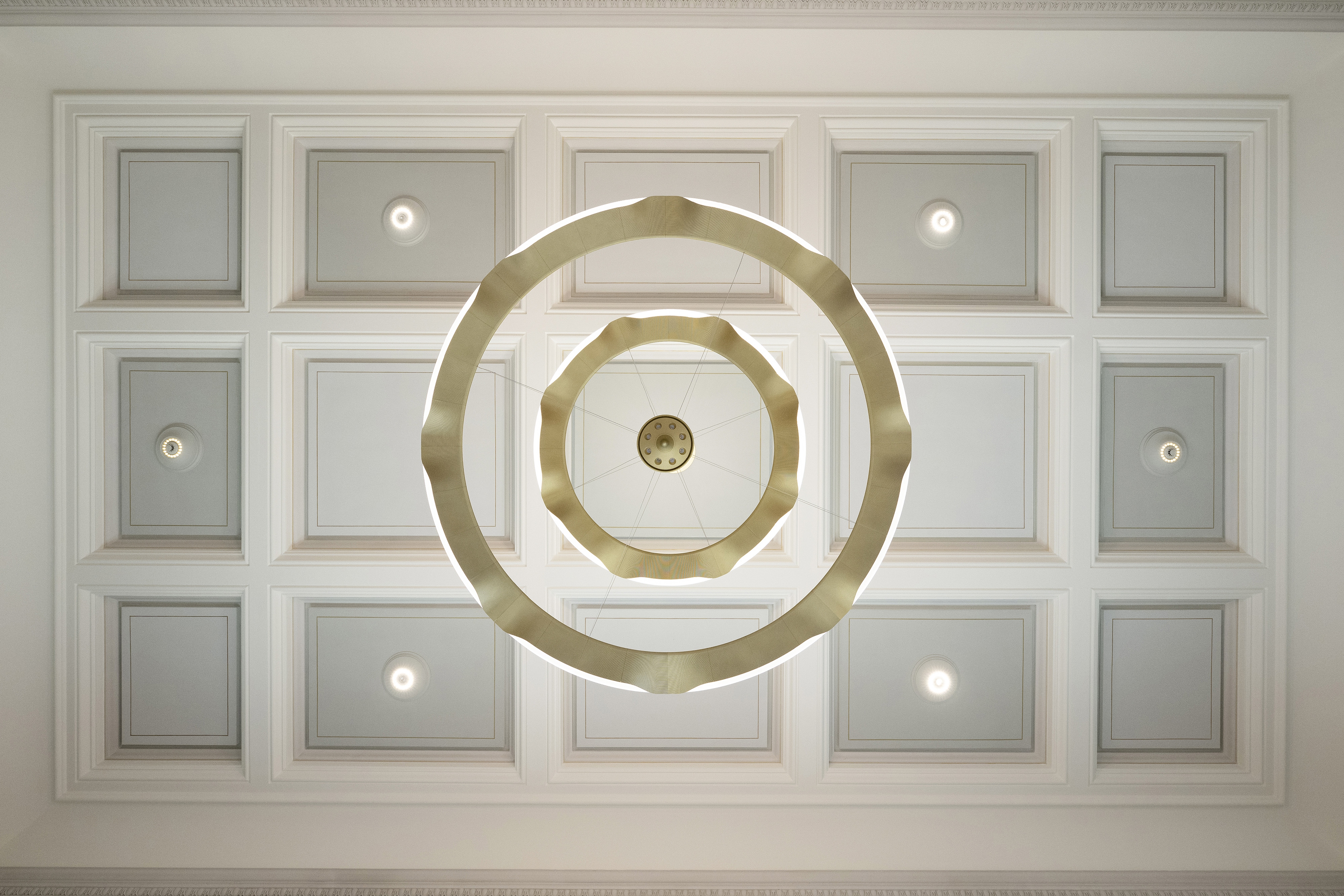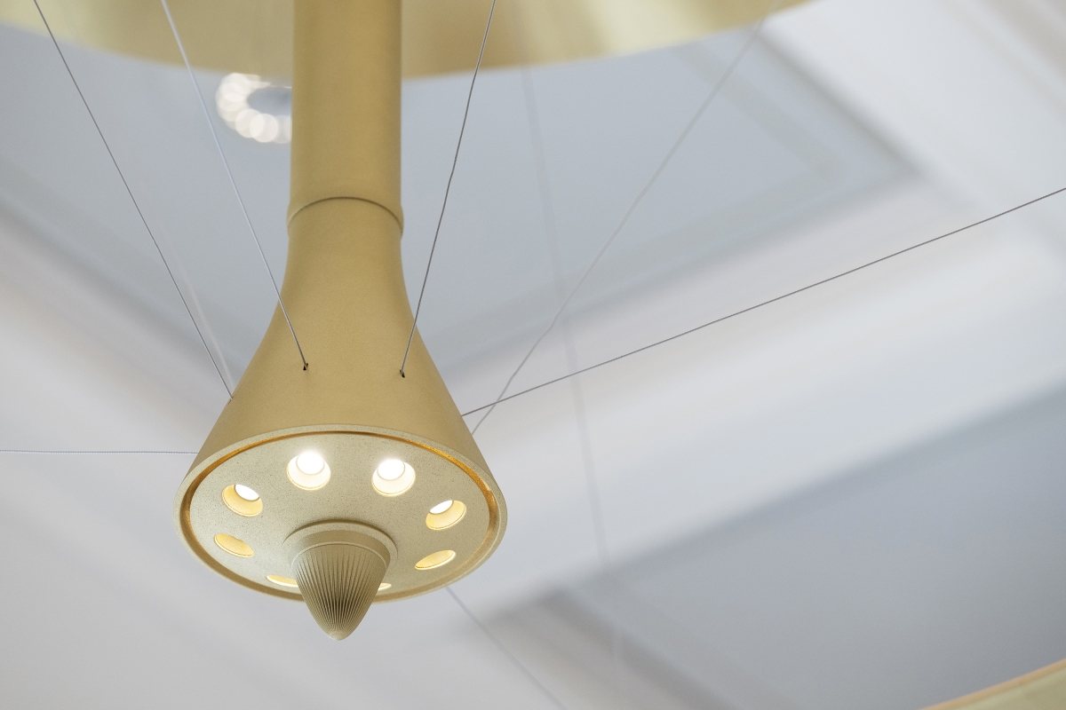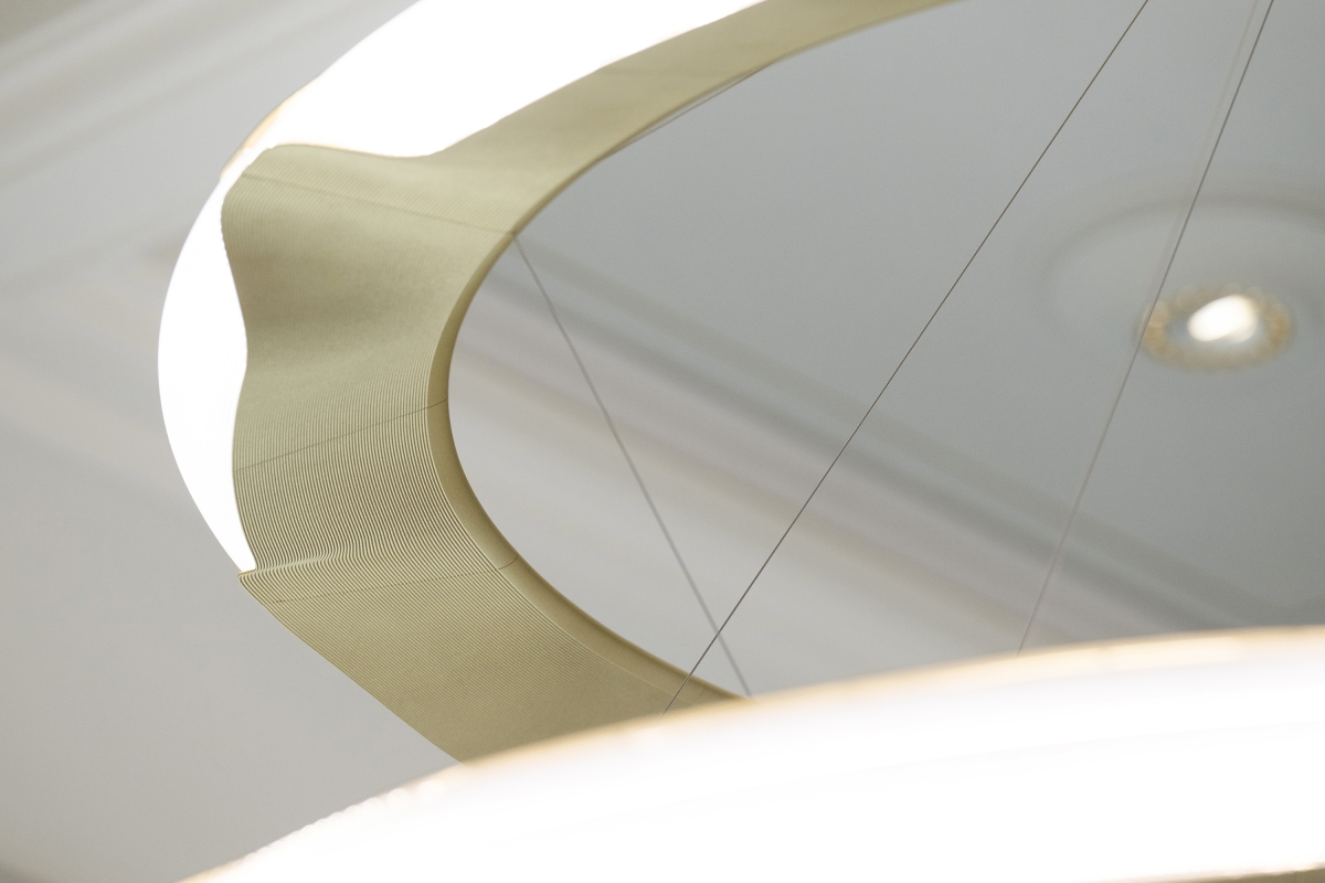 Sustainability ApproachThe lighting concept follows a design-to-cost and design-to-impact strategy, combining ecological responsibility with cultural sensitivity. By retaining all existing ceiling openings, no heavy structural interventions were required, preserving both materials and heritage value. The chandelier’s 3D-printed construction in lightweight aluminium and plastic minimizes resource use, enables efficient production, and reduces weight by 85%. The additive process—unique in Europe at this scale—supports low-waste fabrication and design precision. Energy consumption was cut by over 90% via LED technology and intelligent light zoning. Custom pleated blinds—proposed by the lighting designer in place of the architect’s curtain solution—revealed the original column structure, restored symmetry, and elevated the room’s representative presence. All systems are KNX-managed, ensuring low-impact performance