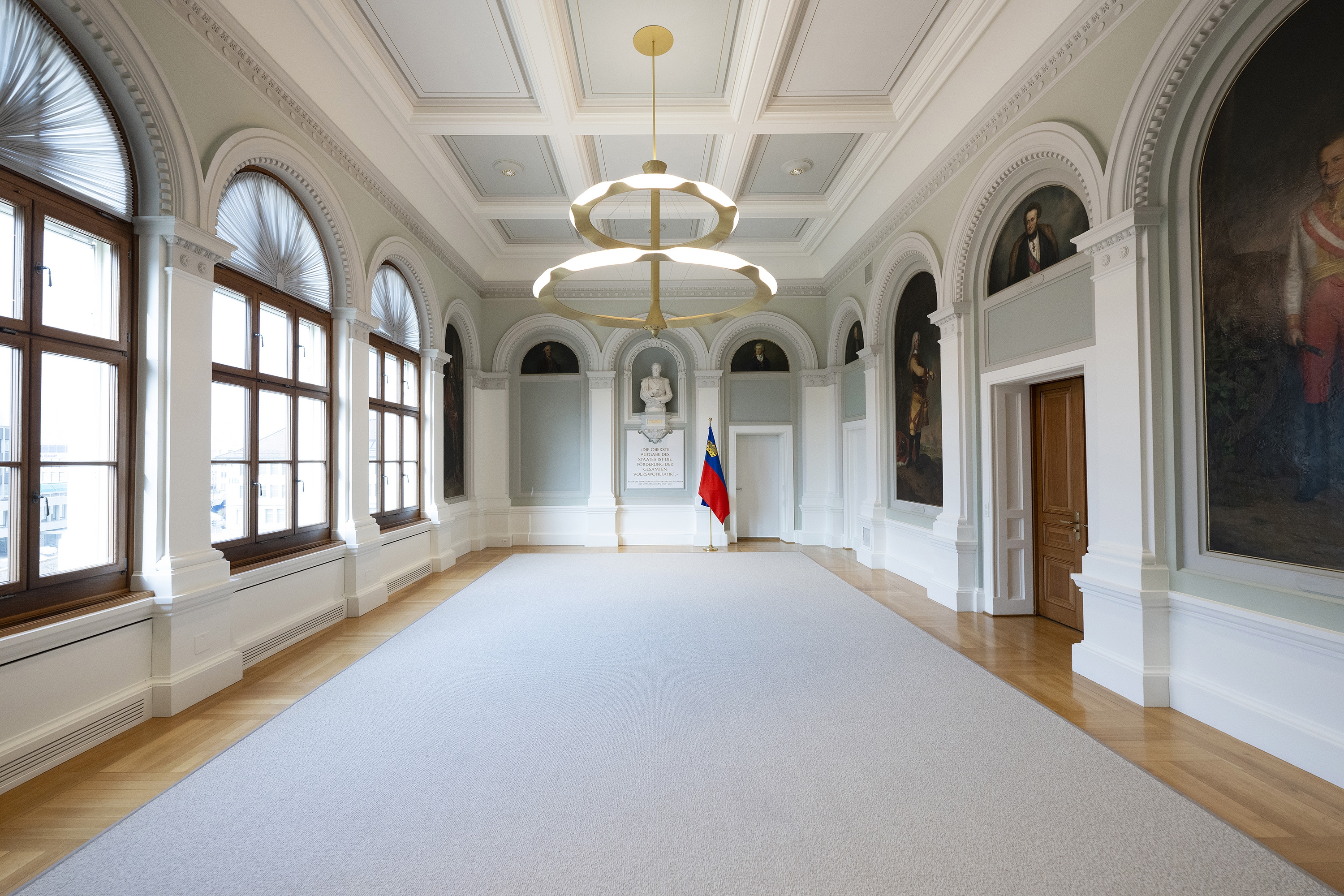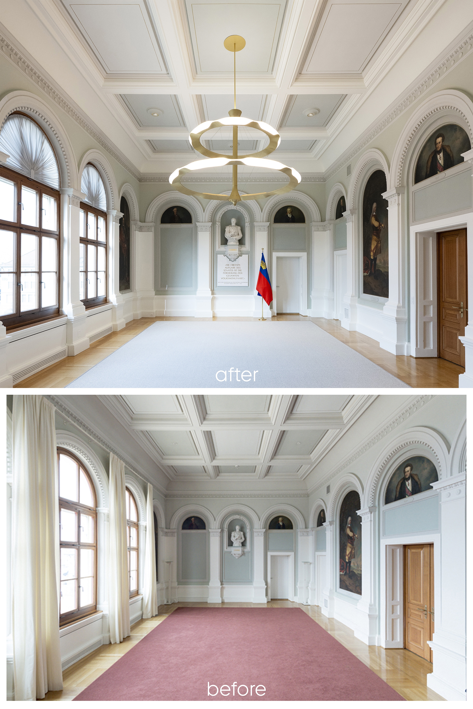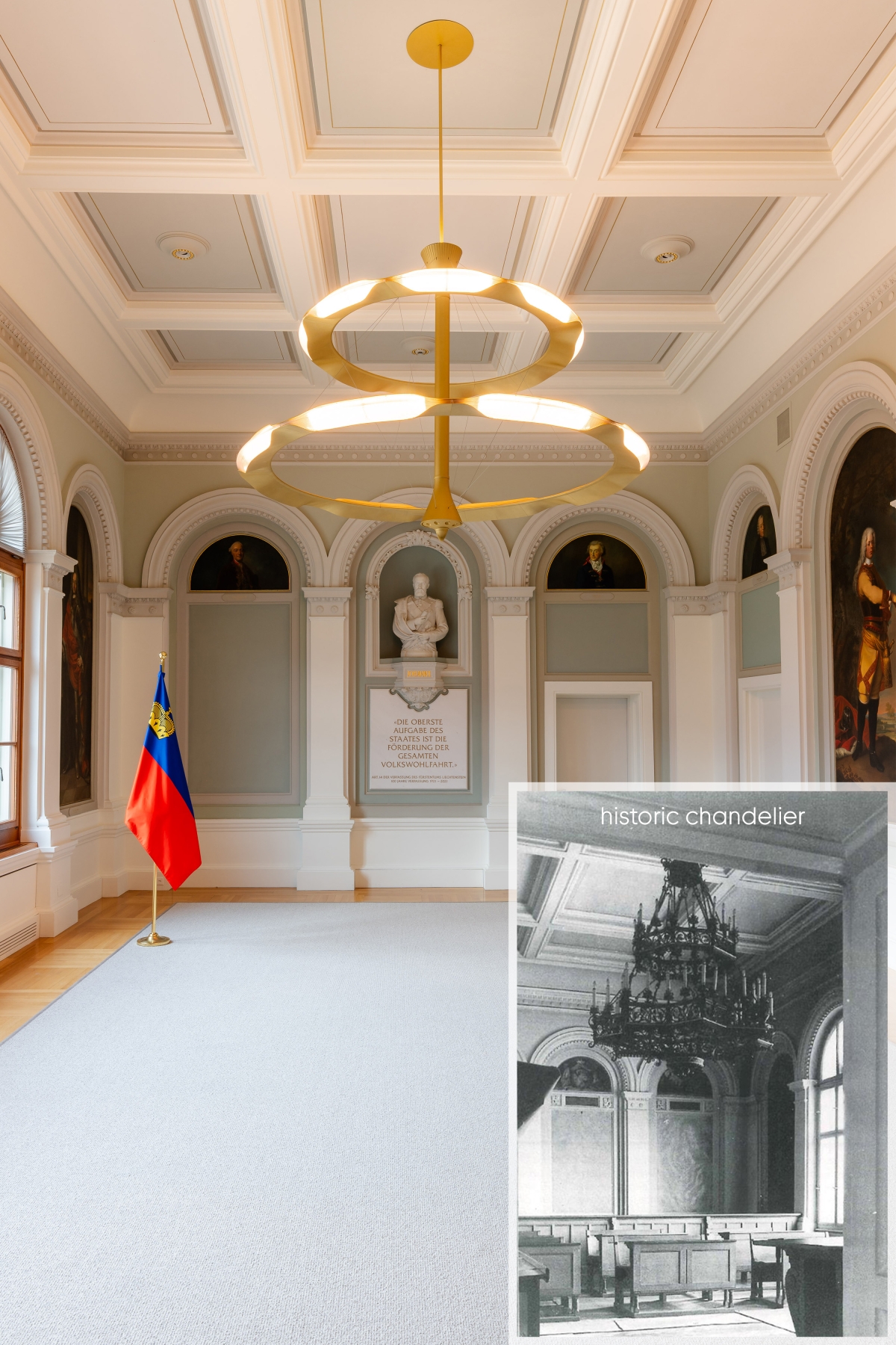Entry DescriptionThe Fürst Johannes Saal forms the representative centre of the Liechtenstein government building in Vaduz. Built from 1903–1905 by Viennese architect Gustav von Neumann, it was conceived as a symbol of national sovereignty. The hall has since served as a central venue for government, parliament, and diplomatic representation. In 2024/25, a careful yet forward-thinking refurbishment redefined its lighting, aligning with both heritage protection and contemporary performance needs. The concept balances preservation and renewal—combining historical identity with cutting-edge technology. A custom chandelier, inspired by the original 1905 piece, anchors the space. Developed by two renowned designers, it reinterprets the historic proportions and symbolism through advanced 3D printing. Its form—evoking a spinning top—symbolizes stability through motion. Free of visible cabling, it floats harmoniously within the coffered ceiling. Integrated downlights and tailored blinds subtly reveal architectural symmetry. Developed within tight heritage constraints, fixed ceiling points, and a six-month schedule, the project relied on precise, adaptive design-to-cost thinking. The result reflects interdisciplinary collaboration and reinforces the room’s symbolic role in national identity and governance. It enhances atmosphere and ceremony—making light a quiet but powerful actor in the political space