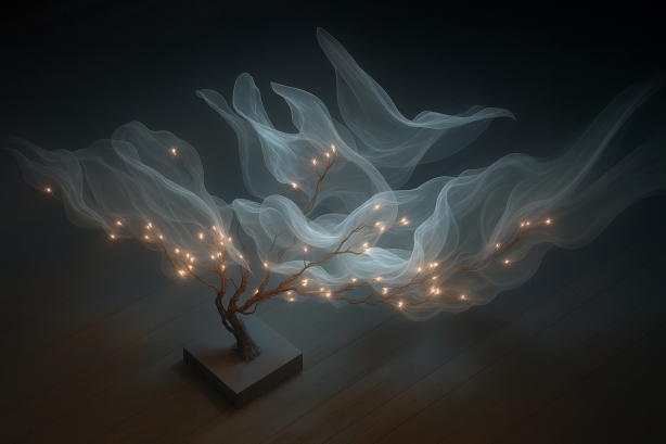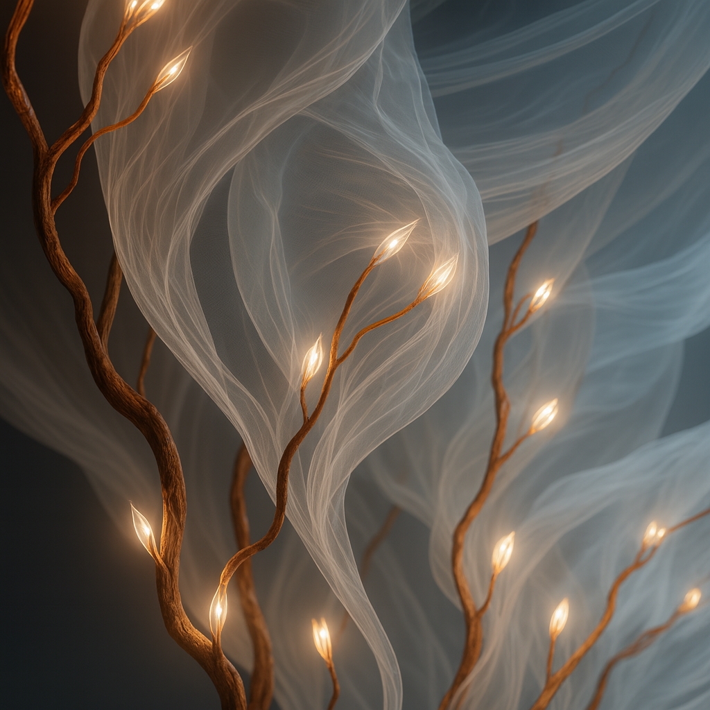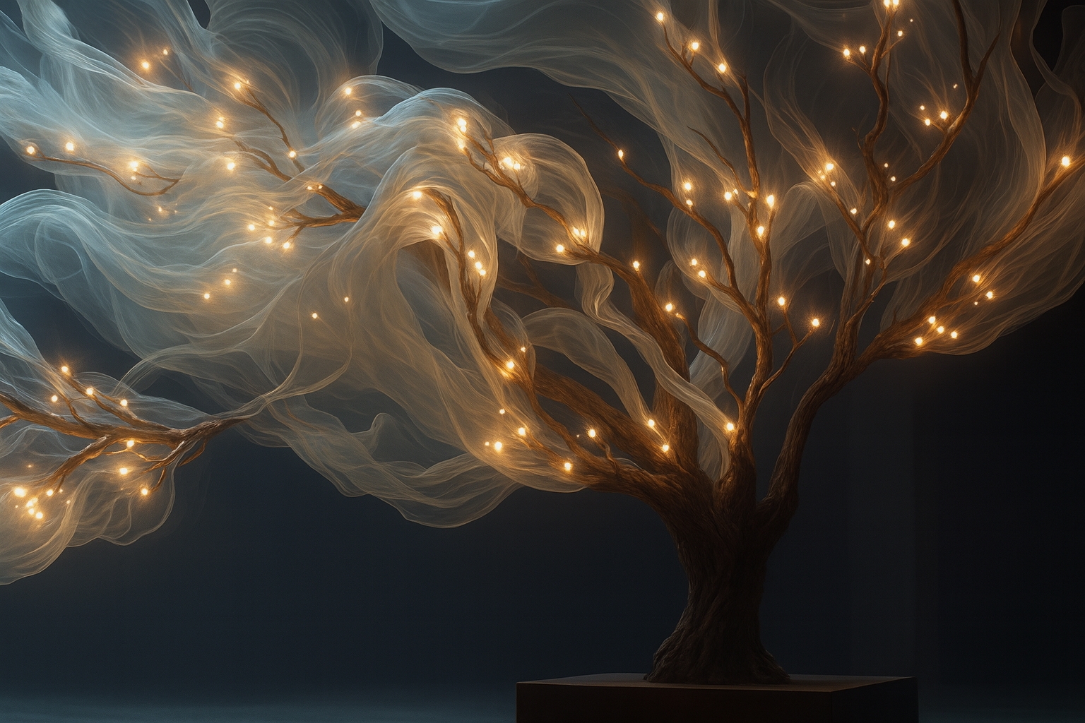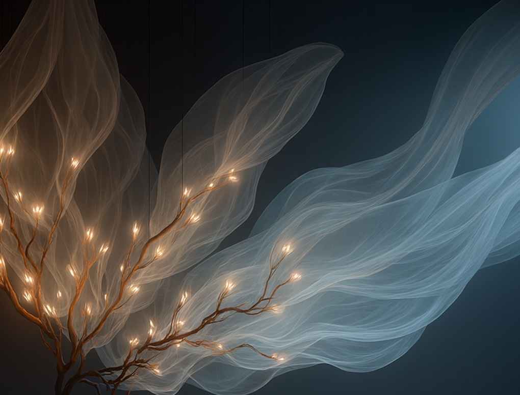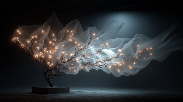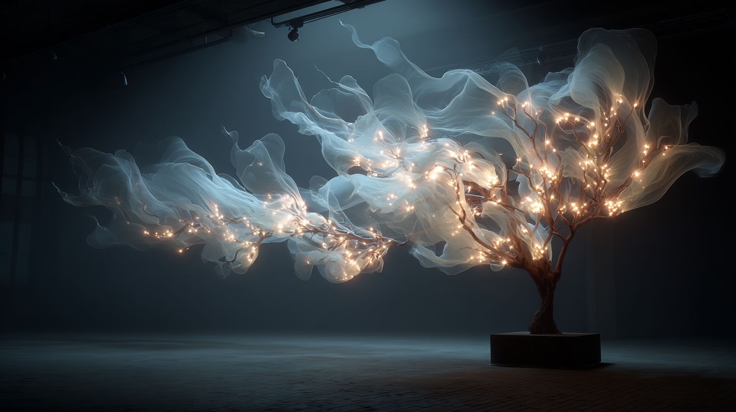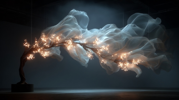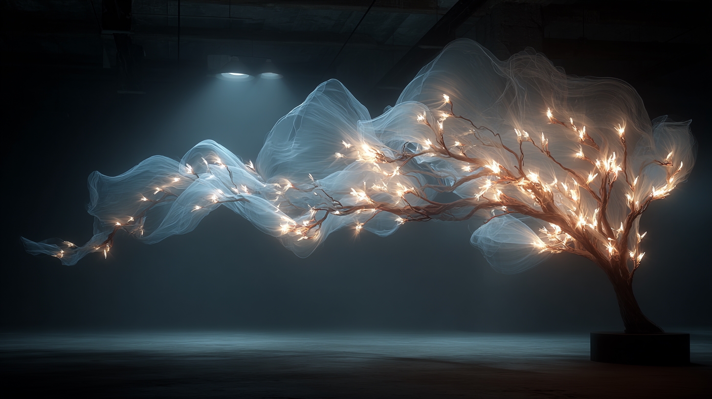 Entry DescriptionEos is an ambient light installation designed for galleries and exhibition spaces. Inspired by the first light of dawn, it transforms light, air, and fabric into a sculptural experience that feels alive. Rather than functioning as a lamp, Eos acts as an environmen an artwork that breathes, reacts, and surrounds its audience with shifting light and motion. At its core, Eos is built like a branching tree form. A powder-coated steel base anchors the piece, while copper and bronze rods extend upward and outward, carrying clusters of soft silicone diffusers. Each diffuser houses an LED node, glowing with warm white light. Around the branches, translucent recycled organza fabric is draped over a lightweight PETG rib structure, forming cloud-like veils that catch and scatter the light. Hidden silent micro-fans gently move the fabric, so the sculpture always appears to be in motion, as if alive. The LEDs are fully addressable, allowing dynamic light patterns. The system includes different modes: Breath Mod: the entire sculpture glows in a slow rhythm, imitating natural breathing.