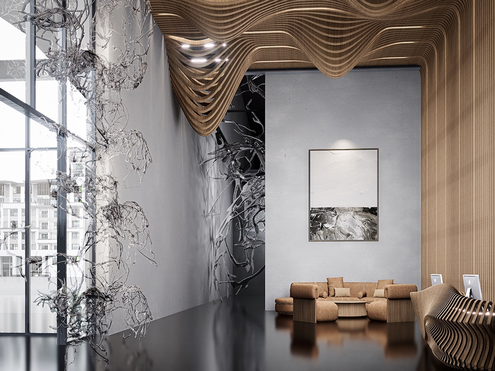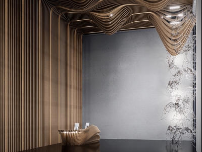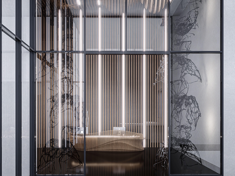 At the entry, warm LEDs integrated into wooden slats and a sculpted ceiling establish an ambient glow and architectural emphasis. A semi-opaque divider reveals partial views of softly illuminated glass installations beyond, generating anticipation and guiding circulation.