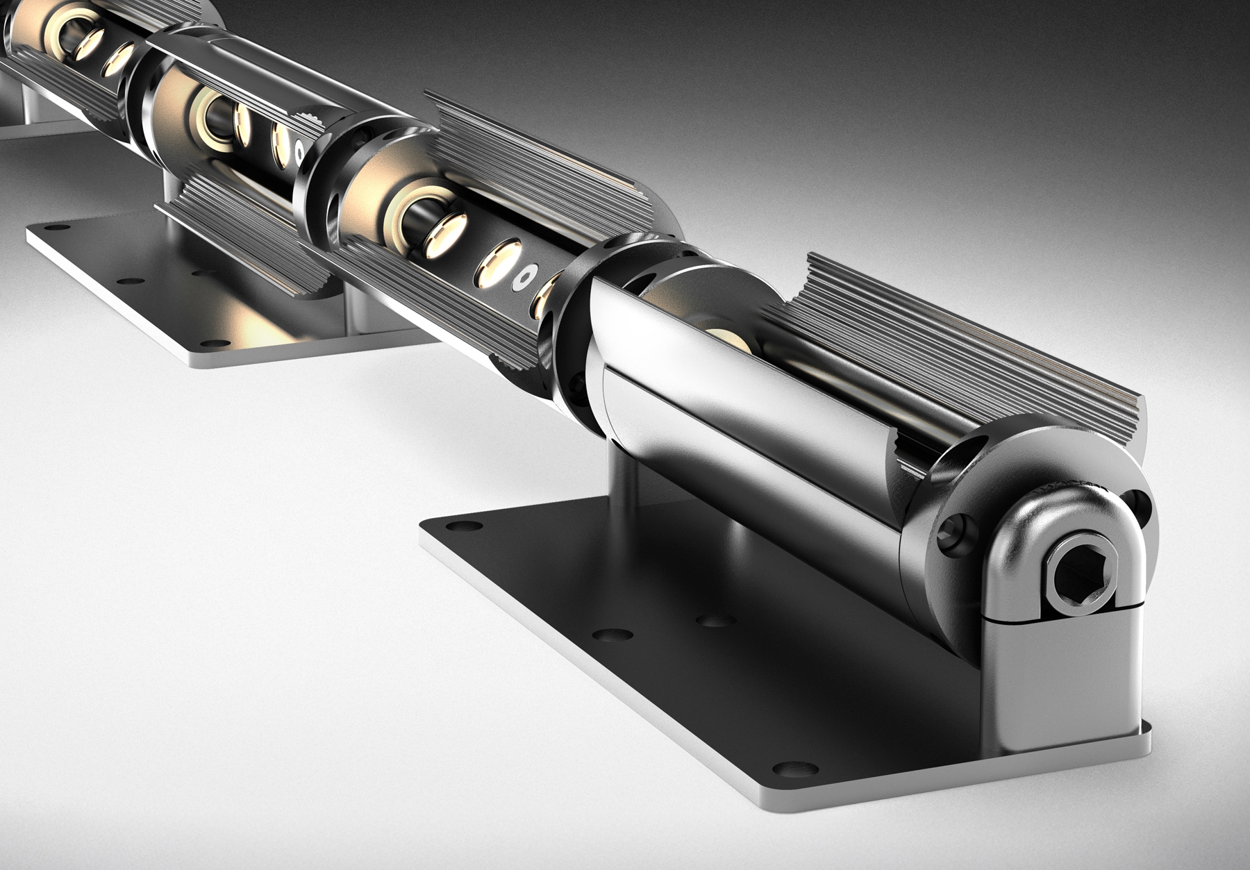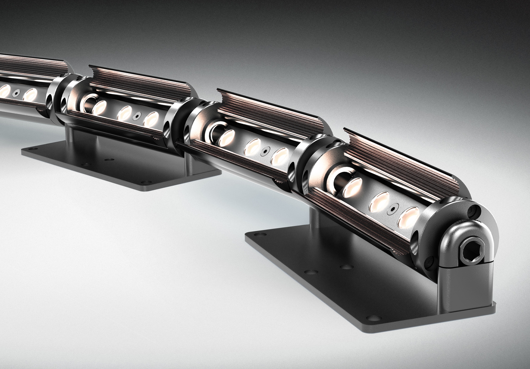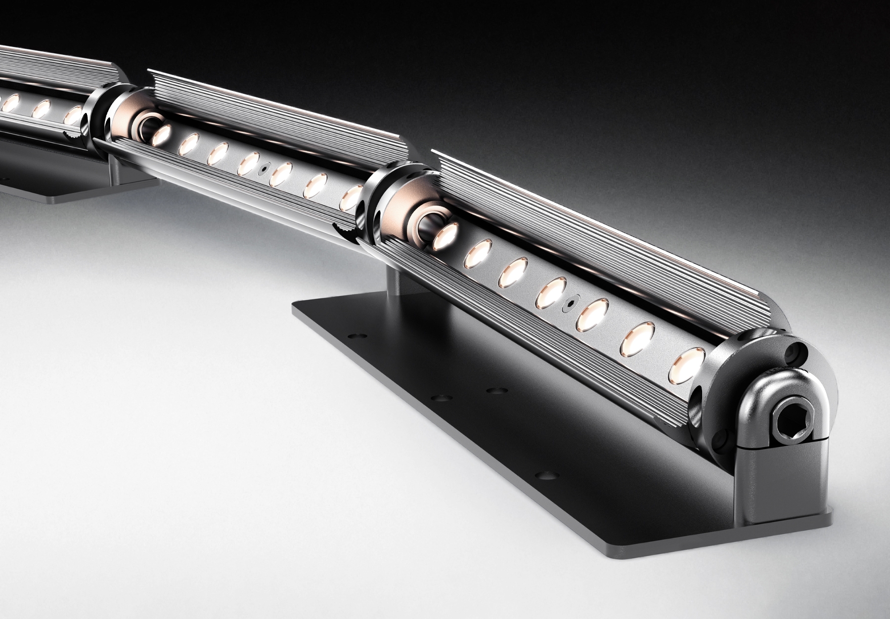 With the latest flexible version, a series of custom-length Flaplight modules are linked with our patented friction ball-joints, allowing for 3-dimensional flexibility. Lighting designers can specify the Flaplight system for a range of interior lighting projects – in fact, anywhere curved lines of light are needed. With this system, you can precisely illuminate non-linear building surfaces, columns, and domes because the body of each module can be rotated and locked at the correct aiming angle. The individual hinged barn-doors can be set to control glare and set the cut-off precisely.