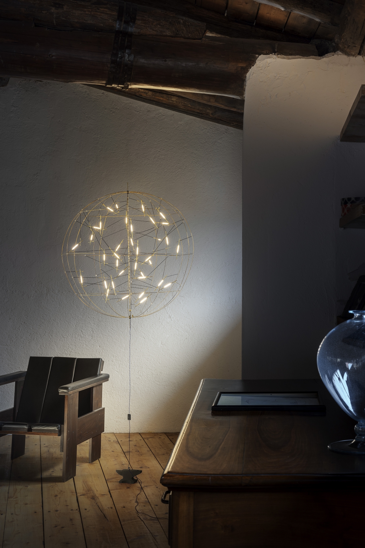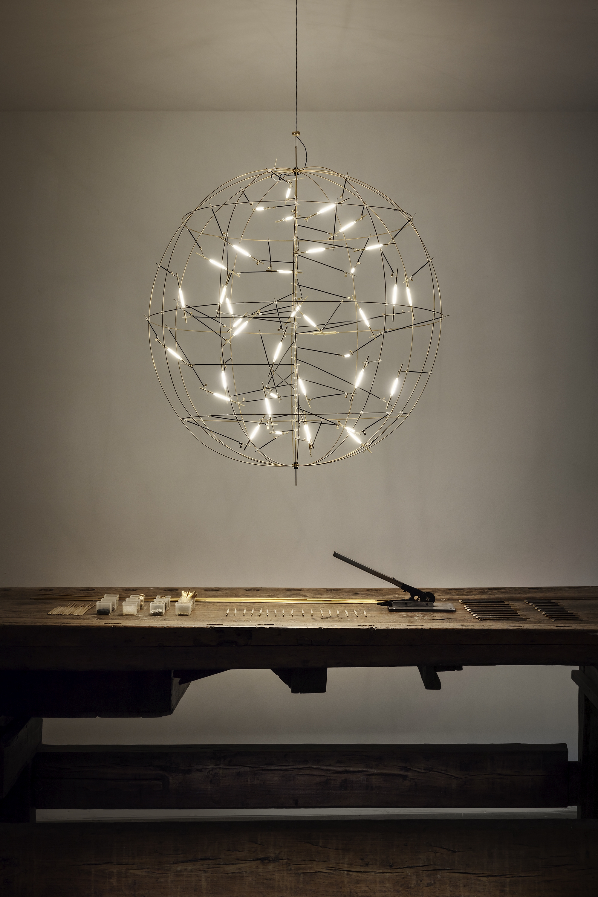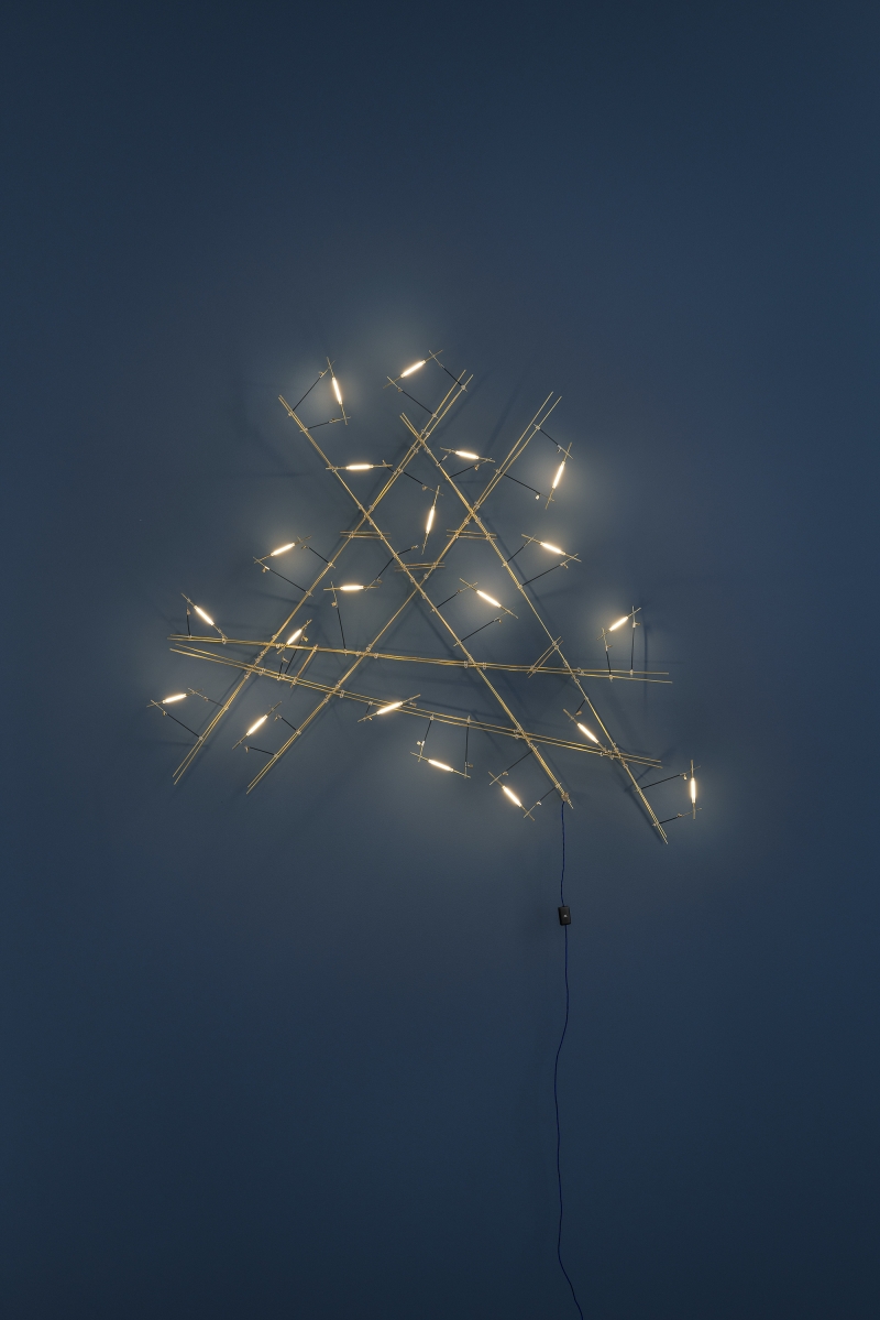 In the Pòta! wall model, featuring 20 ELV LEDs, slender brass rods intersect to create a dynamic geometric pattern. This lamp is available with a wall base and in a version with plug driver. It can be installed on its own or combined with other modules to create striking lighting installations.