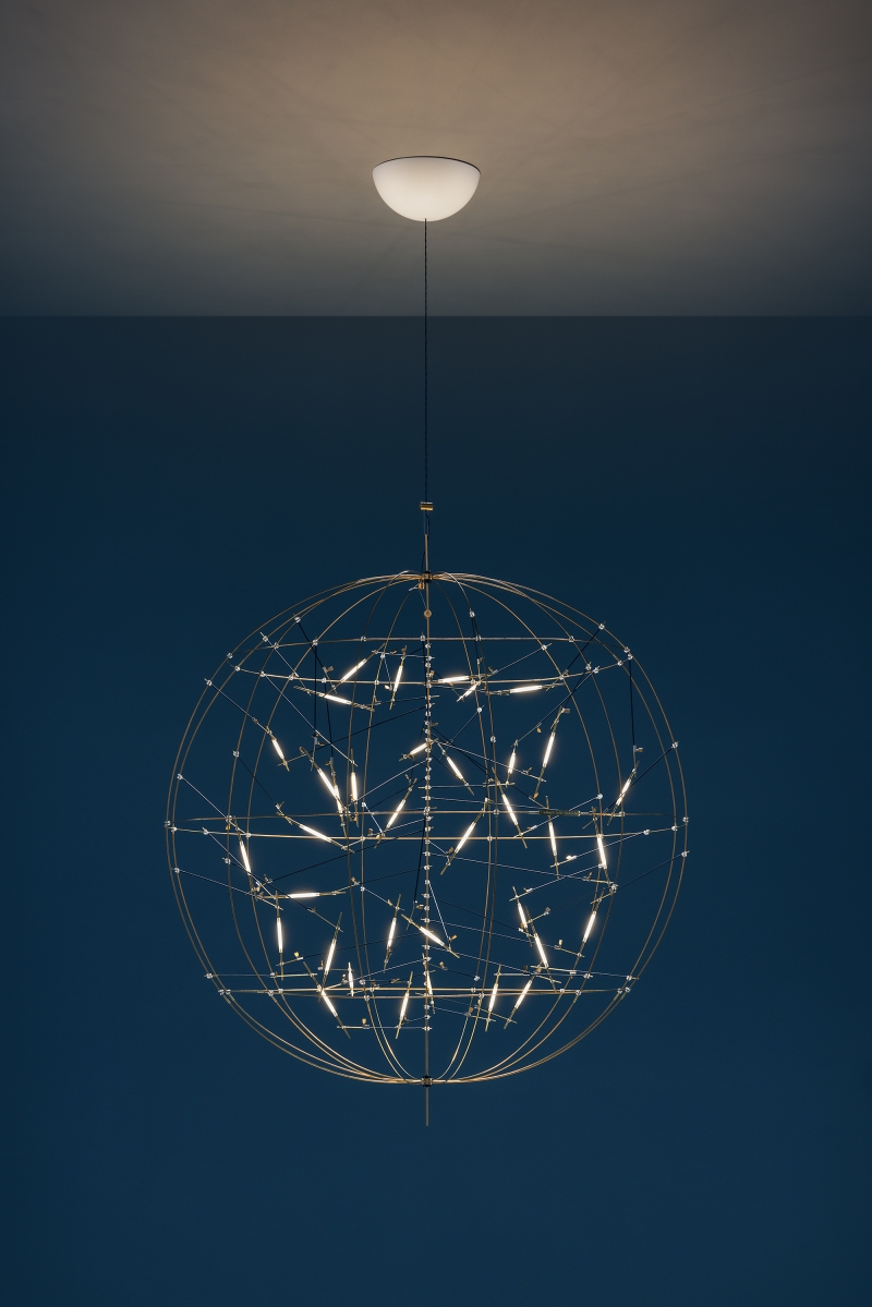 The Pòta! family is composed of four models: the Pòta! pendant lamp has a spheroidal structure, crafted in brass, and is available with a diameter of 50 cm (with 18 ELV LEDs) or 85 cm (with 36 ELV LEDs). The model has a white semisphere base and a blue cable.