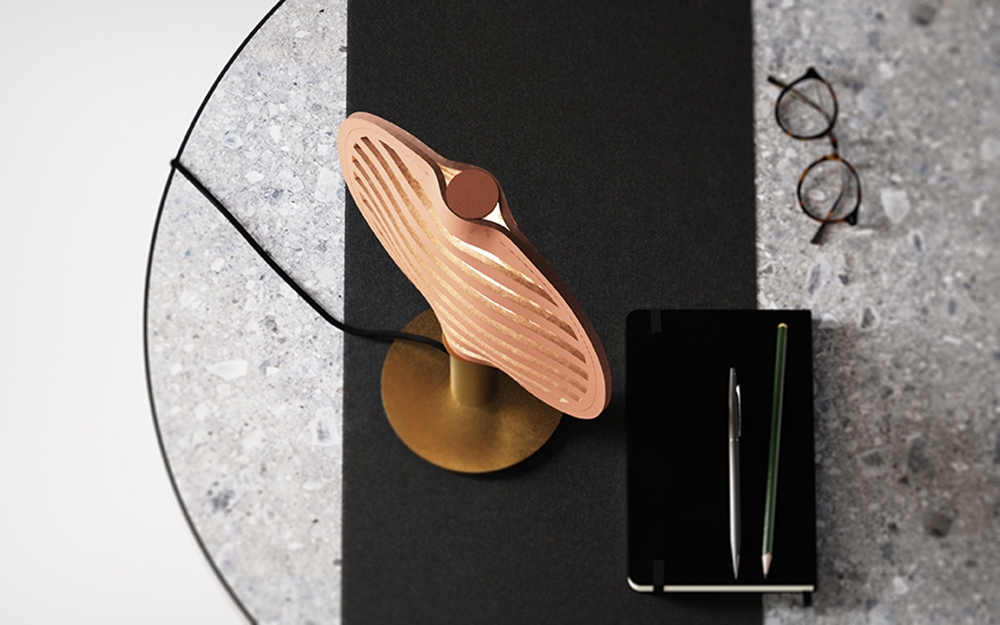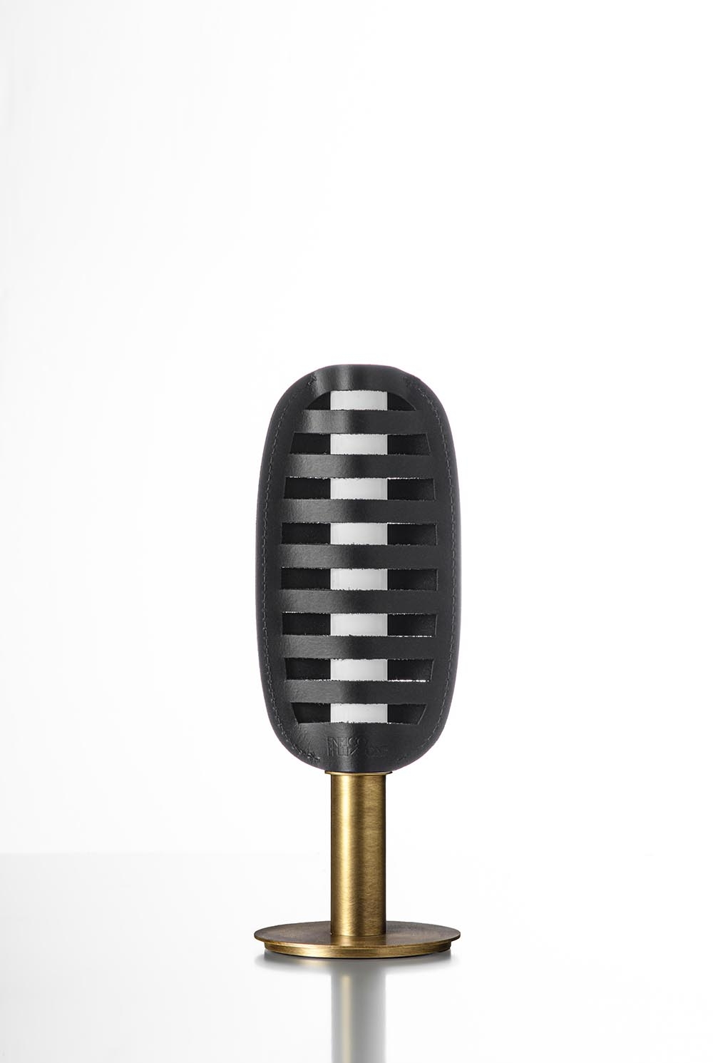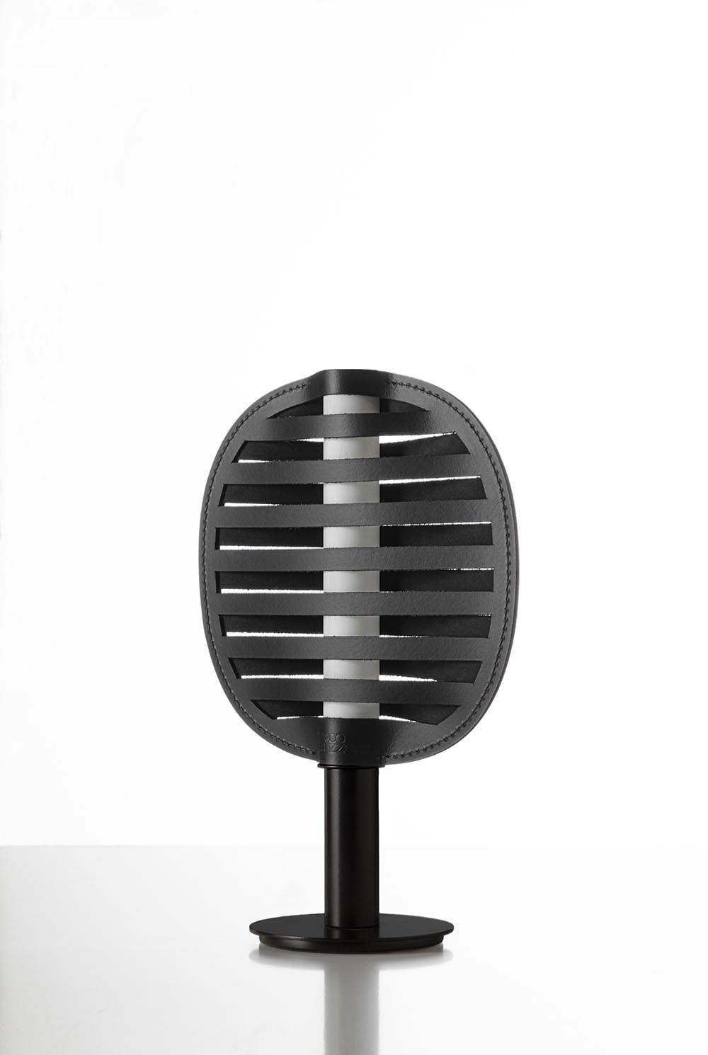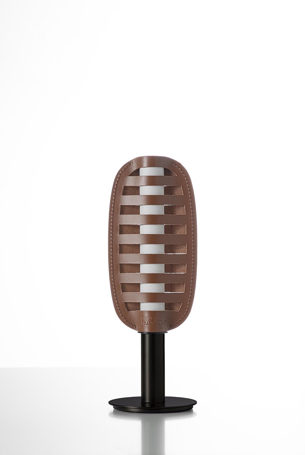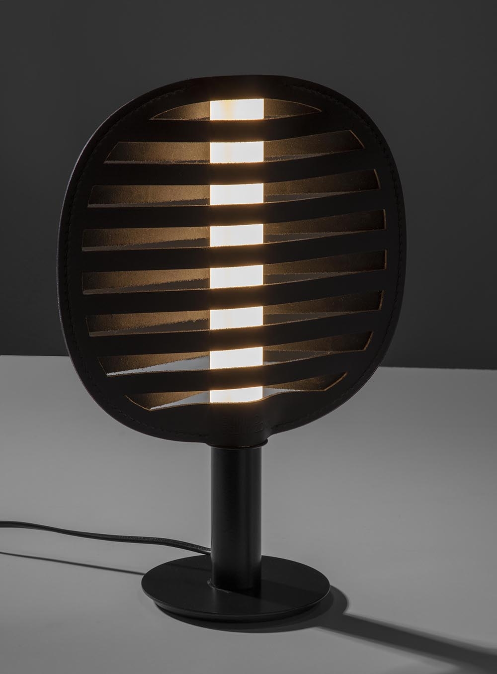 The unique shade design, characterized by alternating cuts, allows even light diffusion on both sides. These cuts serve as both openings for direct illumination and textural elements that modulate brightness, softening and warming the light through reflection on the leather.