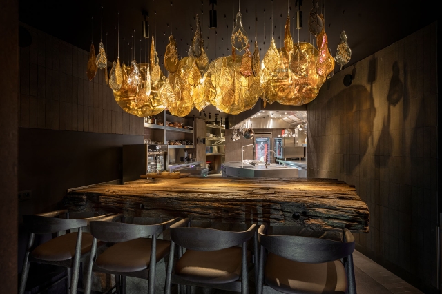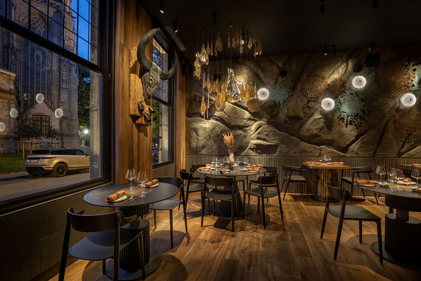 The brightest object of the interior is our signature light-glass chandelier, designed and produced especially for Molfar. Its concept is rooted in the symbolism of the molfar — a fusion of mirrors as a mystical element, fire, and plant motifs. Mirror details are set at different angles, creating multiple reflections of the “fiery” elements, like a magical spell of light. Within the depths of amber shades and warm shimmers, one can discern textures reminiscent of herbs, smoke, and flowing flames. This union of mirror and fire evokes a sense of cozy mystery, infusing the space with magic. And in the restaurant, there are two of them!