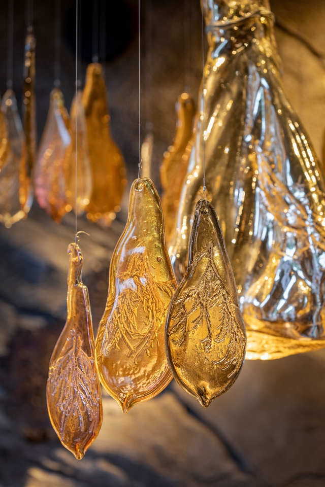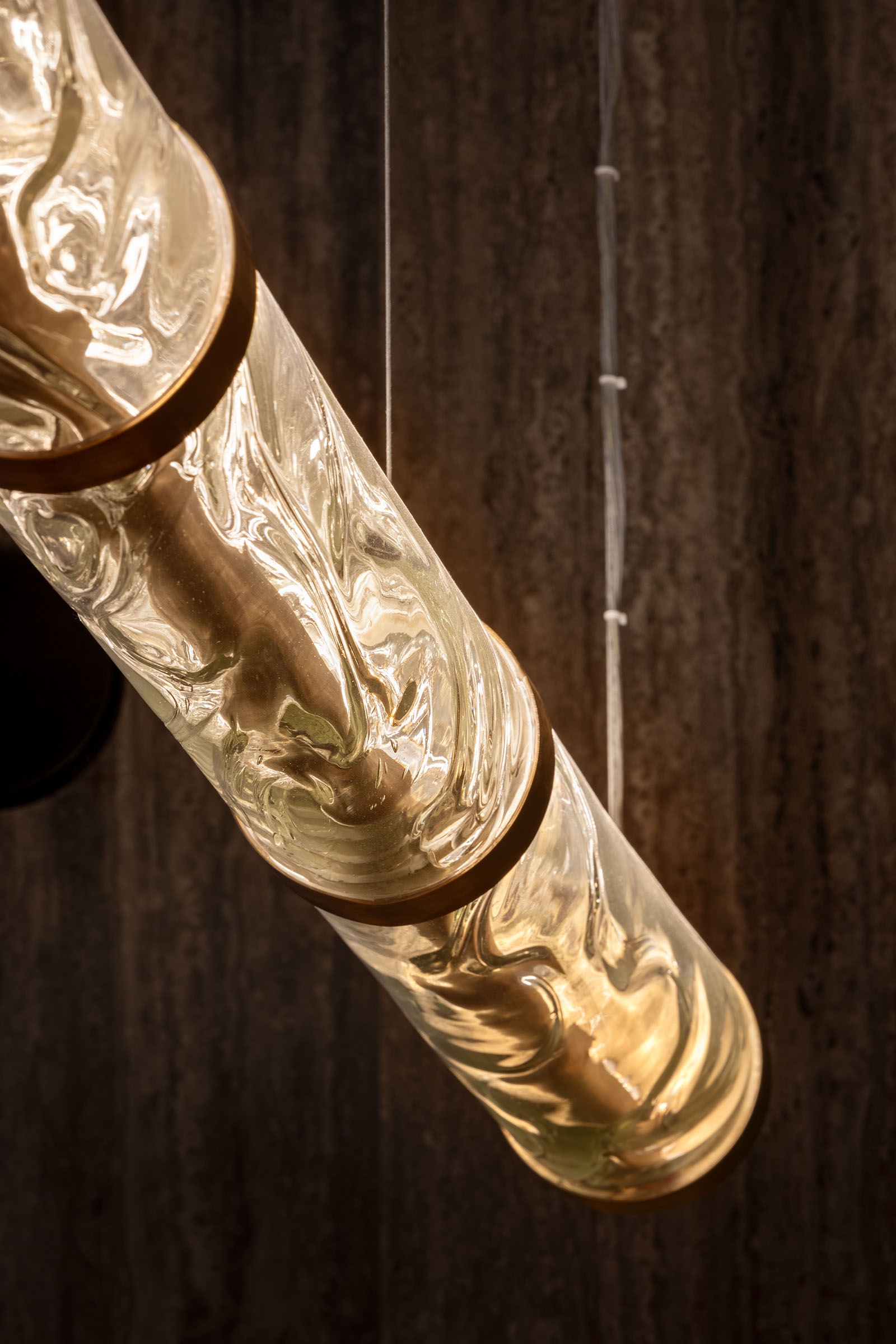 The second focal point is a true caustic “cigar,” a glass vessel holding two independent light sources. The effect is as if smoke is floating inside, painting waves across the walls and ceiling. This luminous pattern constantly shifts, depending on the time of day.