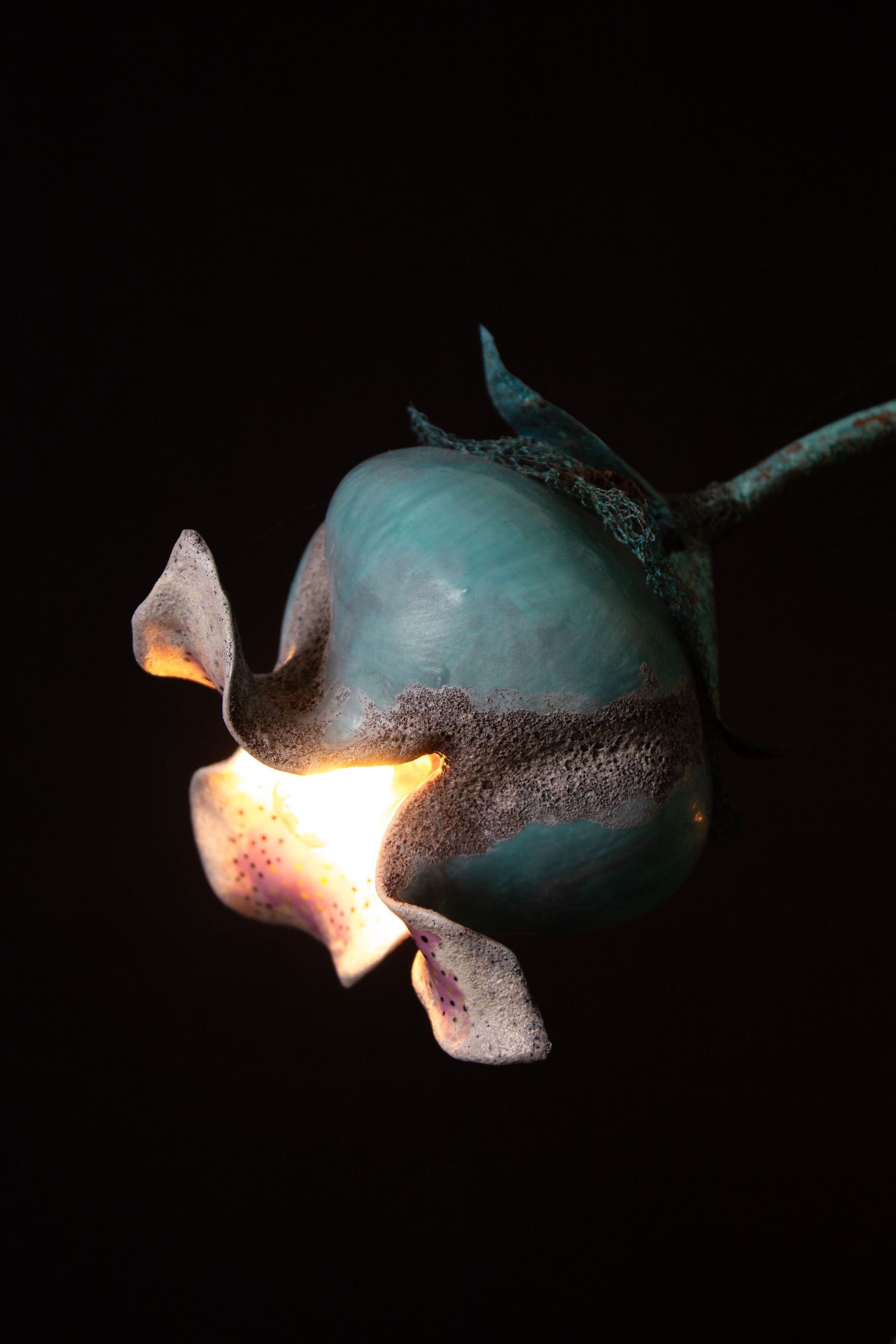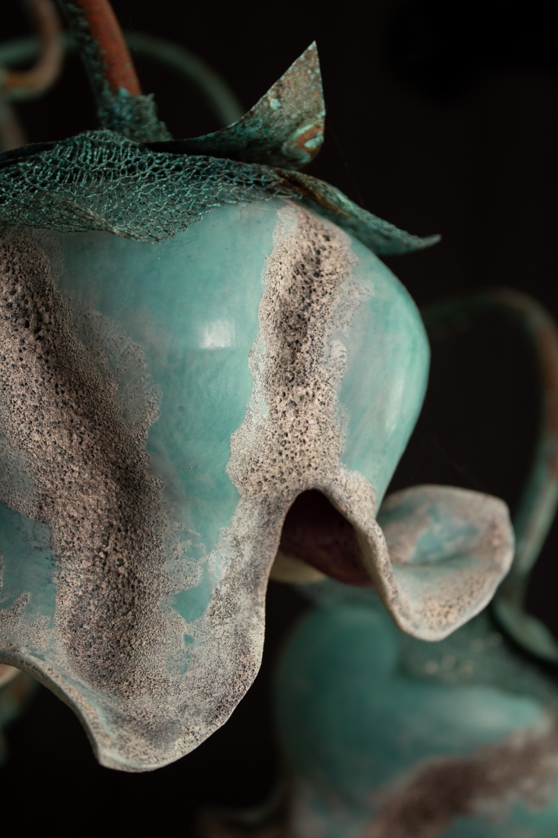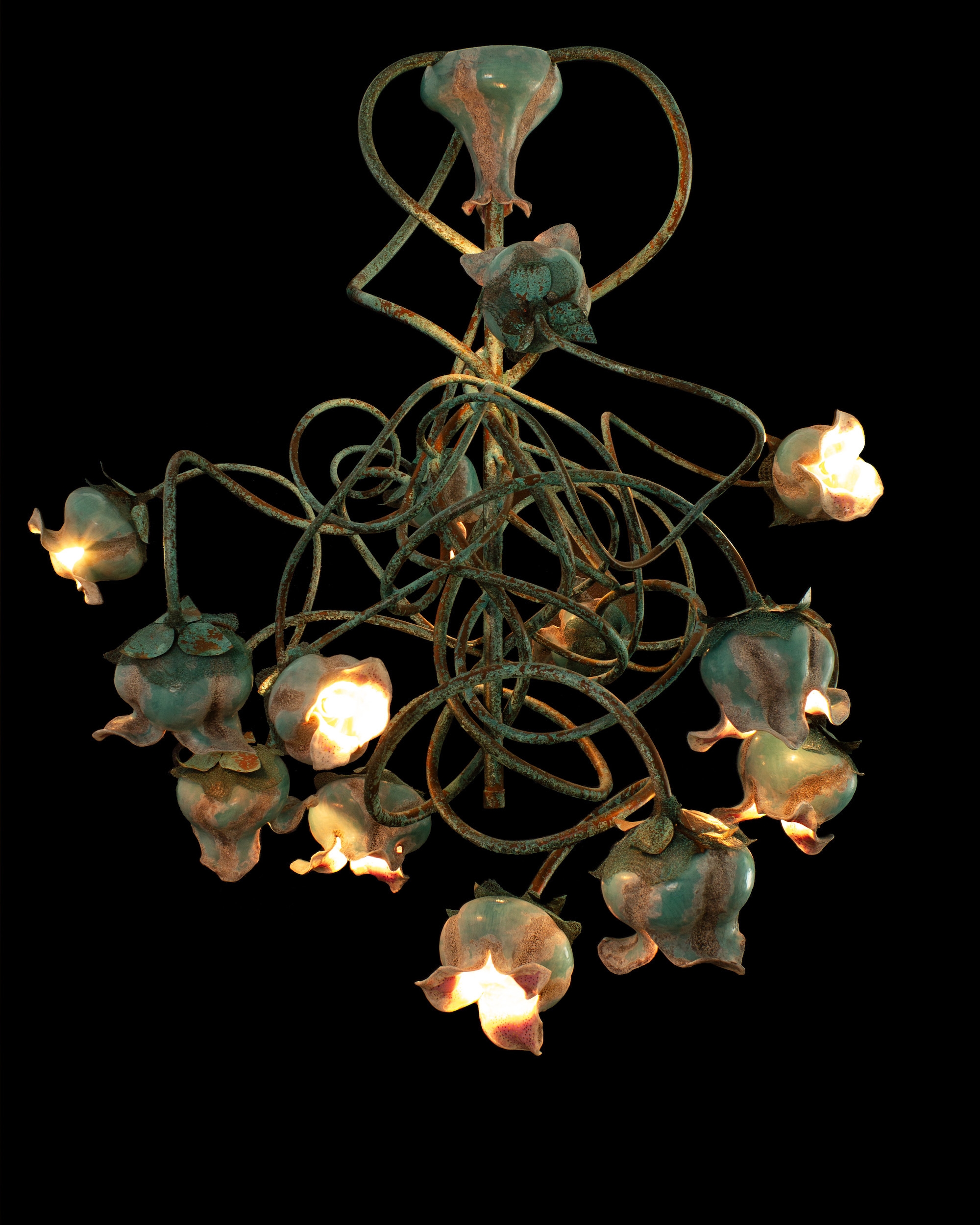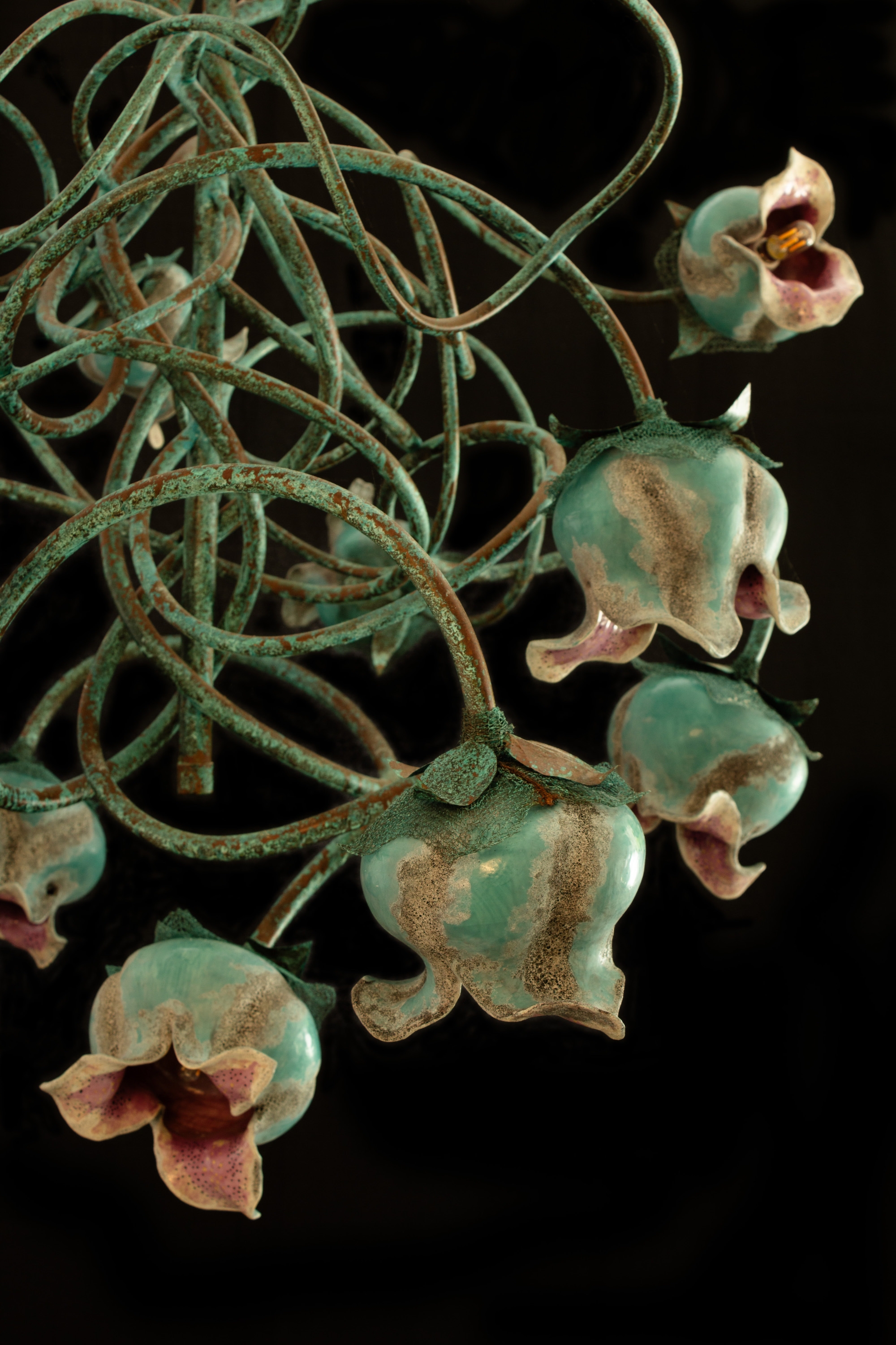 This chandelier is constructed from copper and porcelain, combining metalwork and ceramic craftsmanship. The main body is fabricated from copper tubing that has been precision-welded, then treated to develop a natural blue-green patina through controlled copper oxidation. The light shades are produced from porcelain and finished with a combination of five distinct ceramic glazes, carefully layered to achieve a textured surface and a visually dynamic, multicolored appearance.