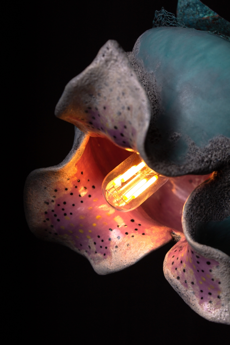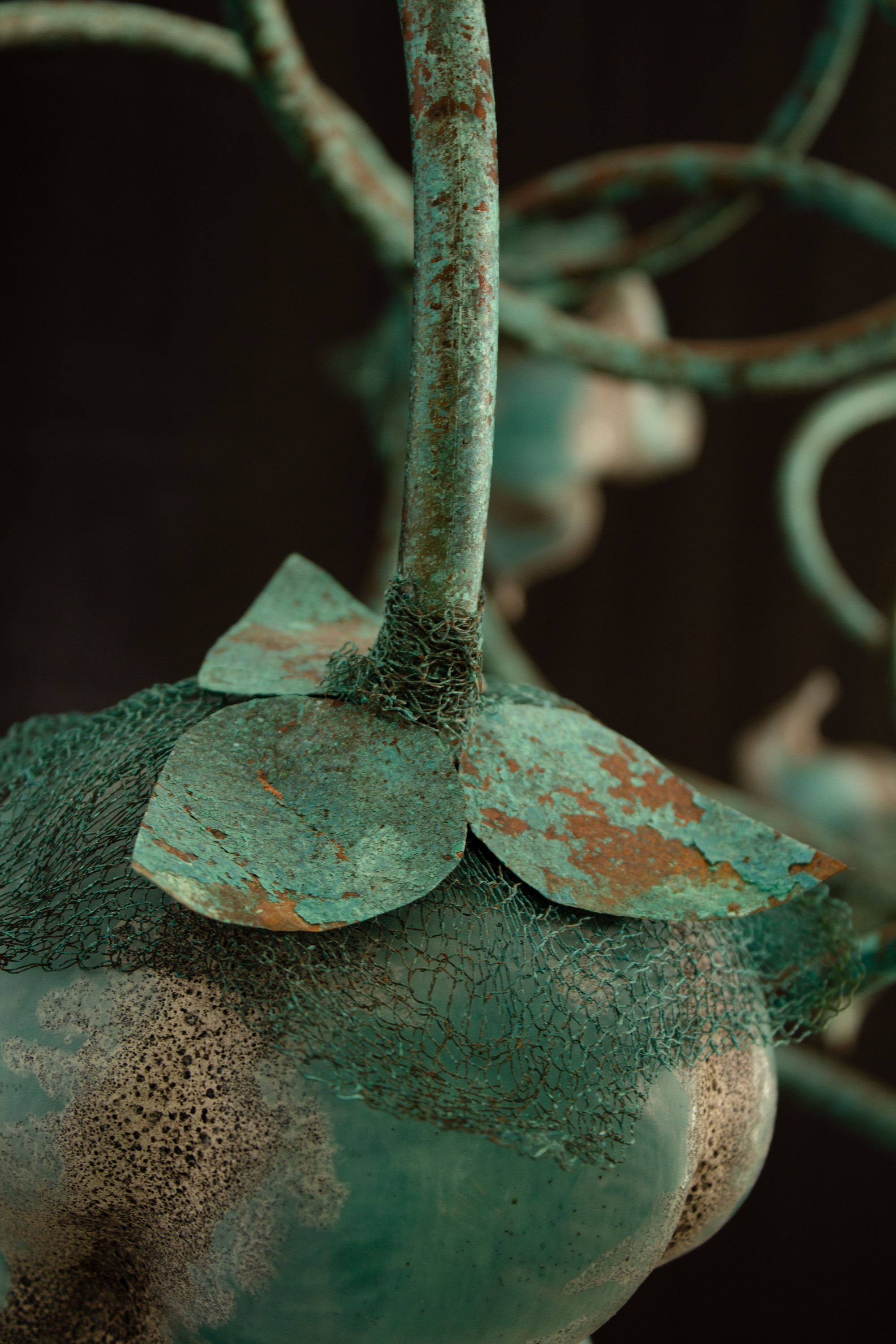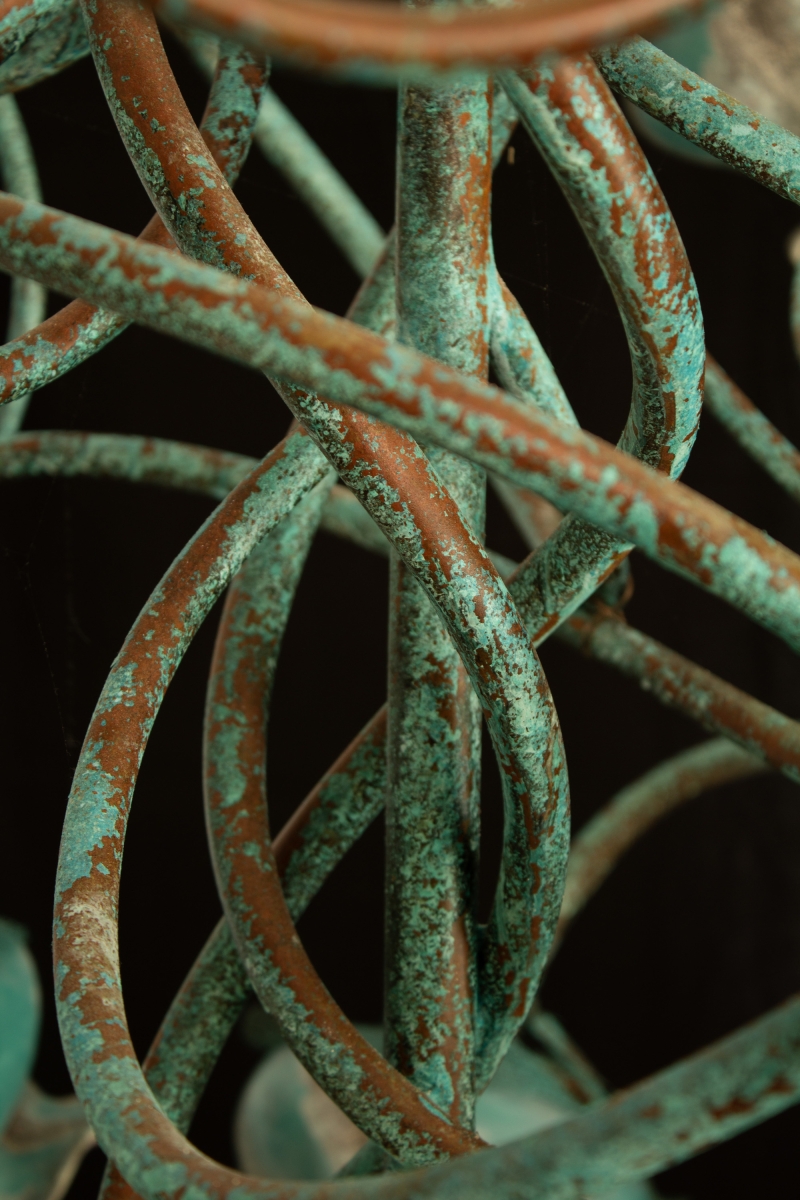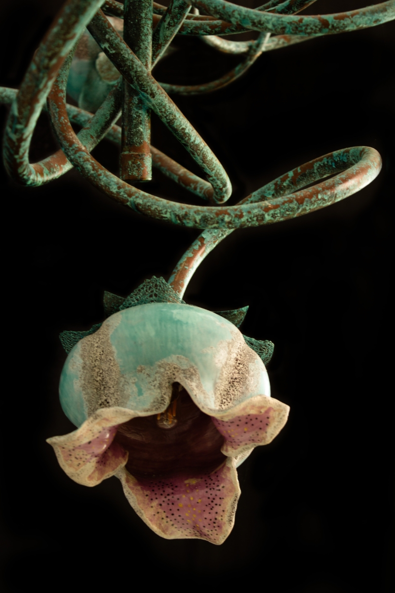 This chandelier is constructed from copper and porcelain, combining metalwork and ceramic craftsmanship. The main body is fabricated from copper tubing that has been precision-welded, then treated to develop a natural blue-green patina through controlled copper oxidation. The light shades are produced from porcelain and finished with a combination of five distinct ceramic glazes, carefully layered to achieve a textured surface and a visually dynamic, multicolored appearance.
