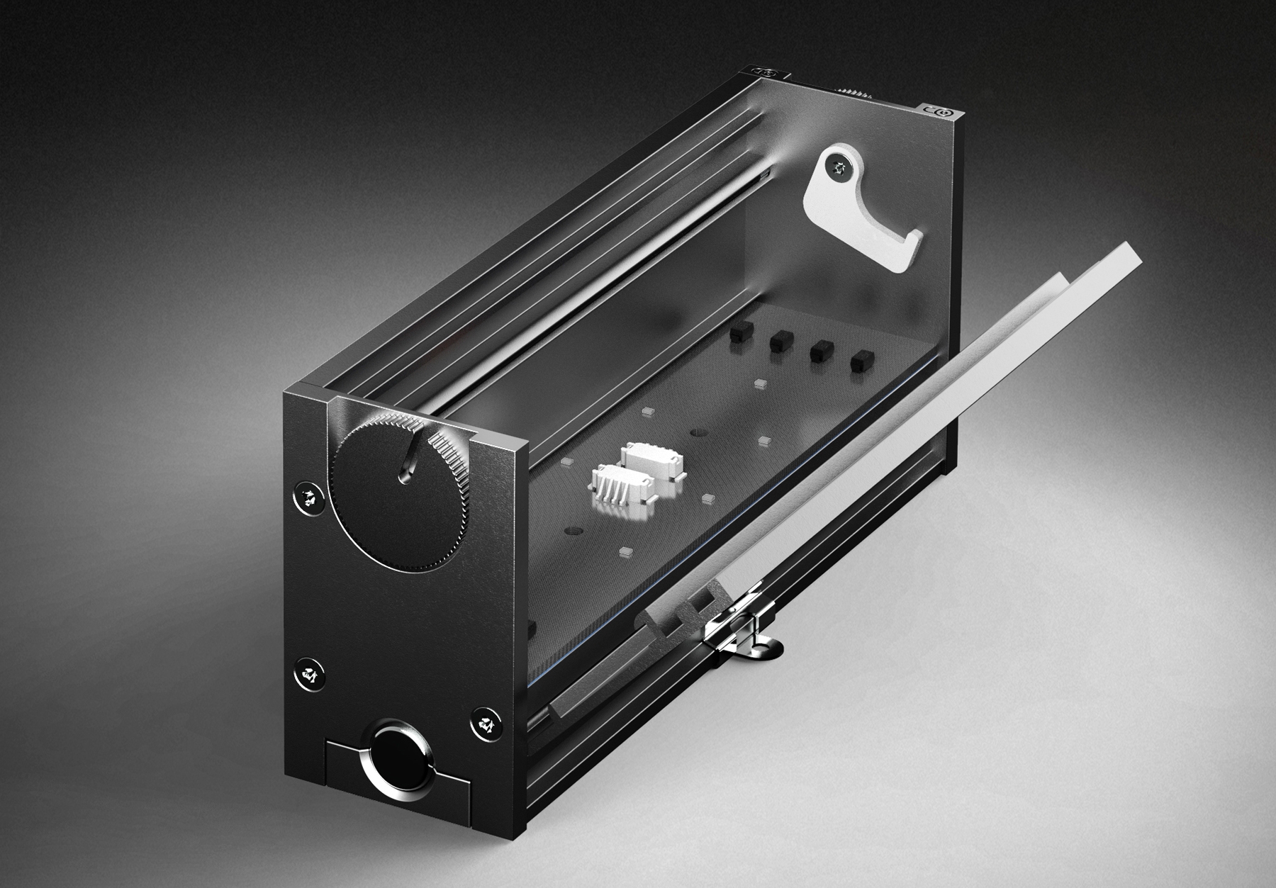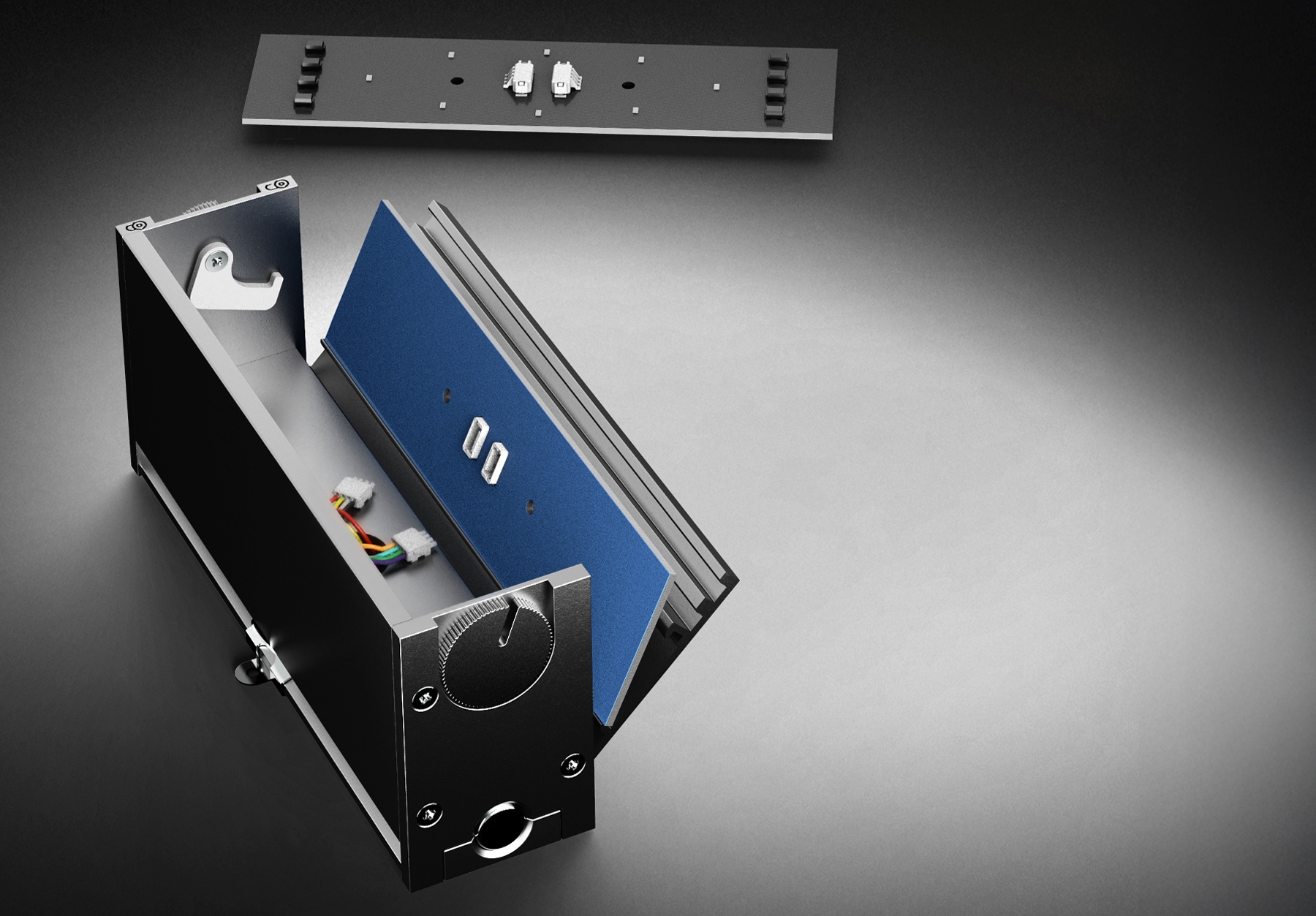 Once the side panel is released by the locks and hinged open, the light engines can be easily accessed and unplugged from the wiring loom. New light engines can then be connected, pushed into position, and the hinged panel closed and locked.