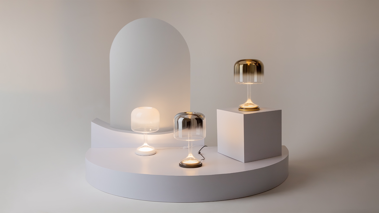 The stylized silhouette of the classic table lamp resembles a magic ball or cast. Thanks to the lighting calculations of the light flux and the diffusing angle of the glass, the light flux from below makes the ceiling luminous. It is coated with gradient staining. And at the bottom of the lamp with help. Re-reflected light is created by oriol. The lamp feels airy and fantastic thanks to modern LED technology. And reminds of the magic of the past.
