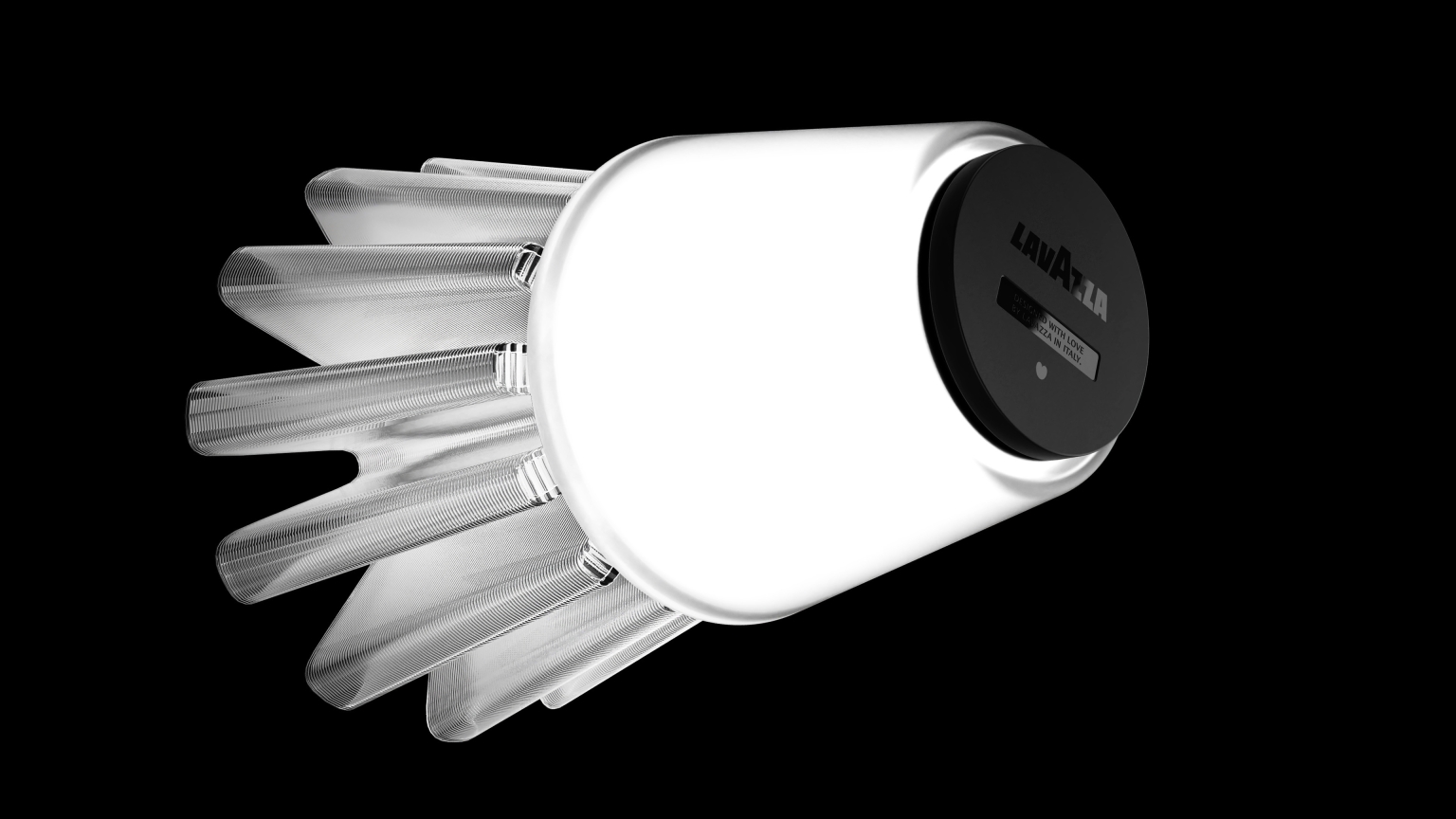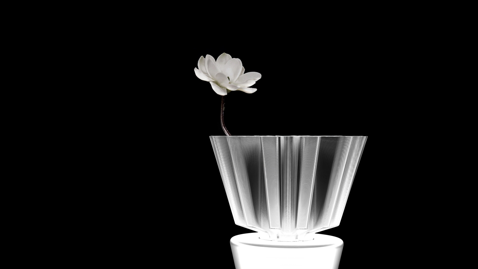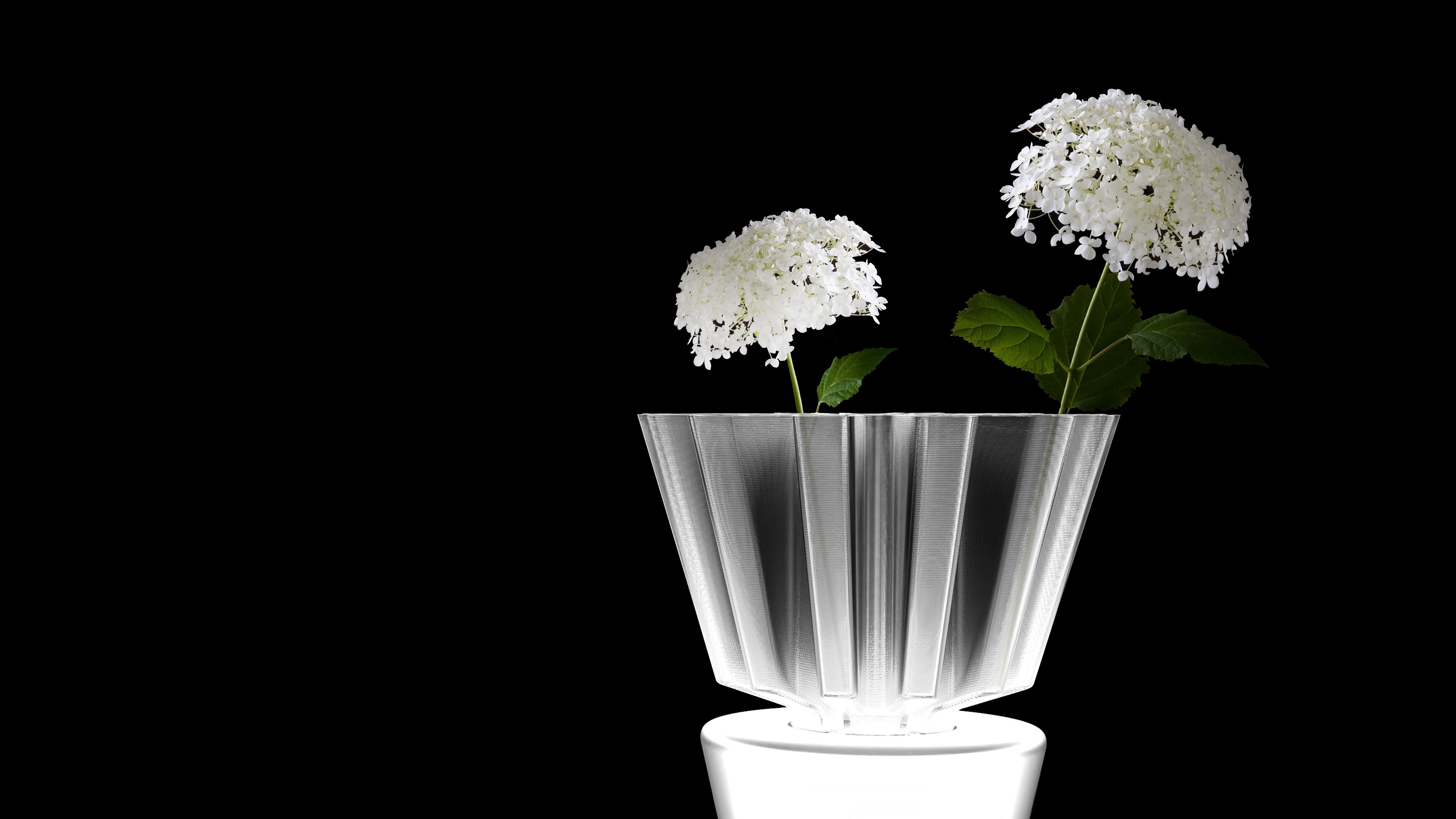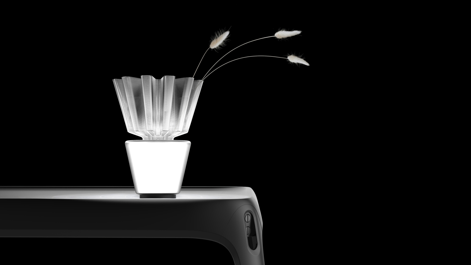 Designed with love in Italy, the lamp is composed of three main components: The base, crafted from post-consumer recycled plastic, houses the LED light source. The main body, translucent with a frosted finish, illuminates and enhances the upper crown element. This crown, the actual vase, is made from 3D printed glass. Every single layer of glass reflects the light individually, creating visual structure and a special sparkle.