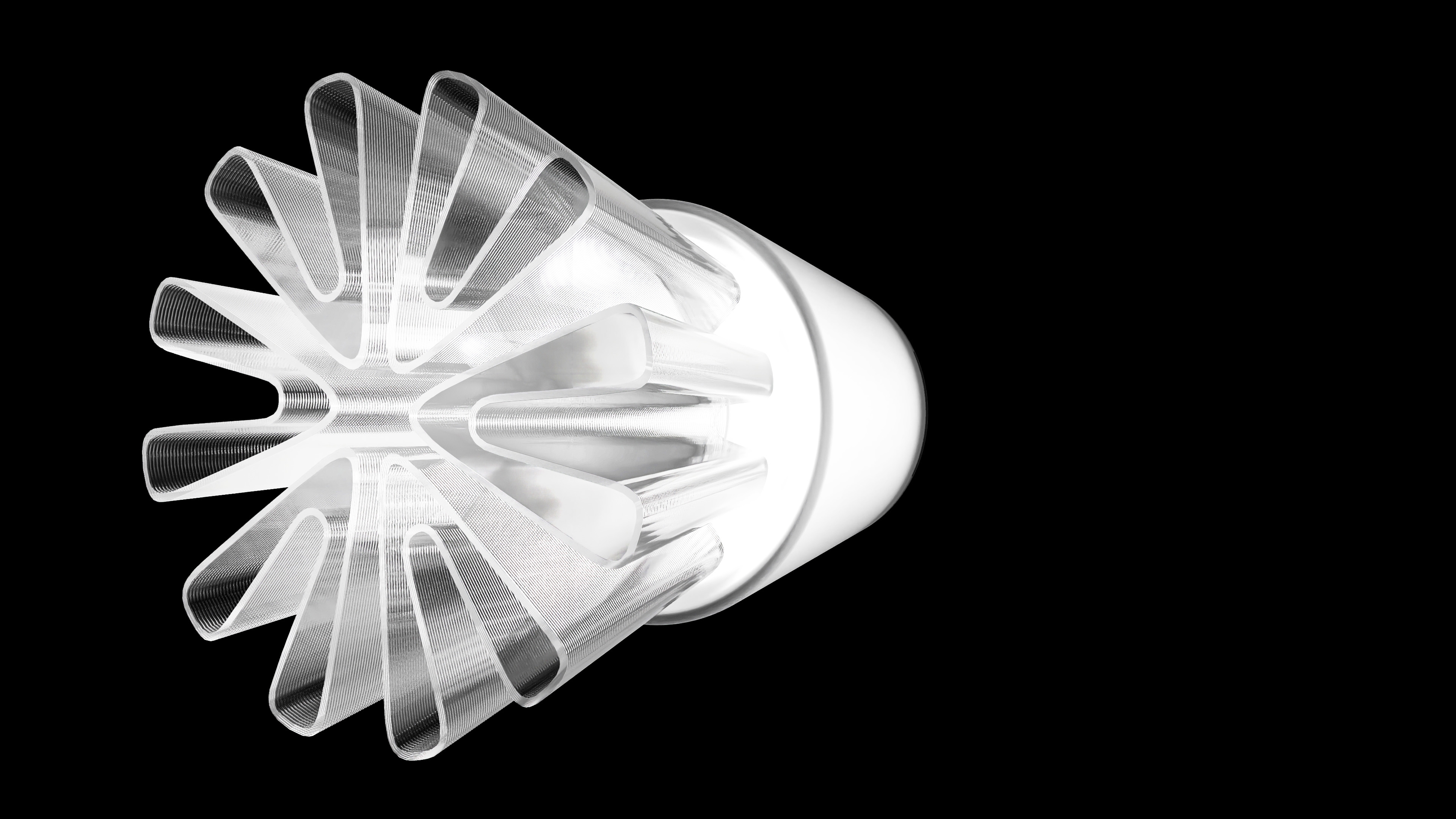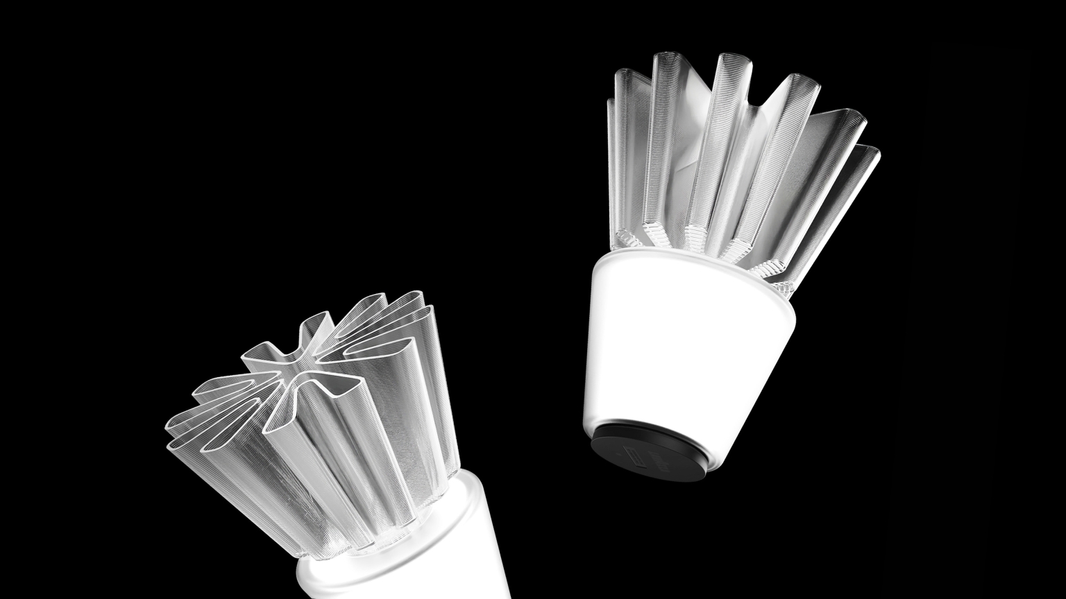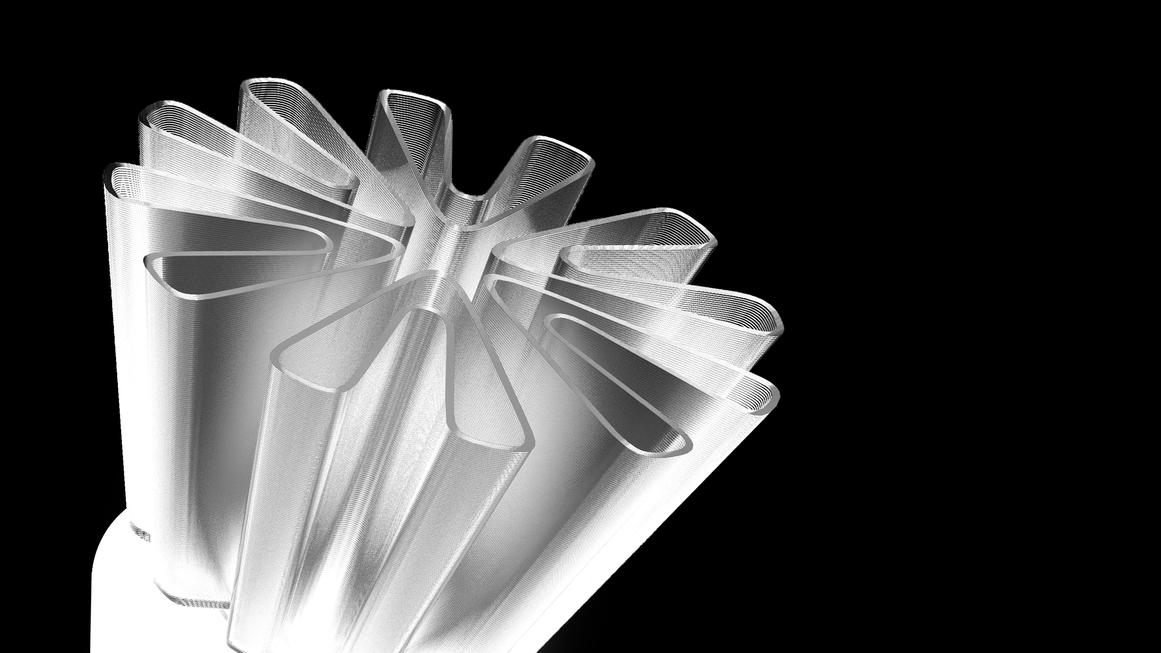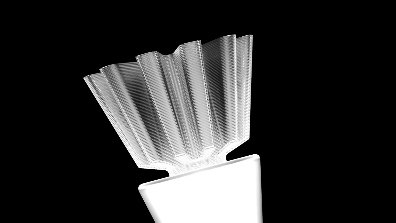 Designed with love in Italy, the lamp is composed of three main components: The base, crafted from post-consumer recycled plastic, houses the LED light source. The main body, translucent with a frosted finish, illuminates and enhances the upper crown element. This crown, the actual vase, is made from 3D printed glass. Every single layer of glass reflects the light individually, creating visual structure and a special sparkle.