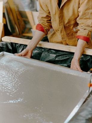 Responding to client concerns around book waste, the design transforms surplus into spectacle. Inspired by the Japanese papermaking technique of Nagashi-zuki, custom pulp baths and frames were constructed, enabling the fabrication of large-format handmade paper panels. Each sheet bears the unique textures, tones and translucency of its origins—turning waste into a material of beauty. Every panel is therefore a one-off artwork, celebrating craft, unpredictability and the tactile presence of the medium.