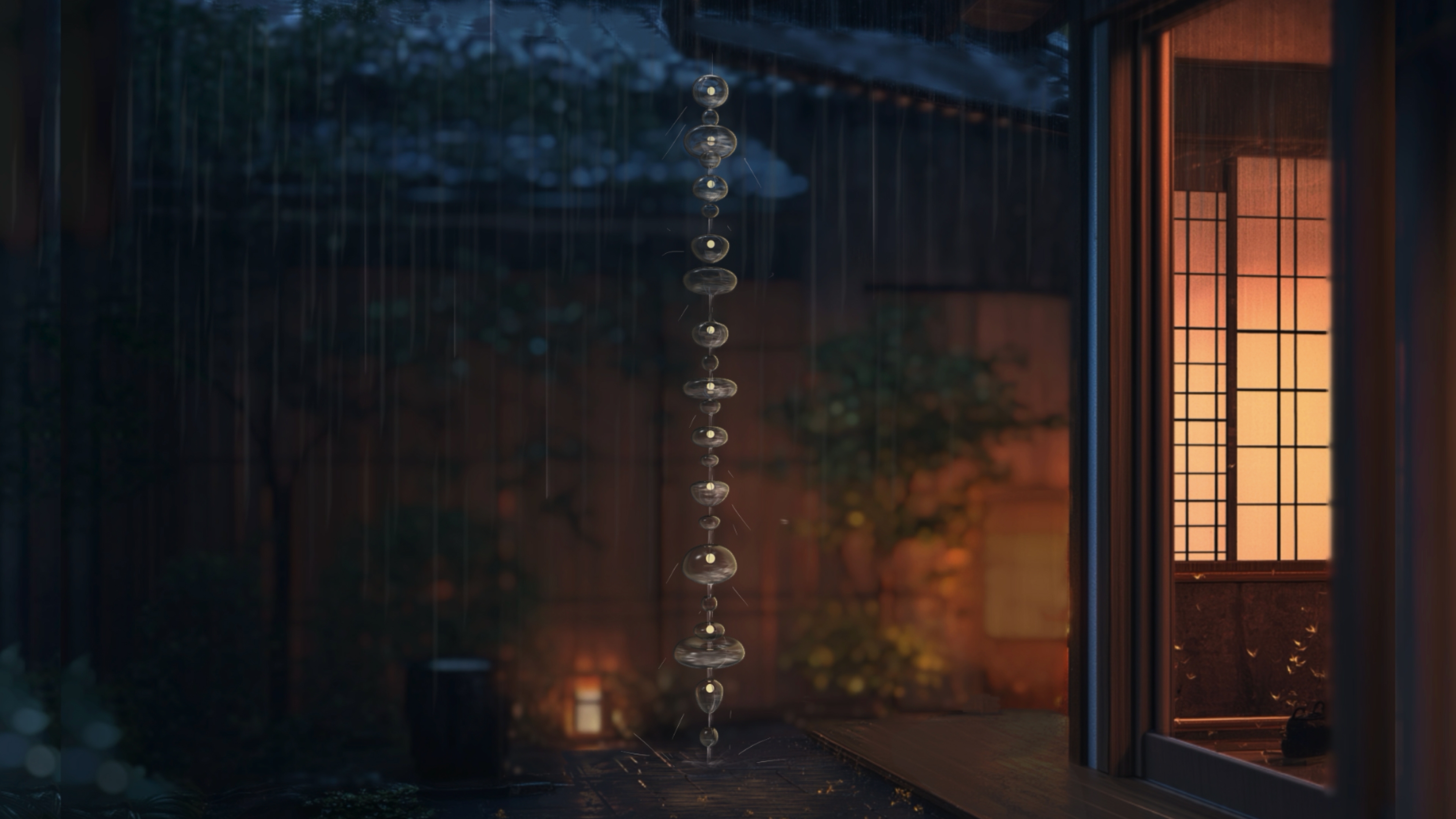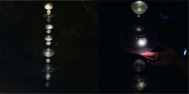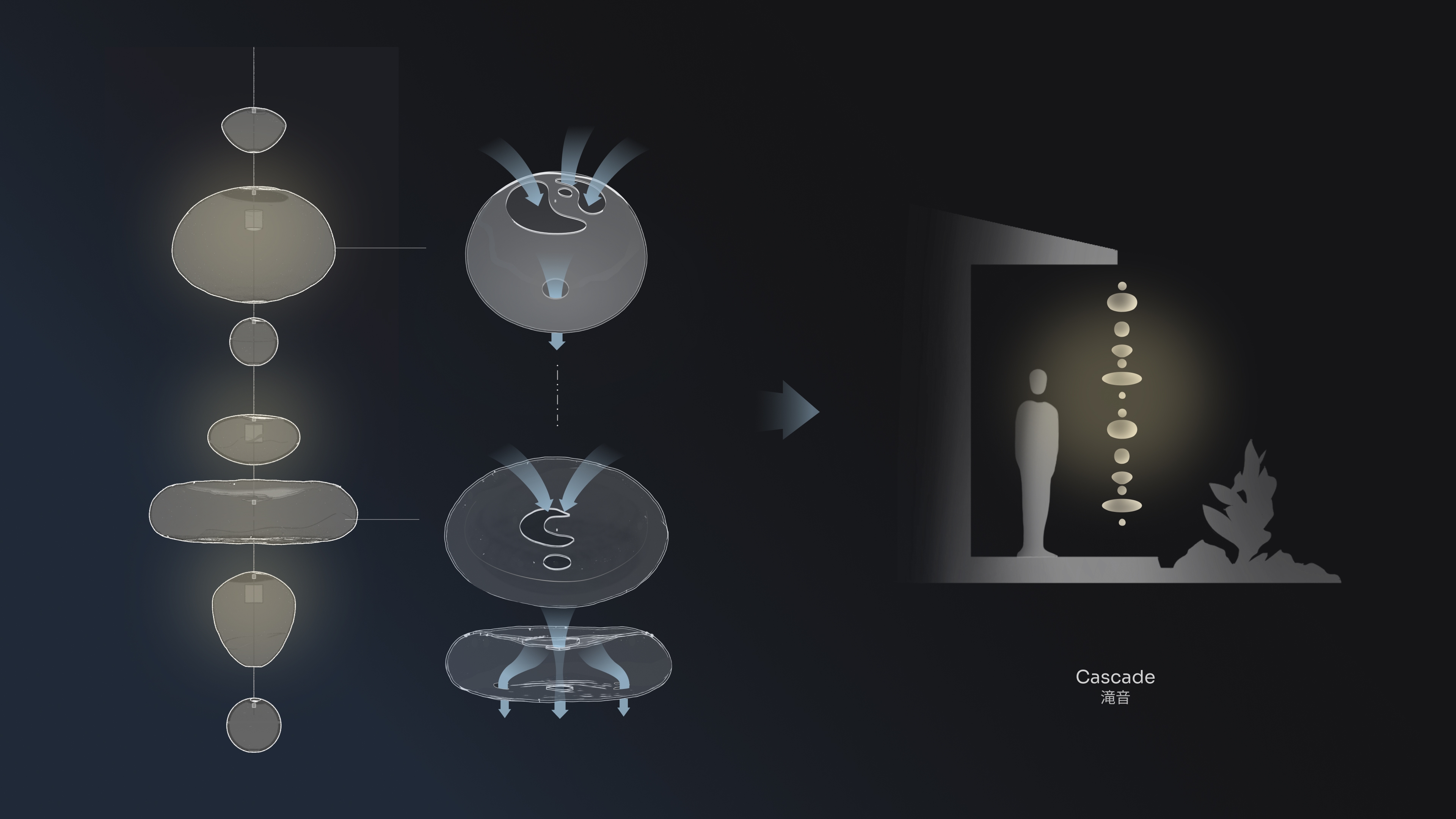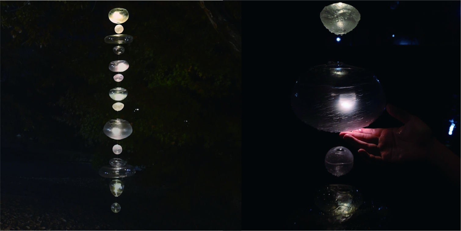 Entry DescriptionDrawing inspiration from Japanese traditions of rain chains and burning incense, we designed two light installations that embody a pair of opposing motions: water cascading downward, and smoke drifting upward. Cascade is an illuminated rain chain that guides water to bring an ethereal spark to peaceful rainy nights. Hand-blown glass shells are installed along a string with solar-powered LED units. The rain chain creates a pleasing sound as raindrops hit the glass surface and flow down each cup gracefully, interacting with the glow emanating from within.
