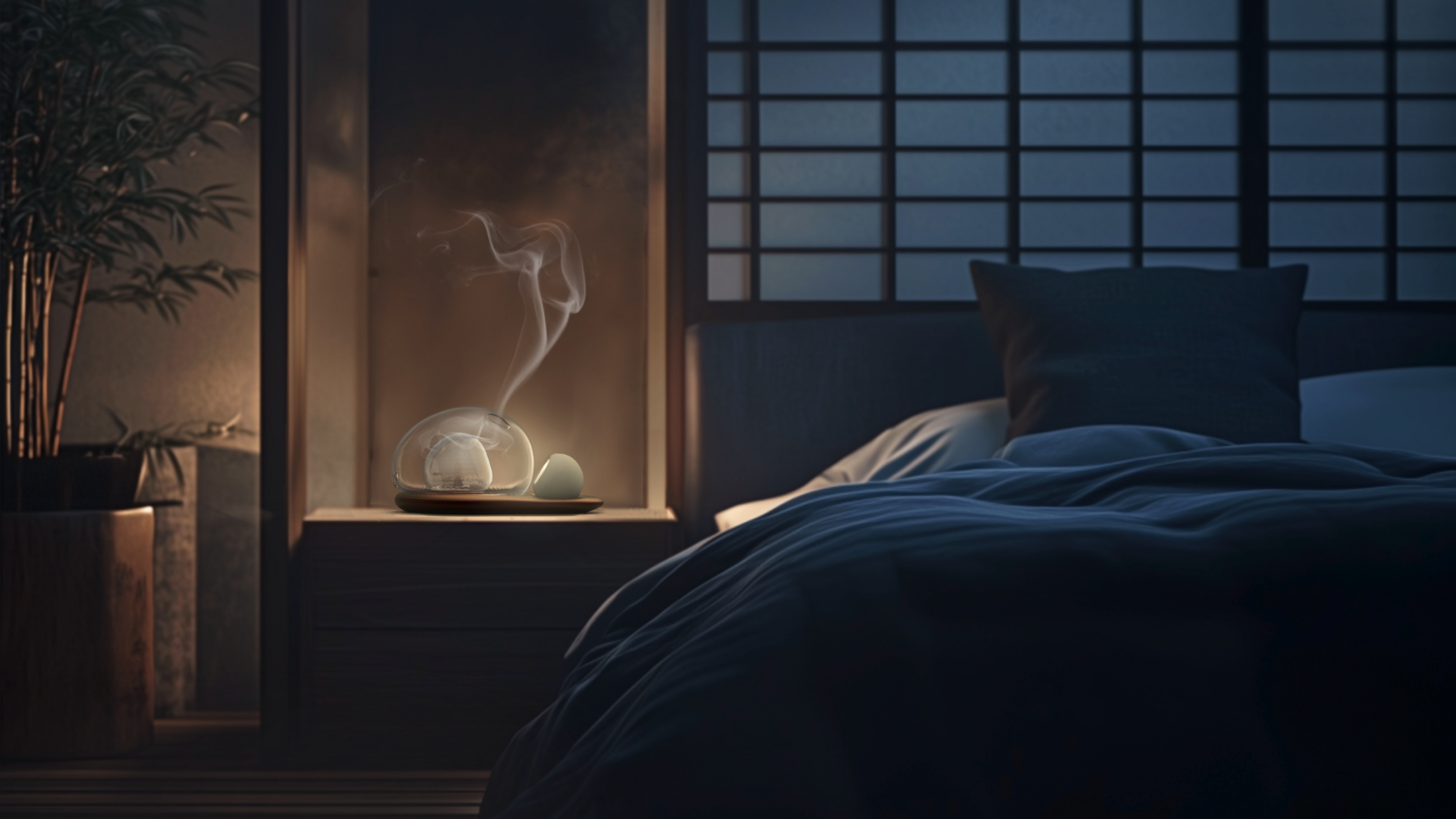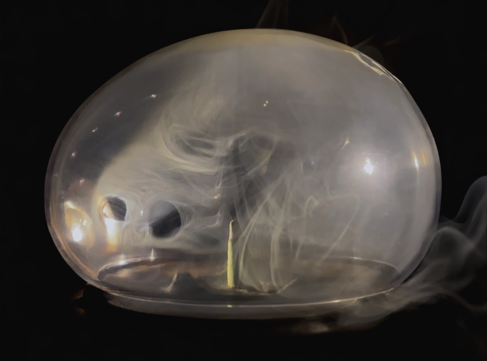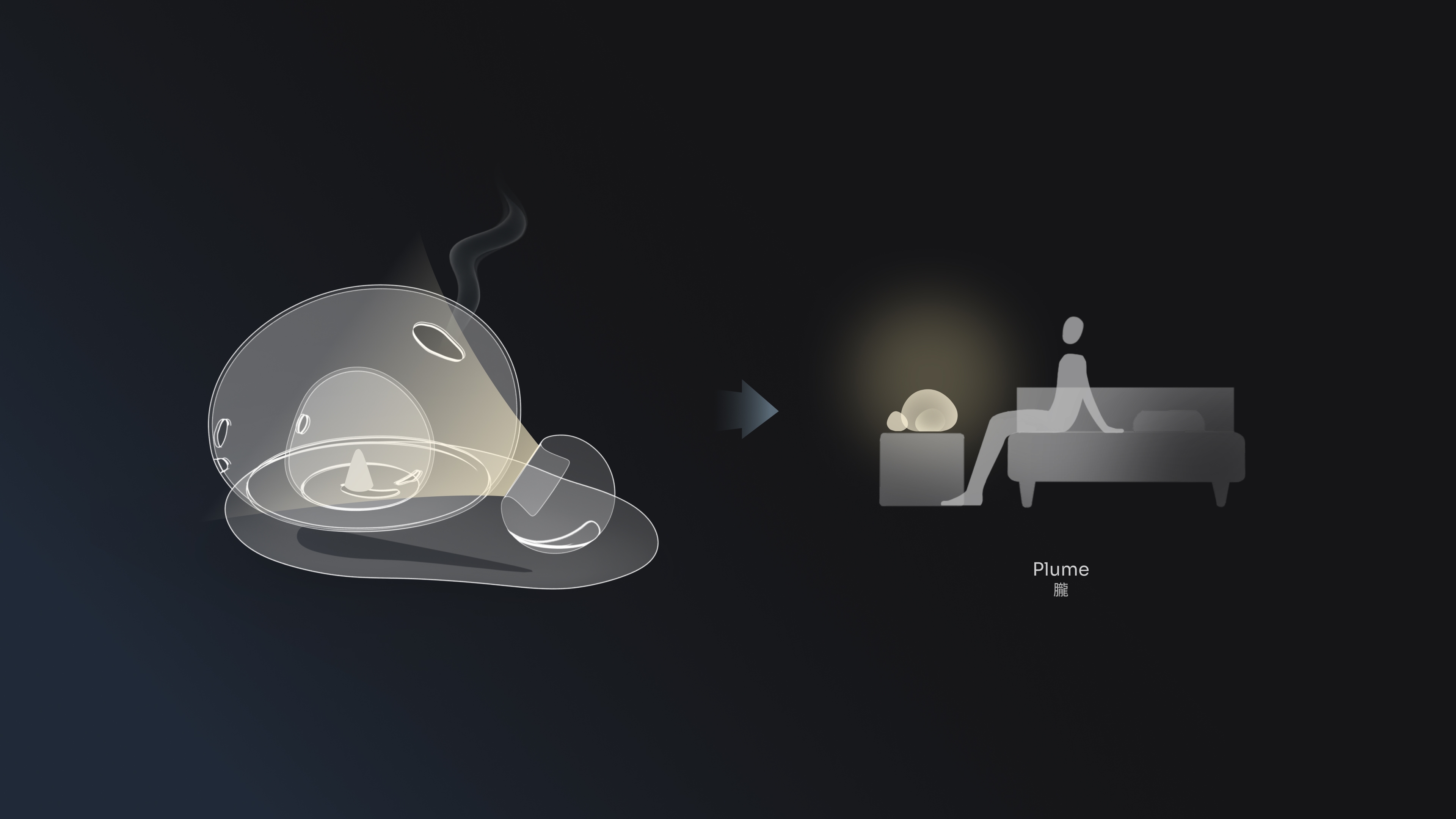 The other piece, Plume, holds a incense cone inside two glass shells. When lit, the illuminated smoke gently seeps through the openings of the inner shell and becomes suspended within the outer shell, creating a drifting motion. The wisps of smoke dance softly in the light before gradually escaping, leaving behind a lingering scent of incense.