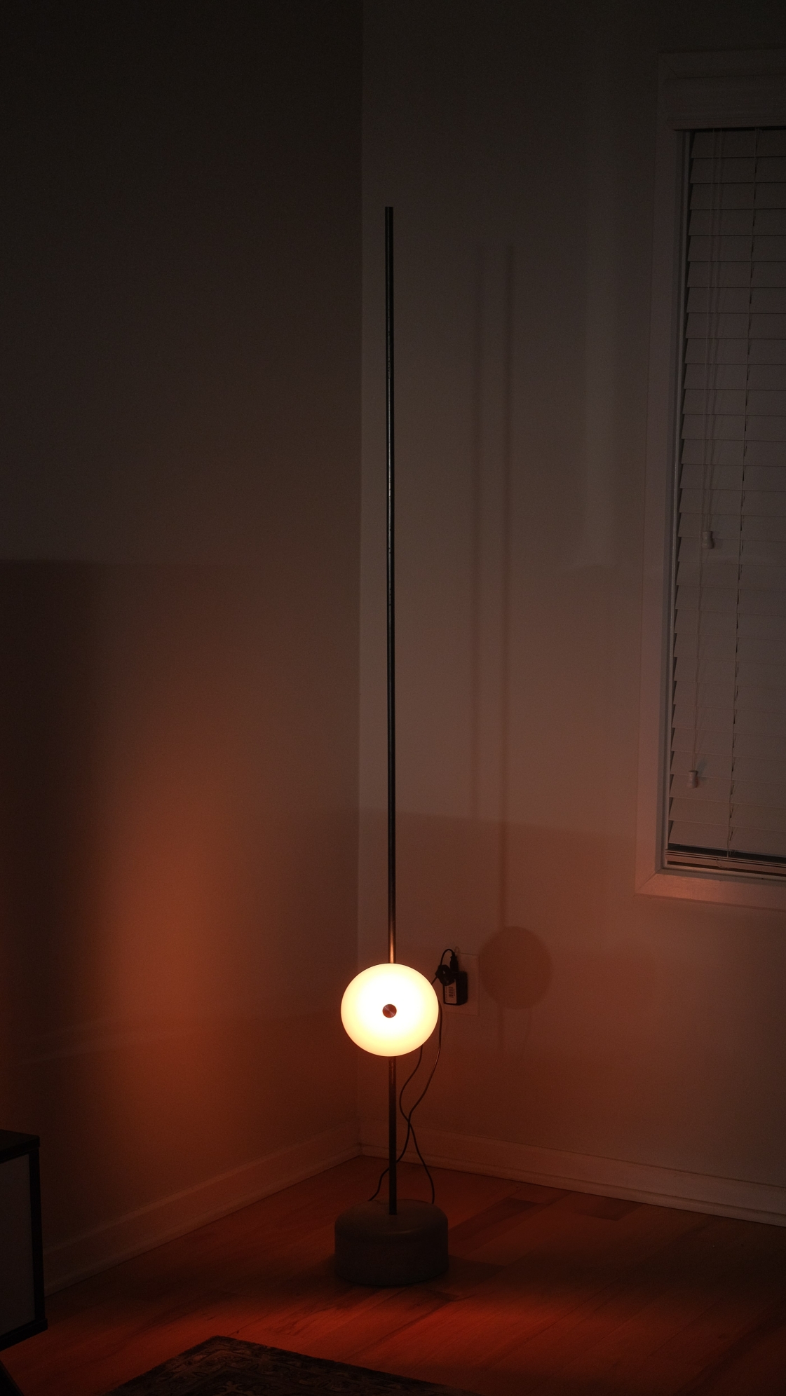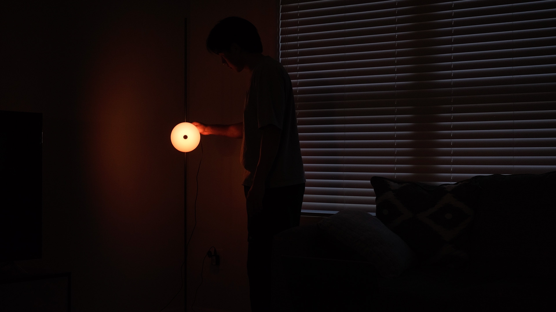 Bask is an ambient lamp that captures the essence of a sunset through both hue and motion. As the lamp is lowered it dims and shifts to deeper, warmer tones; raising it restores brightness and cooler hues. Designed to emulate the sun’s descent, the lamp shapes the atmosphere to match its user’s mood.