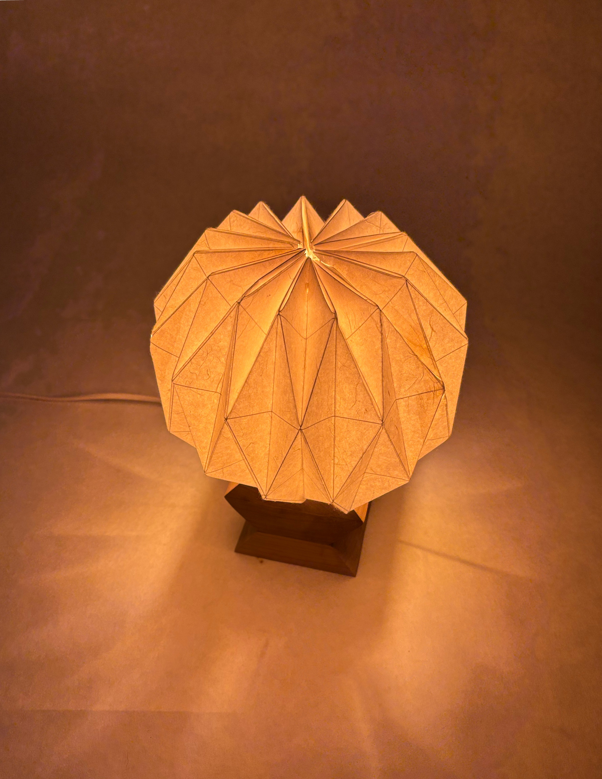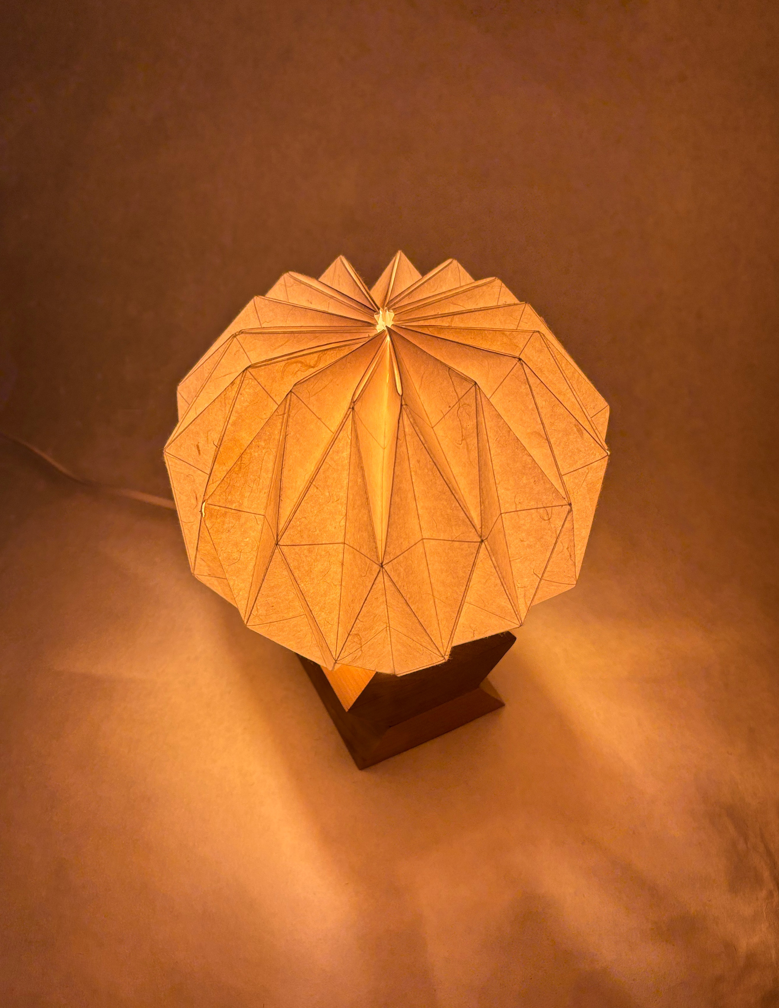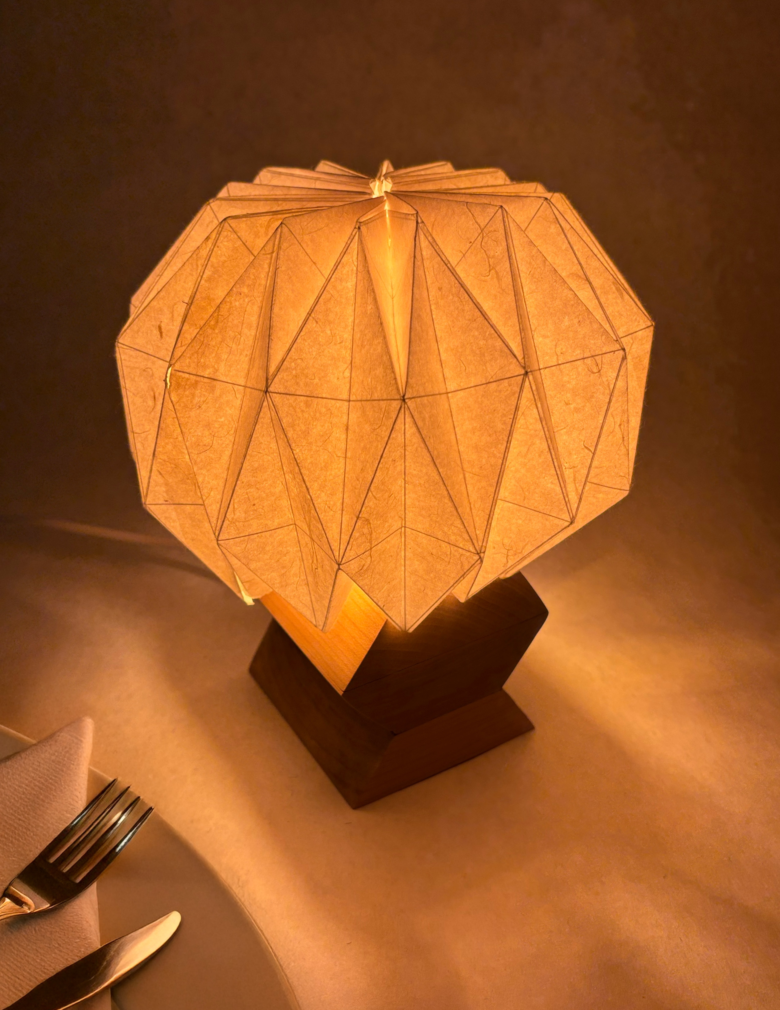 Entry DescriptionUrchin is a thoughtfully designed table lamp that brings a cozy, intimate ambiance to upscale dining environments. Made from sustainable materials, it emits a warm, inviting glow that enhances the atmosphere of romantic dinners and elevated dining experiences. The design draws inspiration from geometric forms, with a diamond motif repeated in both the wooden base and the washi paper shade to create a sense of balance and visual harmony. When lit, the lamp casts a subtle, star-like pattern onto the table, adding an extra layer of warmth and visual interest to the dining experience.