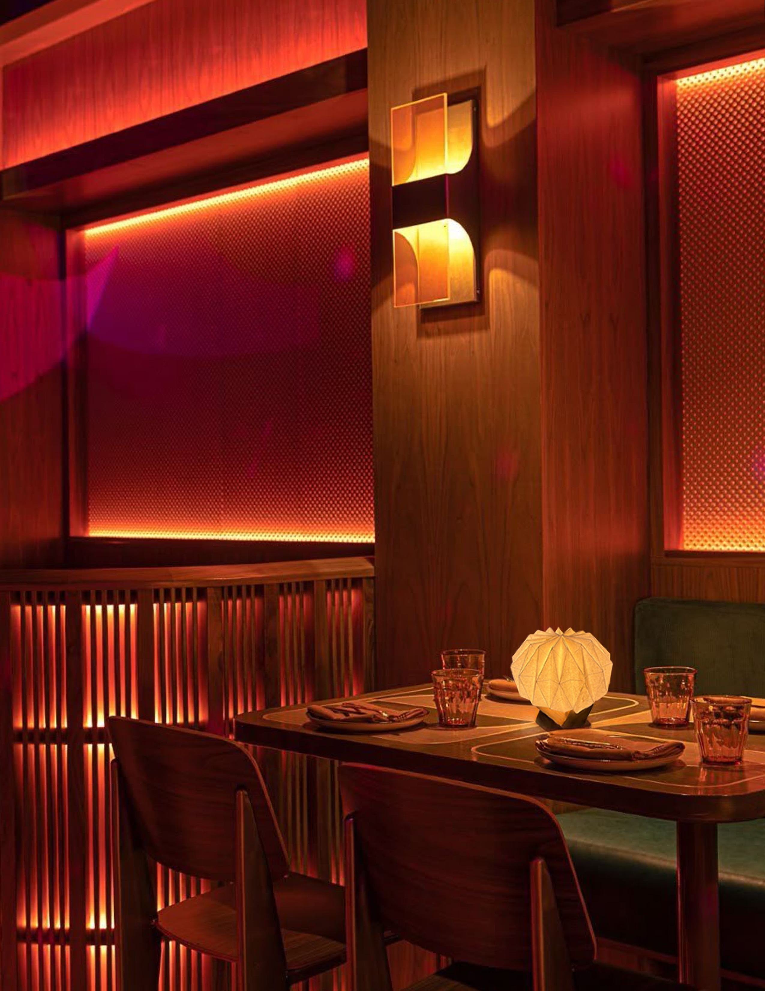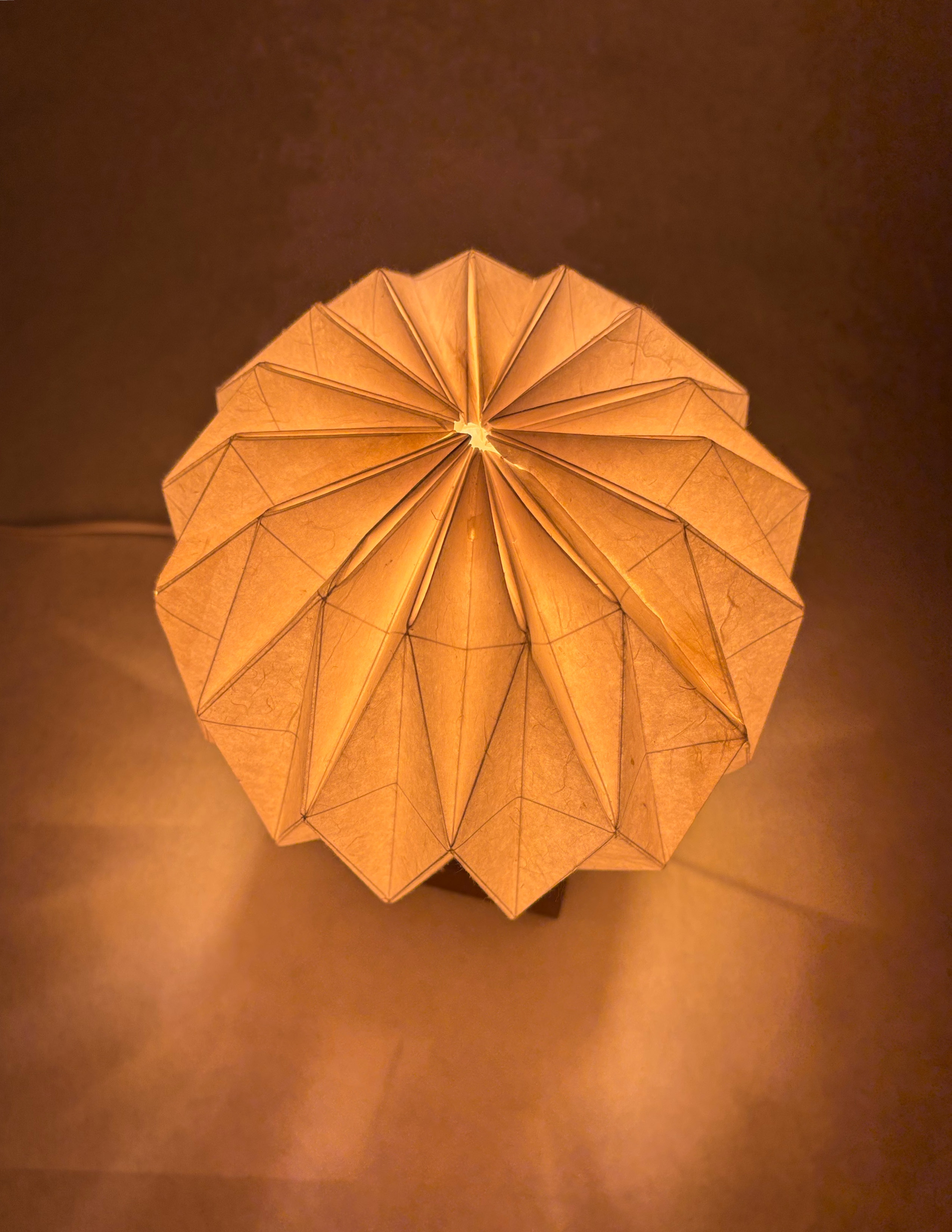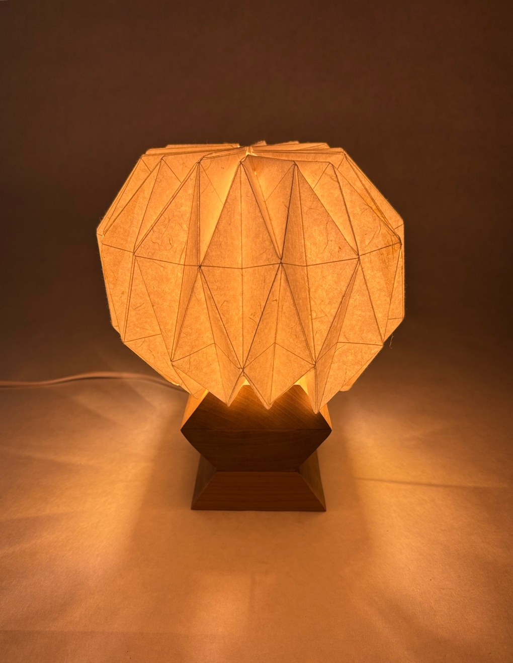 Entry DescriptionUrchin is a thoughtfully designed table lamp that brings a cozy, intimate ambiance to upscale dining environments. Made from sustainable materials, it emits a warm, inviting glow that enhances the atmosphere of romantic dinners and elevated dining experiences. The design draws inspiration from geometric forms, with a diamond motif repeated in both the wooden base and the washi paper shade to create a sense of balance and visual harmony. When lit, the lamp casts a subtle, star-like pattern onto the table, adding an extra layer of warmth and visual interest to the dining experience.