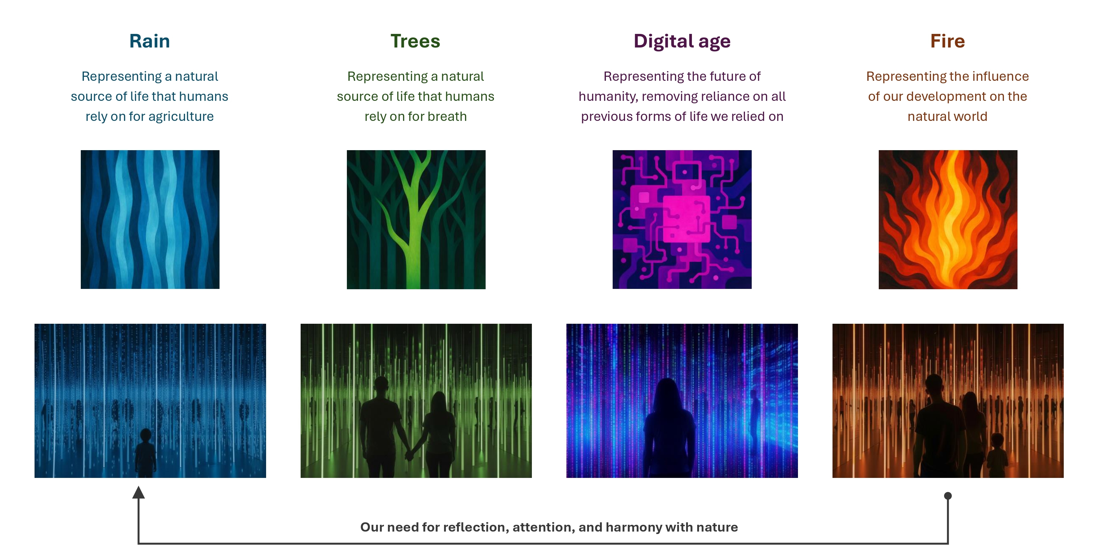 In the final act, the calm dissolves into fire, recalling the chaos and destruction caused by human hands. Yet as the rain returns and light softens, nature reclaims the space. The cycle begins anew, reminding us that humanity is not separate from its reflections, but forever shaped by them — a prismatic self being within an ever-changing world.